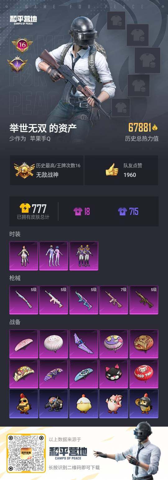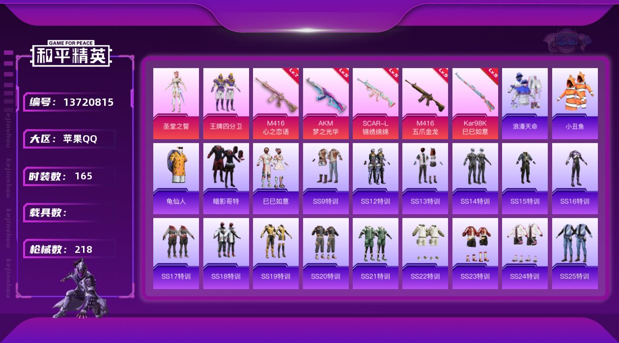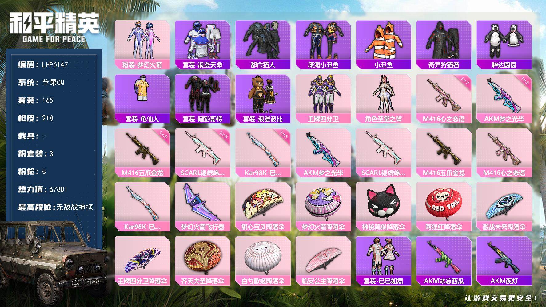 [13720815]可二次【店主推荐捡漏号!可直接换绑】/素材身法号/无敌战神框1 苹果 手Q-无敌战神框-3粉装-5特效枪-1粉色飞行器-6.7w热力值-16王牌印记-165套装-218枪皮【热门品类】:粉装-梦幻火箭,套装-浪漫天命,套装-都市猎人,套装-深海小丑鱼,套装-小丑鱼,套装-奇异狩猎者,套装-胖达圆圆,套装-龟仙人,套装-暗影哥特,套装-浪漫波比【粉色套装】:粉装-梦幻火箭,粉装-王牌四分卫,角色-圣堂之誓【粉色枪皮等级】:AKM-梦之光华(五级),SCAR-L-锦绣绵绵(五级),M416-五爪金龙(五级),M416-心之恋语(七级),Kar98K-巳巳如意(五级)【粉色飞行器】:梦幻火箭飞行器