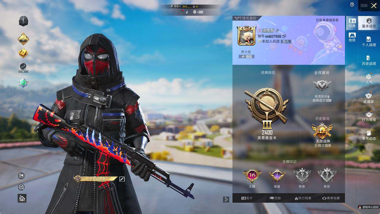 - PX_2077818- 安卓手Q-8王牌印记-5粉装-4特效枪-1载具-54301热力值-130套装-167枪皮-2卓越印记-1传奇印记 【5粉装】,冷漠罗丽,冰炎战车,紫钛骑兵,射星猎手,莲影清波 【4特效枪】AKM-盖世英雄-9级 SCAR-L-锦绣绵绵-5级 M416-电玩时刻-5级 Kar98K-巳巳如意-5级 【1稀有紫装】,奇异狩猎者, 【1稀有载具】,宾利飞驰(布罗德盖棕双色),