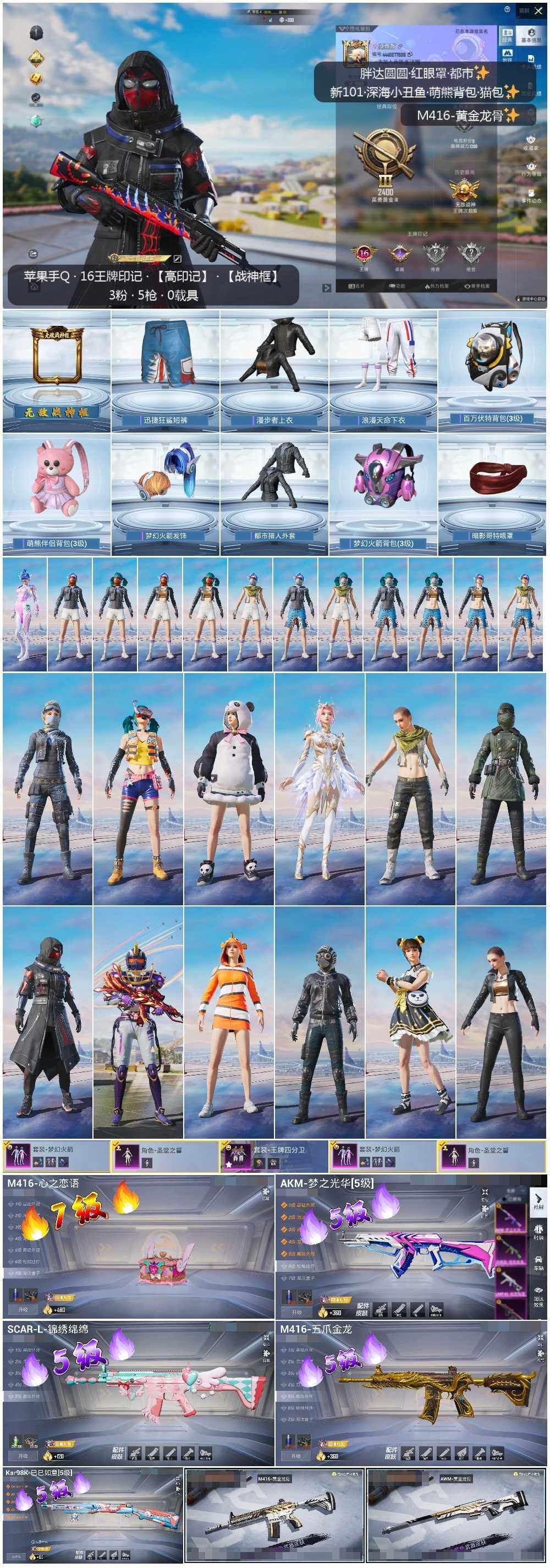 - [12621498]【特价急出/详情看图】:苹果 手Q-1神装-6粉装-4特效枪-1载具-3粉色飞行器-1.5w热力值-1王牌印记-27套装-40枪皮【红色神装等级】:魔童闹海-敖丙(一级)【热门品类】:套装-小丑鱼【粉色载具】:冰绡玉鳞【粉色套装】:粉装-甜心巧克力,粉装-宝贝奶油派,粉装-天使彩虹糖,角色-白勺歌姬,角色-小可学妹,角色-千金淑猫【粉色枪皮等级】:AKM-甜心宝贝(四级),Kar98K-巳巳如意(二级),DP-28-千金淑猫(三级),DP-28-豹影疾电(五级)【粉色飞行器】:飞天猪飞行器,灵珠游龙飞行器