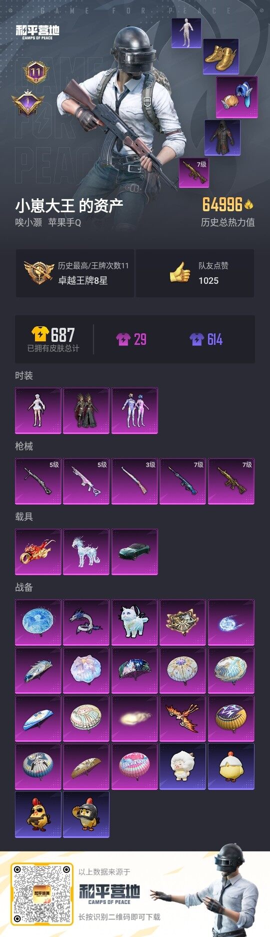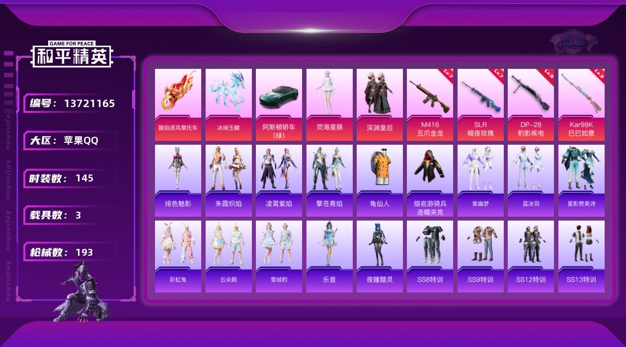 - PX_2094519- 苹果手Q-24王牌印记-7粉装-3特效枪-1载具-99117热力值-257套装-300枪皮-1卓越印记-0传奇印记 【7粉装】,雪国幻梦,梦幻火箭,古堡领主,海渊国主,王牌四分卫,显圣真君,创世·救赎 【3特效枪】M416-五爪金龙-7级 M762-激战未来-7级 Kar98K-巳巳如意-5级 【9稀有紫装】,奇异狩猎者,暗影哥特,深海小丑鱼,浪漫天命,雪山精英,迅捷狂鲨
