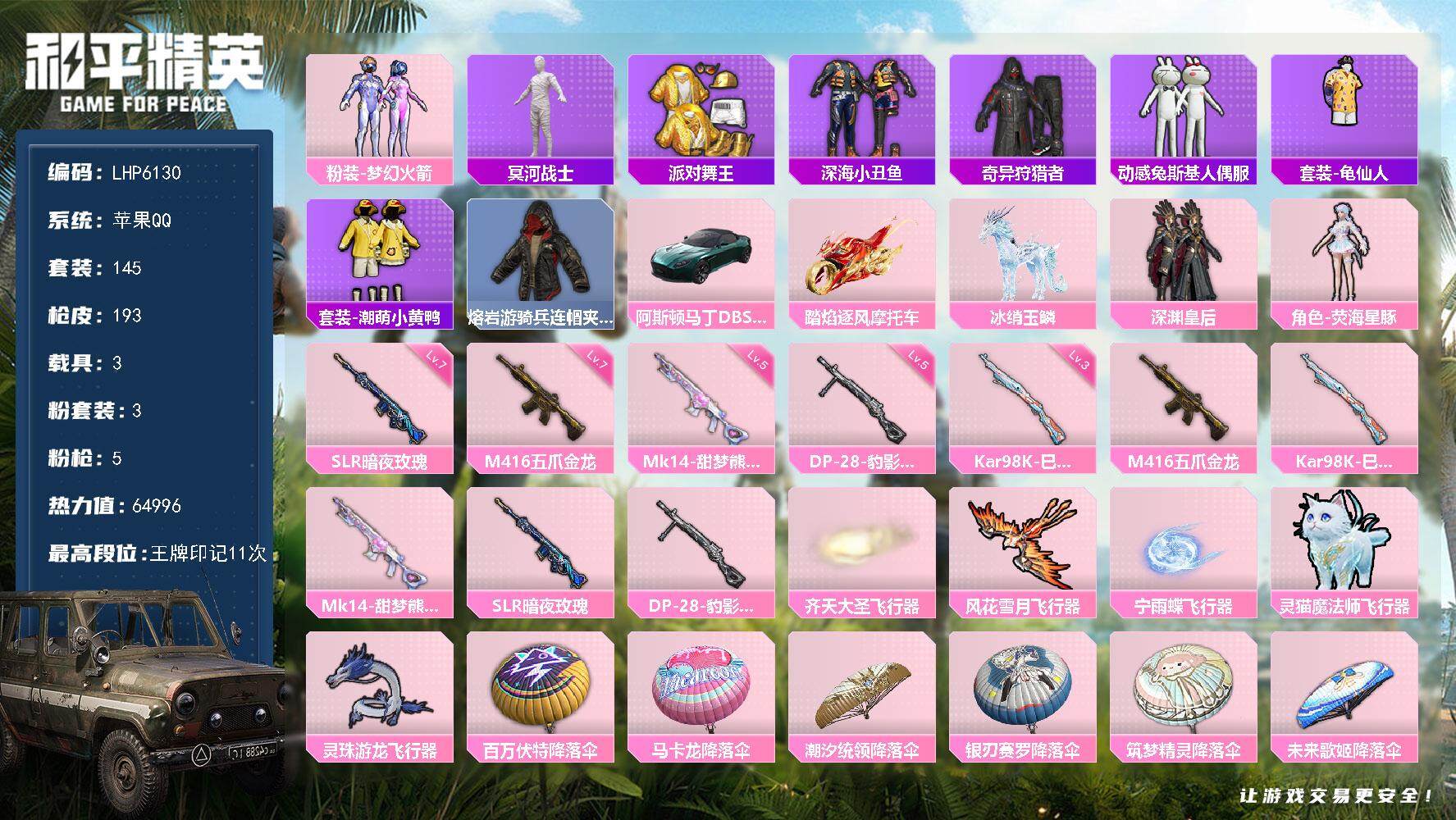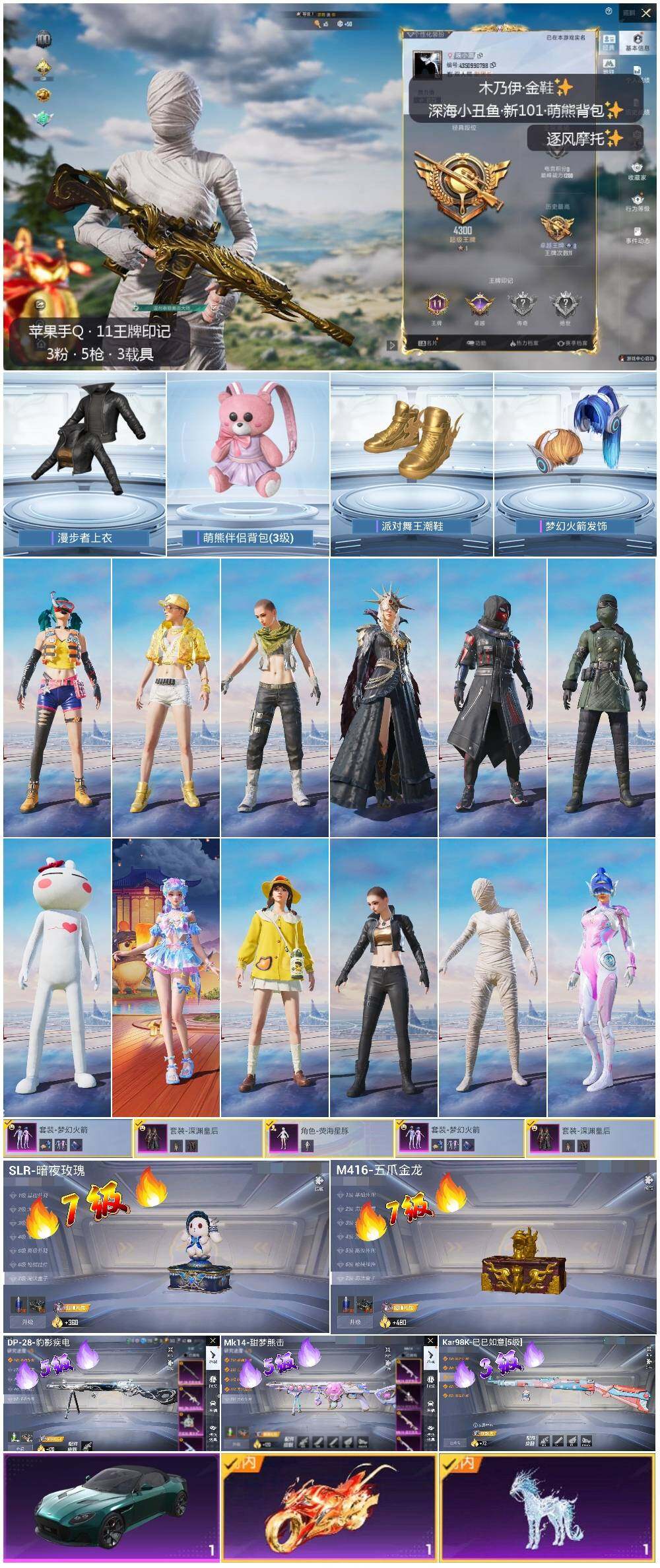 [13721165]【店主推荐捡漏号!可直接换绑】/素材身法号/老木乃伊/璀璨碎片1200/地铁满天赋 苹果 手Q-3粉装-5特效枪-3载具-5粉色飞行器-6.4w热力值-11王牌印记-145套装-193枪皮【热门品类】:粉装-梦幻火箭,套装-冥河战士,套装-派对舞王,套装-深海小丑鱼,套装-奇异狩猎者,套装-动感兔斯基人偶服,套装-龟仙人,套装-潮萌小黄鸭,熔岩游骑兵连帽夹克【粉色载具】:阿斯顿马丁DBS(绿),踏焰逐风摩托车,冰绡玉鳞【粉色套装】:粉装-深渊皇后,粉装-梦幻火箭,角色-荧海星豚【粉色枪皮等级】:M416-五爪金龙(七级),Kar98K-巳巳如意(三级),Mk14-甜梦熊击(五级),SLR-暗夜玫瑰(七级),DP-28-豹影疾电(五级)【粉色飞行器】:齐天大圣飞行器,风花雪月飞行器,宁雨蝶飞行器,灵猫魔法师飞行器,灵珠游龙飞行器