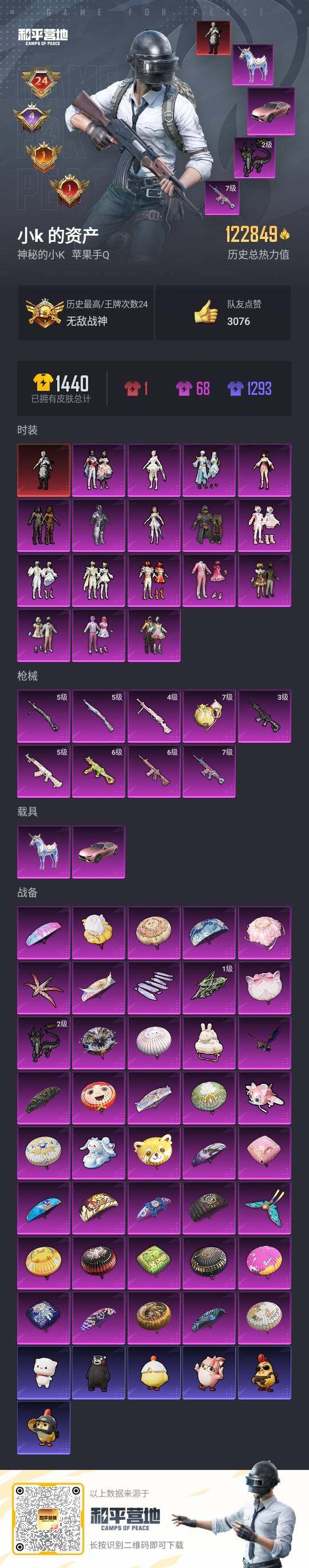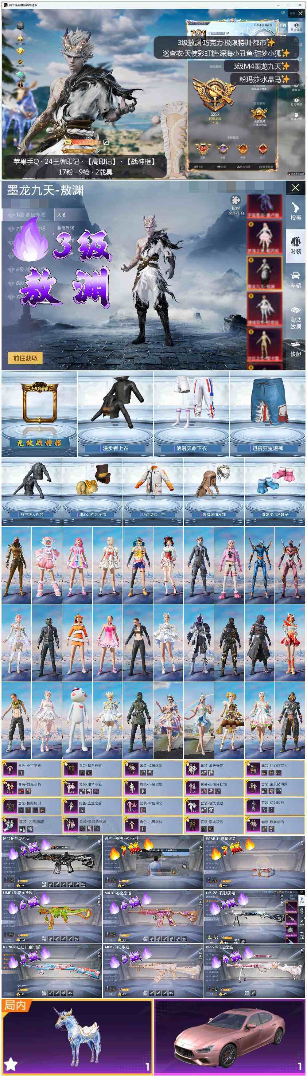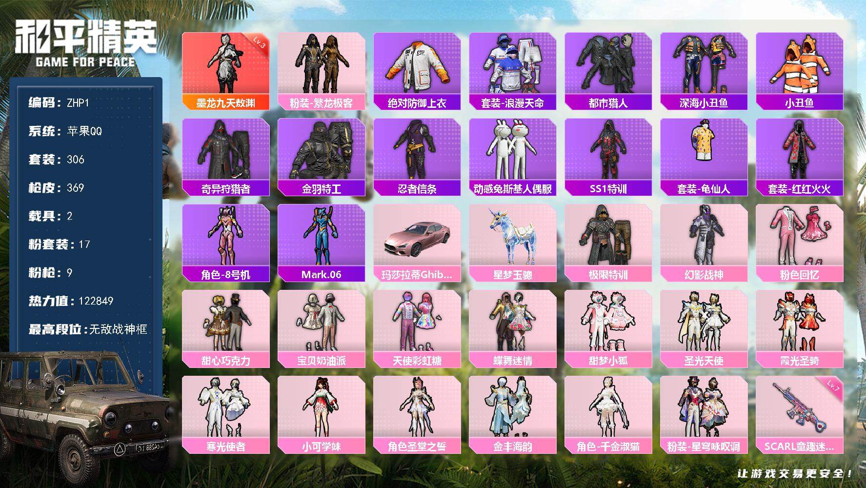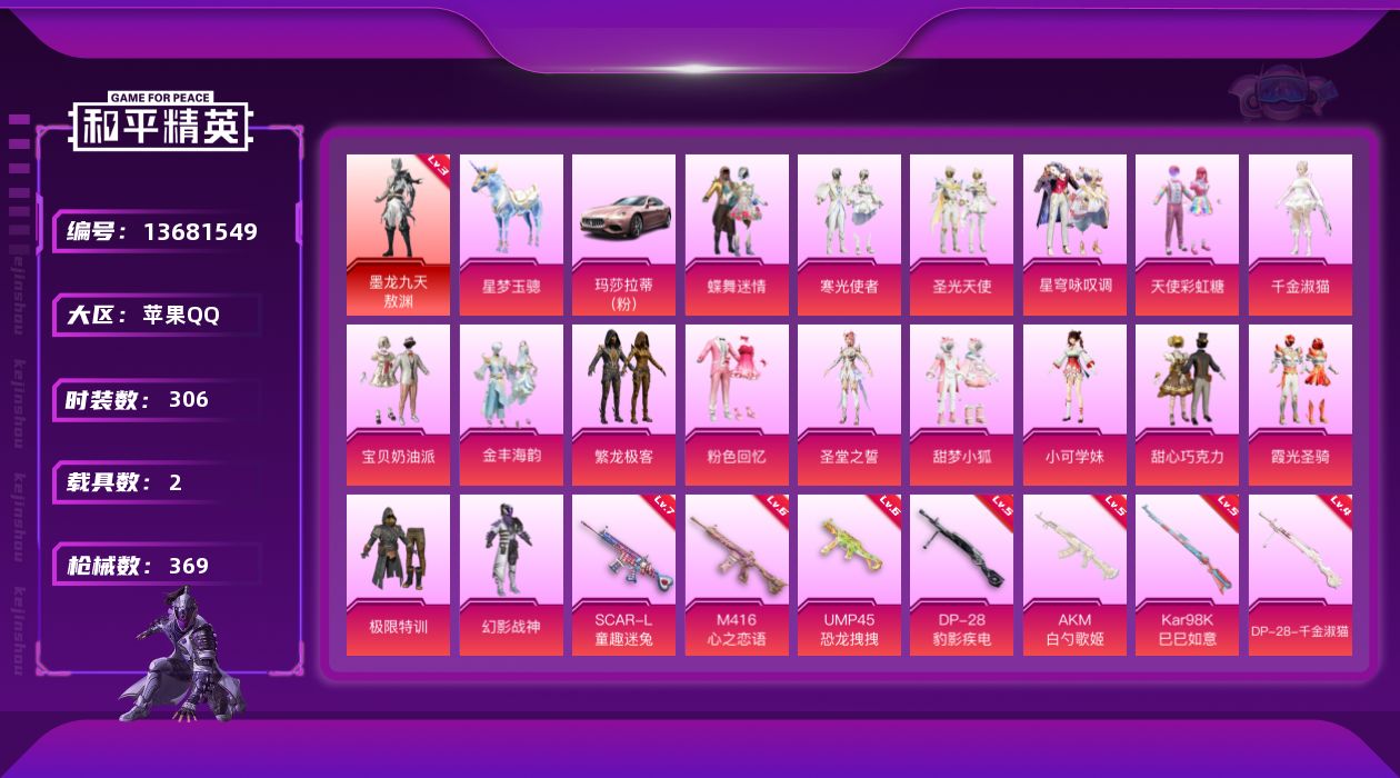 [13681549]可二次【店主推荐捡漏号!可直接换绑】苹果 手Q-无敌战神框-1神装-17粉装-9特效枪-2载具-9粉色飞行器-122849热力值-24王牌印记-306套装-369枪皮【红色神装等级】:墨龙九天-敖渊(三级)【红色角色神装】:墨龙九天-敖渊【热门品类】:粉装-繁龙极客,绝对防御上衣,套装-浪漫天命,套装-都市猎人,套装-深海小丑鱼,套装-小丑鱼,套装-奇异狩猎者,套装-金羽特工,套装-忍者信条,套装-动感兔斯基人偶服,套装-SS1特训,套装-龟仙人,套装-红红火火,角色-8号机,角色-Mark.06【粉色载具】:玛莎拉蒂Ghibli(粉),星梦玉骢【粉色套装】:粉装-极限特训,粉装-幻影战神,粉装-粉色回忆,粉装-甜心巧克力,粉装-宝贝奶油派,粉装-天使彩虹糖,粉装-蝶舞迷情,粉装-甜梦小狐,粉装-圣光天使,粉装-霞光圣骑,粉装-寒光使者,角色-小可学妹,角色-圣堂之誓,粉装-繁龙极客,粉装-金丰海韵,角色-千金淑猫,粉装-星穹咏叹调【粉色枪皮等级】:AKM-白勺歌姬(五级),SCAR-L-童趣迷兔(七级),M416-心之恋语(六级),M416-墨龙九天(三级),UMP45-恐龙拽拽(六级),Kar98K-巳巳如意(五级),DP-28-千金淑猫(四级),DP-28-豹影疾电(五级)【粉色枪皮】:AKM-白勺歌姬,SCAR-L-童趣迷兔,M416-心之恋语,M416-墨龙九天,UMP45-恐龙拽拽,Kar98K-巳巳如意,DP-28-千金淑猫,DP-28-豹影疾电,破片手榴弹-秋玉花灯【粉色飞行器】:春暖花开飞行器,甜梦小狐飞行器,白勺歌姬飞行器,萌物绒绒飞行器,繁龙极客飞行器,镜域双华-灵镜之阶,龙翔九天飞行器,幽焰列车飞行器