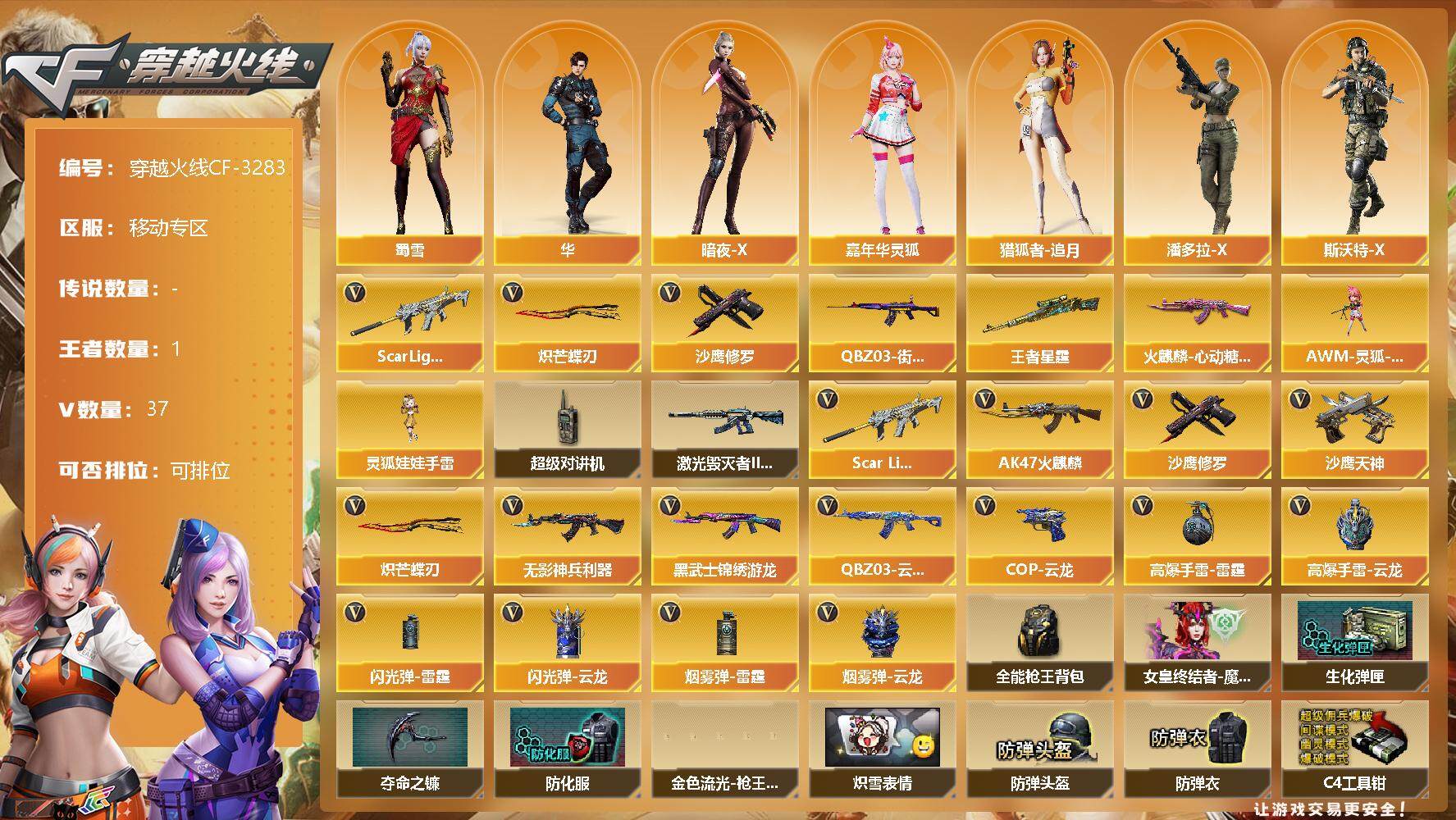 [13437683]移动专区-37V-1王者-0炫金 【热门武器】:Scar Light-白虎,QBZ03-街机,沙鹰-修罗,炽芒蝶刃 【王者炫金武器】:王者星霆 【皮肤】:火麒麟-心动糖果 【角色】:华,暗夜-X,嘉年华灵狐,猎狐者-追月,潘多拉-X,斯沃特-X,蜀雪,维纳斯,影武者-X 【人偶武器】:AWM-灵狐-15周年嘉年华,灵狐娃娃手雷 【暴走生化】:超级对讲机 【挑战大师】:激光毁灭者III-白马银枪 【英雄级武器】:AK47-火麒麟,Scar Light-白虎,无影-神兵利器,QBZ03-云龙,黑武士-锦绣游龙,沙鹰-修罗,沙鹰-天神,COP 357-云龙*2,炽芒蝶刃,高爆手雷-雷霆,高爆手雷-云龙*7,闪光弹-雷霆,闪光弹-云龙*6,烟雾弹-雷霆,烟雾弹-云龙*7 【道具】:全能枪王背包,女皇终结者-魔龙之吻,生化弹匣,夺命之镰,防化服,金色流光-枪王排位,星辰流光-枪王排位,枪王排位28赛季金色流光,炽雪表情,防弹头盔,防弹衣,C4工具钳,手雷包 【特殊枪械】:1白虎