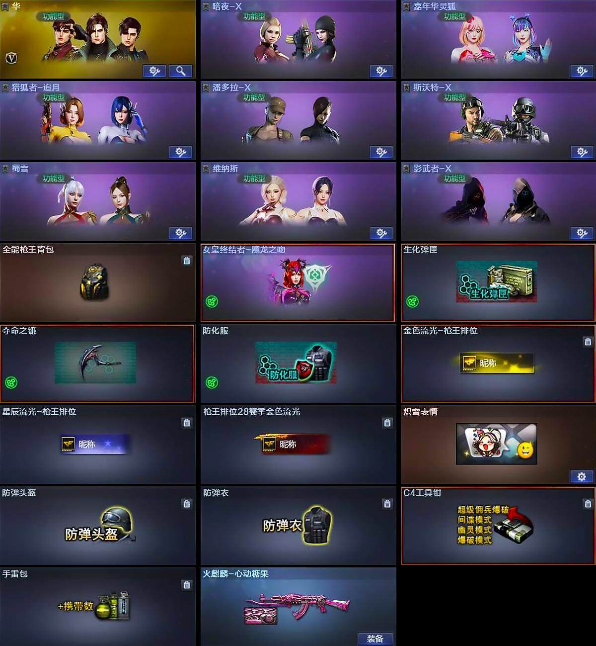 【道具】:全能枪王背包,女皇终结者-魔龙之吻,生化弹匣,夺命之镰,防化服,金色流光-枪王排位,星辰流光-枪王排位,枪王排位28赛季金色流光,炽雪表情,防弹头盔,防弹衣,C4工具钳,手雷包