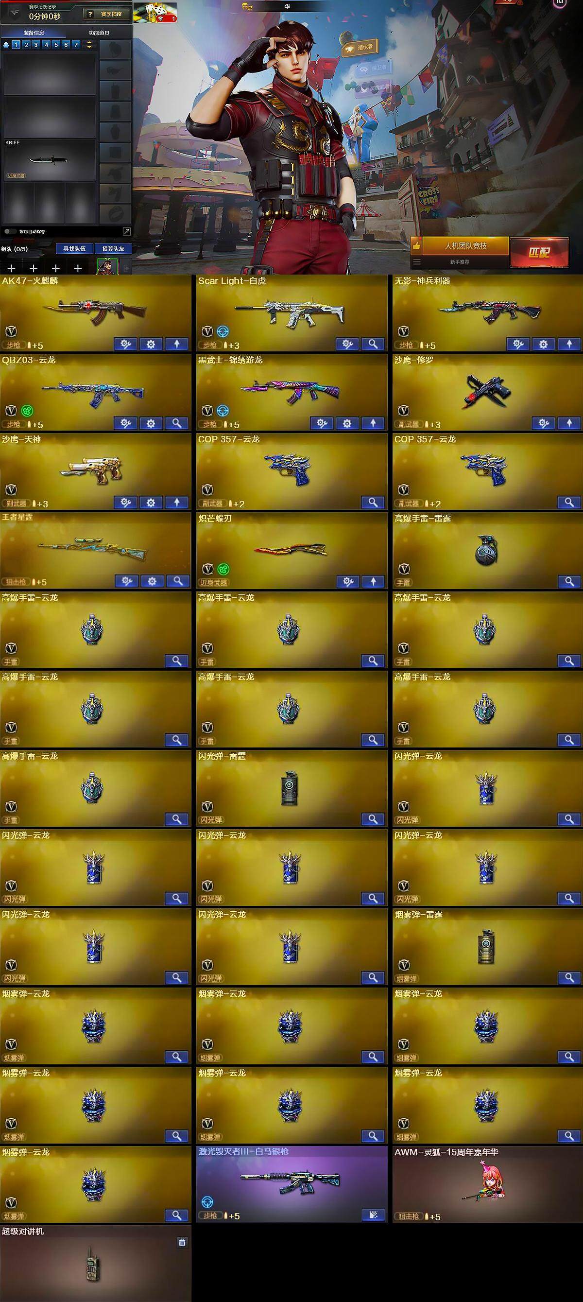 【英雄级武器】:AK47-火麒麟,Scar Light-白虎,无影-神兵利器,QBZ03-云龙,黑武士-锦绣游龙,沙鹰-修罗,沙鹰-天神,COP 357-云龙*2,炽芒蝶刃,高爆手雷-雷霆,高爆手雷-云龙*7,闪光弹-雷霆,闪光弹-云龙*6,烟雾弹-雷霆,烟雾弹-云龙*7