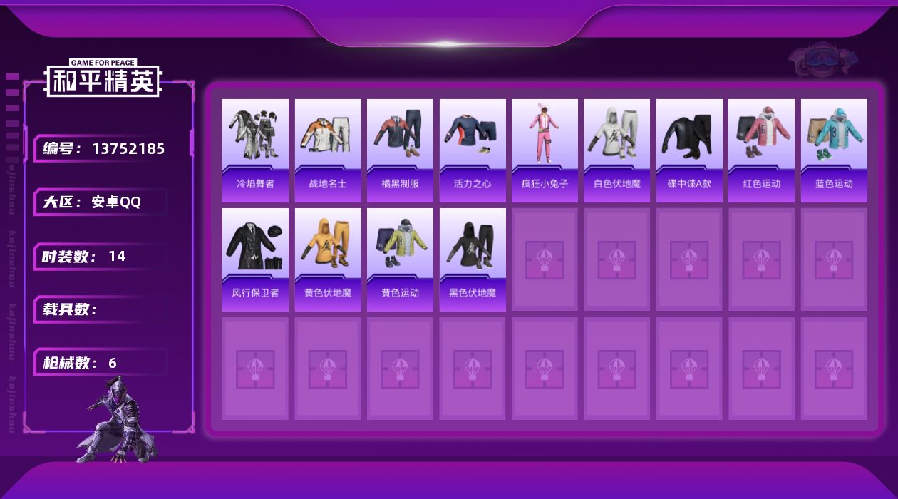 - [11609080]8特效枪 2载具 3印记 可二次 可修改实名 连体王者 优质装备:玛莎拉蒂Ghibli(蓝),玛莎拉蒂Ghibli(粉),AKM绿萝繁花,M416电玩时刻,GROZA-镜光银凌,SCAR-L金蛇镇世,MK14-盛世惊鸿,AUG-暖羊咩咩,MK14-甜梦熊击,Kar98K-巳巳如意 热门装扮:梦魇先生,东方飞龙 五级特效枪:五级GROZA-镜光银凌,五级MK14-甜梦熊击,五级AUG-暖羊咩咩,五级M416-电玩时刻,五级AKM-绿萝繁花 四级特效枪:四级Kar98K-巳巳如意 三级特效枪:三级SCAR-L金蛇镇世,三级MK14-盛世惊鸿 紫色装扮:日冕精灵,SS31特训套装,SS3特训,SS4特训,SS5特训,伏击者,冰川特警,决胜时刻,凛冬战士,北国孤狼,SS30特训套装,SS33特训套装,青涩时光,SS13特训,SS14特训,吉莉礼服,酒红色名流,酷萌兔限定,野性战魂,金鼠迎春,长空猛禽,雪山征服者,雪山精英,雷霆特警,霓虹街区,风暴特警,缤纷果语,蓝色运动,跃动心情,龙腾端午,骑行爱好者,黑色伏地魔,龙的传人,龟仙人,龙魂突击队,和平特警,沙漠兵团,圣诞大吉,坚韧舞者,夏日音浪,夜莺强袭者,怒火燎原,战地督导,攀登者,疯狂小兔子,神秘领域,甜蜜告白,空岛之星,竞技勇士朋克,红色运动,牛气冲天,灰色格斗者,灼焰舞者,热血青春,熔岩使者,牛气满满,猛禽,特战装甲,星途旅人,SS28特训,鱼渊荷华,燕燕于飞,巳巳如意,森林游猎者,竞技名士,怀庆长公主,果汁能量,惊鸿侠骨,SS25特训,锦衣飞扬,粉红小猪,焰鹰斗篷,幻羽潜行,SS27特训,萌趣绒叽,SS26特训,春光漫游,快闪甜心,智谋强哥,精神漫游,炽焰拳师,格斗专家,SS6特训,黑色刀锋,核芯基因,SS7特训,清香五月粽,拳皇97草薙京,黑夜传说,太极红客,玲珑飞花,SS8特训,星谷精灵,SS12特训,智慧之神,SS9特训,SS10特训,SS11特训,SS32特训服(SS32特训套装),恋语绒绒,忍者信条,街舞达人,WiFi精灵,冷血极客,丛林猎人,传奇侦探,特种空勤,银月精灵 优质战备:星途旅人降落伞,蜜语绒猫降落伞,盛世惊鸿降落伞,凤舞九天飞行器,临安公主降落伞,甜心宝贝降落伞,至尊龙雀降落伞,梦幻火箭降落伞