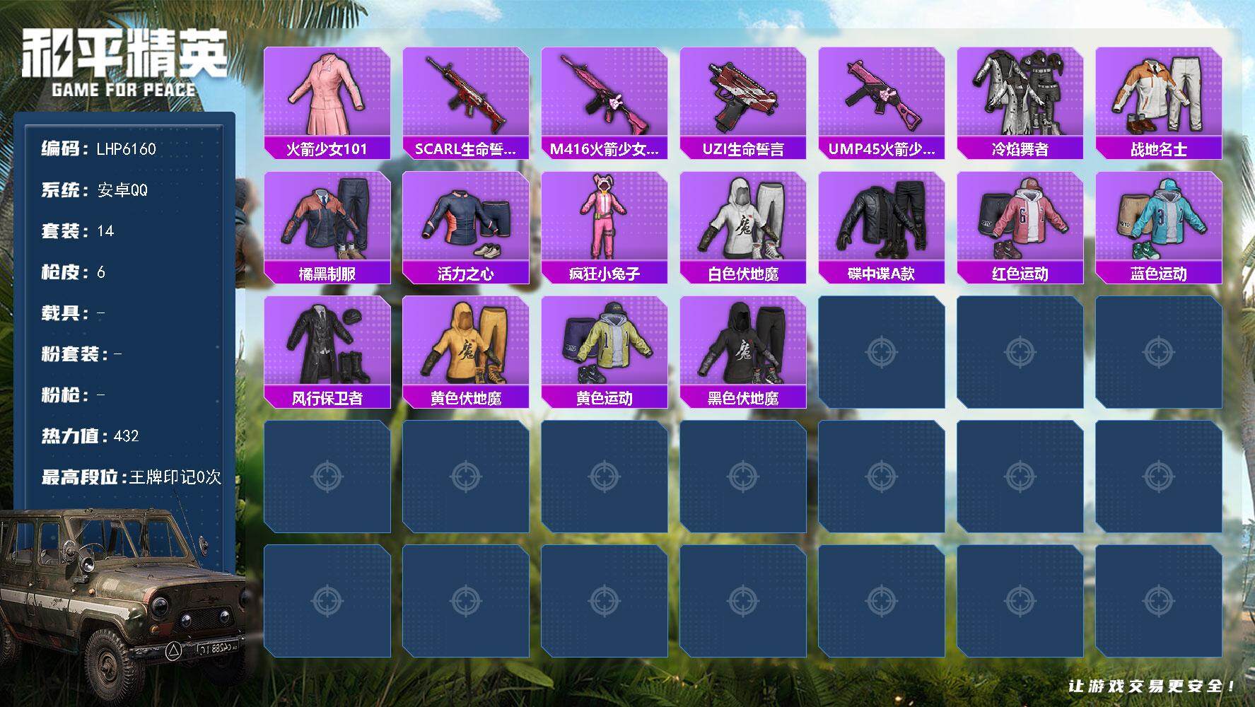 [13752185]可二次【店主推荐捡漏号!可直接换绑】/素材身法号/老101 安卓 手Q-432热力值-2王牌印记-14套装-6枪皮【热门品类】:套装-火箭少女101