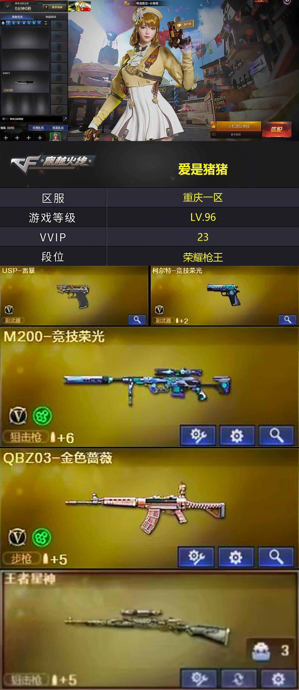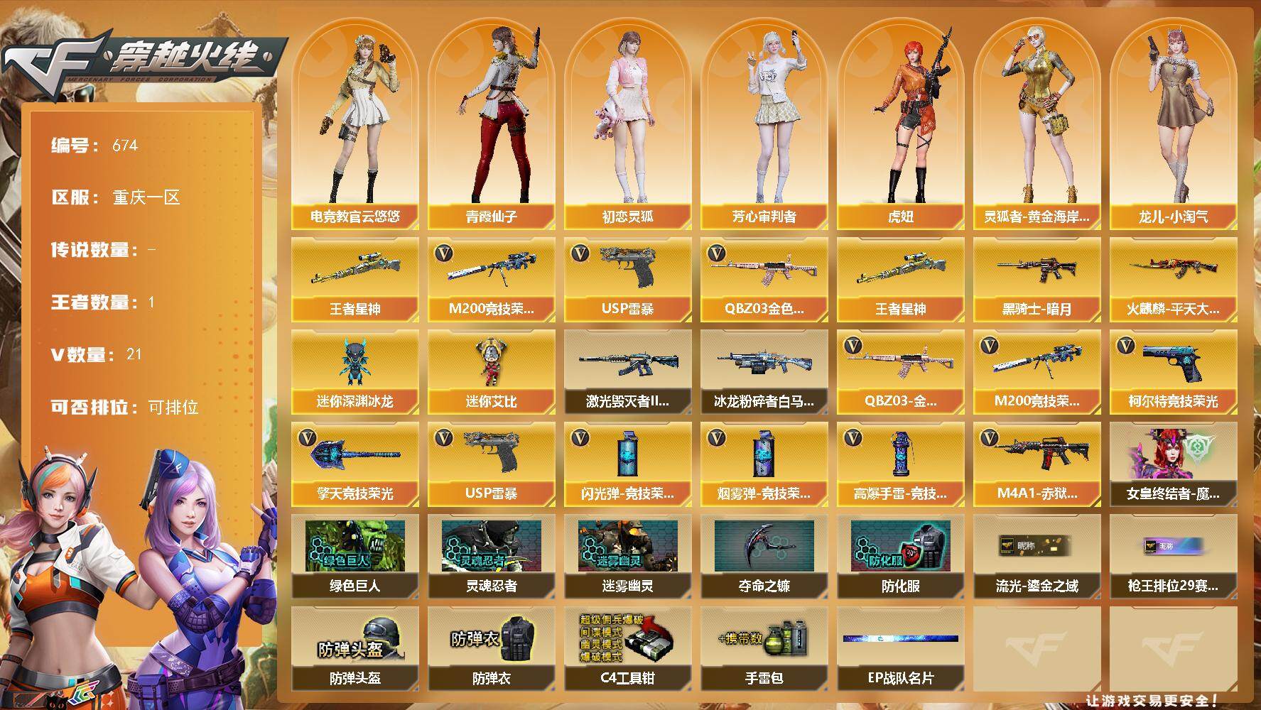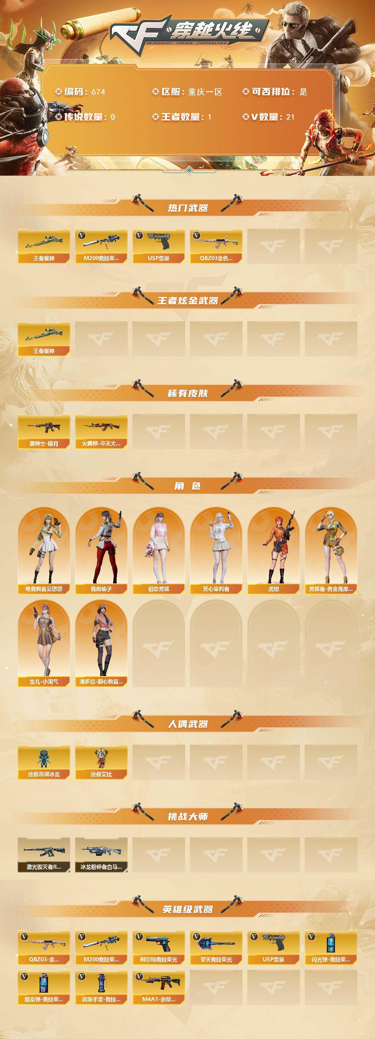 [13711049]重庆一区-21V-1王者-0炫金 【热门武器】:王者星神,QBZ03-金色蔷薇,M200-竞技荣光,USP-雷暴 【王者炫金武器】:王者星神 【皮肤】:火麒麟-平天大圣,黑骑士-暗月 【角色】:电竞教官-云悠悠,初恋灵狐,芳心审判者,虎妞,灵狐者-黄金海岸,龙儿-小淘气,潘多拉-甜心教官,青霞仙子 【人偶武器】:迷你深渊冰龙,迷你艾比 【挑战大师】:冰龙粉碎者-白马银枪,激光毁灭者III-白马银枪 【英雄级武器】:QBZ03-金色蔷薇,M200-竞技荣光,USP-雷暴,柯尔特-竞技荣光,擎天-竞技荣光,高爆手雷-竞技荣光*4,闪光弹-竞技荣光*4,烟雾弹-竞技荣光*4,M4A1-赤狱骑士 【道具】:女皇终结者-魔龙之吻,绿色巨人,灵魂忍者,迷雾幽灵,夺命之镰,防化服*3,流光-鎏金之域,枪王排位29赛季金色流光,EP战队名片,防弹头盔*4,防弹衣*4,C4工具钳*4,手雷包*4 【特殊枪械】:
