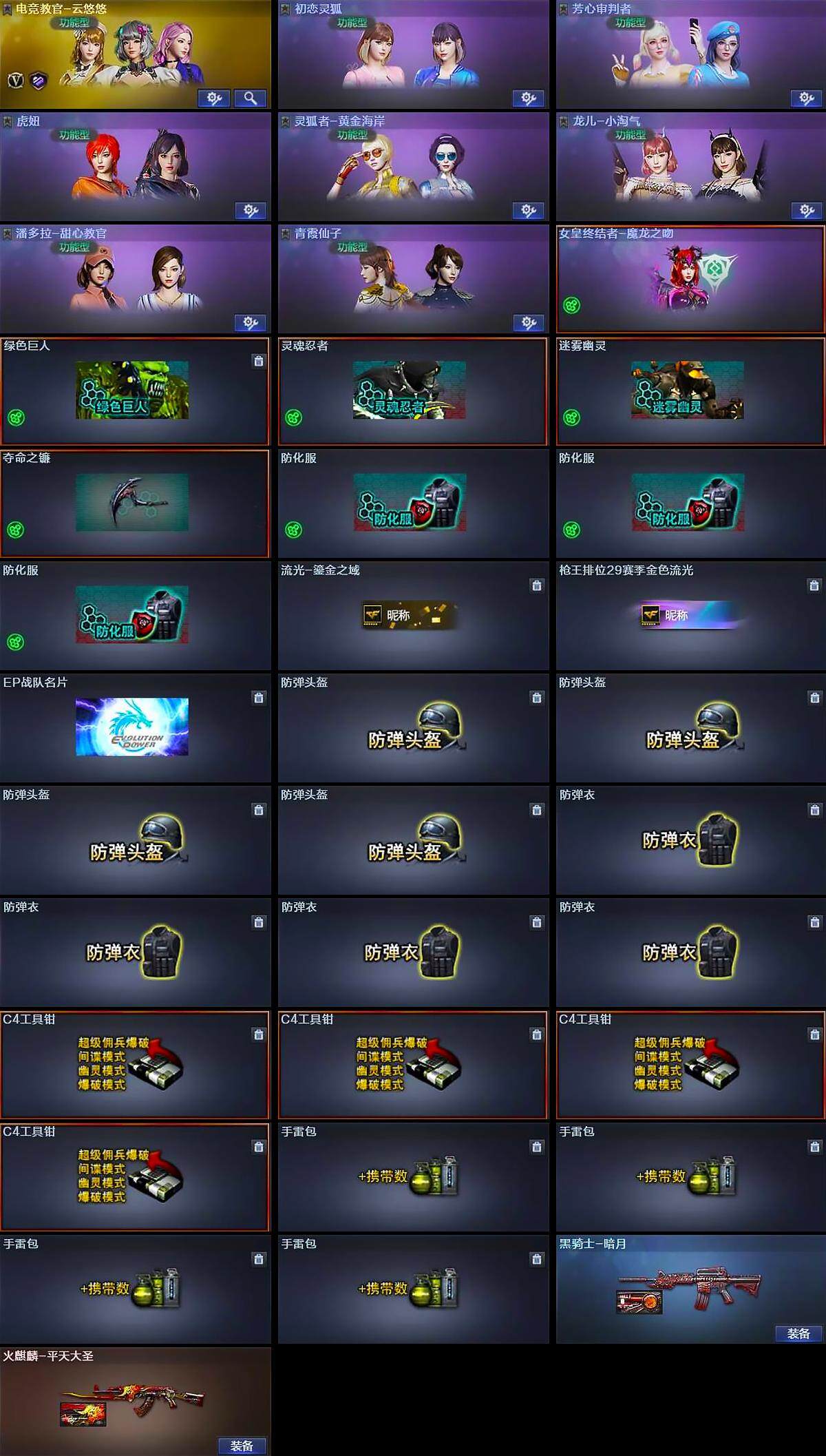 【道具】:女皇终结者-魔龙之吻,绿色巨人,灵魂忍者,迷雾幽灵,夺命之镰,防化服*3,流光-鎏金之域,枪王排位29赛季金色流光,EP战队名片,防弹头盔*4,防弹衣*4,C4工具钳*4,手雷包*4