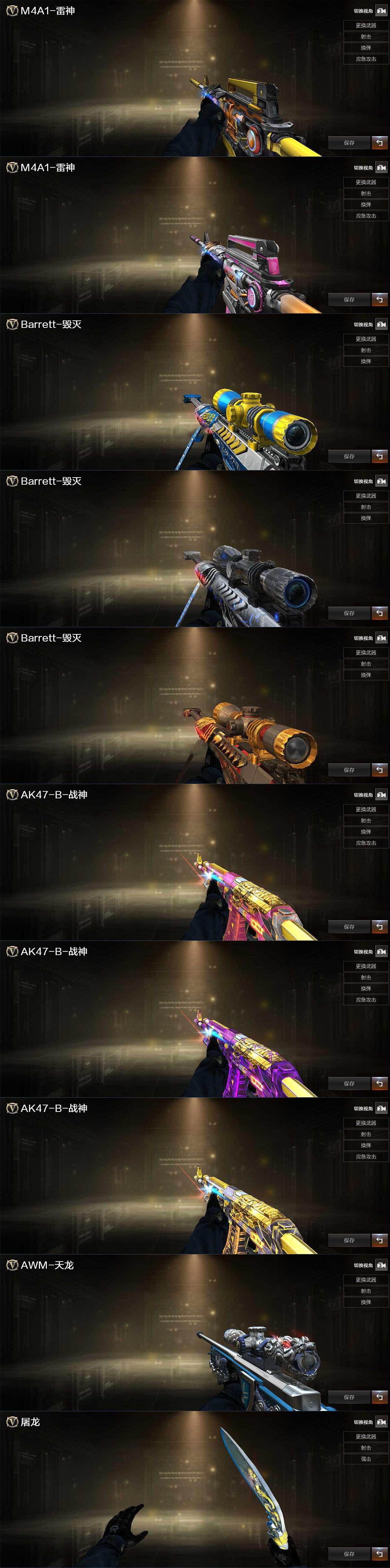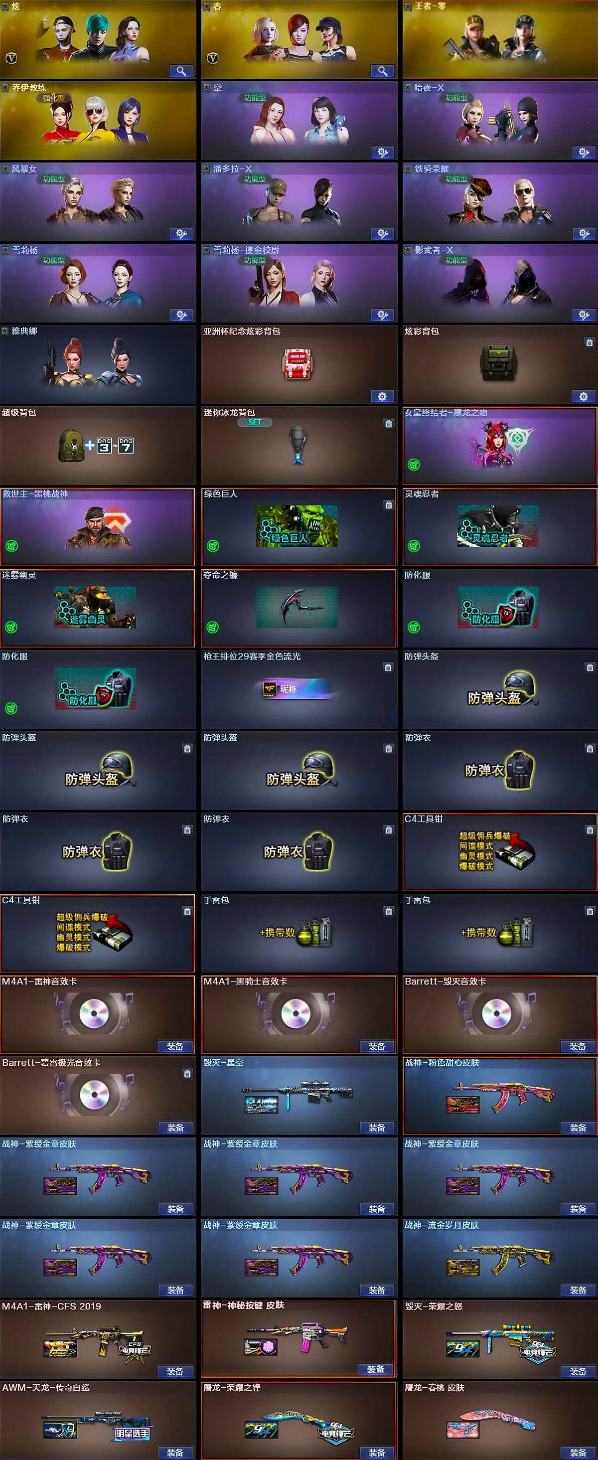 【皮肤】:M4A1-雷神-CFS 2019,雷神-神秘按键 皮肤,毁灭-荣耀之怒,毁灭-星空,毁灭-英雄计划 皮肤,战神-粉色甜心皮肤,战神-紫绶金章皮肤*5,战神-流金岁月皮肤,AWM-天龙-传奇白鲨,屠龙-荣耀之锋,屠龙-春桃 皮肤