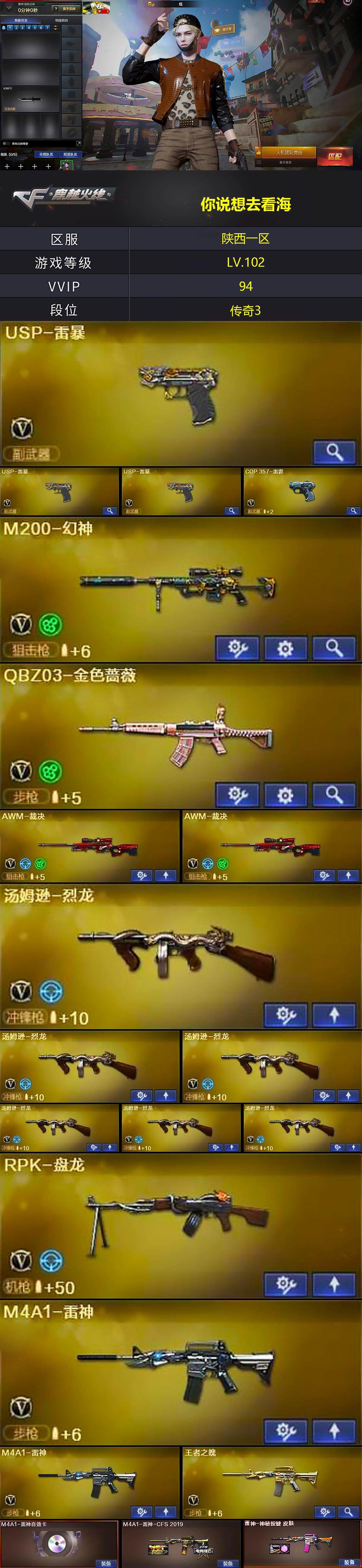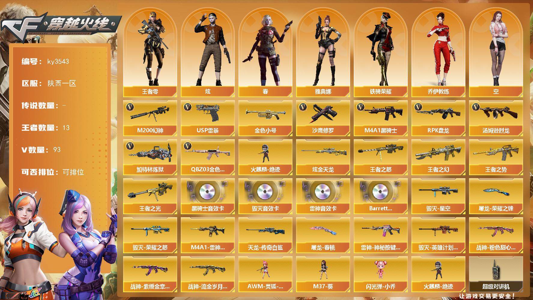 [13756345]陕西一区-93V-13王者-1炫金 【热门武器】:QBZ03-金色蔷薇,M200-幻神,金色小号,M4A1-黑骑士,汤姆逊-烈龙*6,RPK-盘龙,加特林-炼狱*2,火麒麟-绝迹,USP-雷暴*3,沙鹰-修罗*2 【王者炫金武器】:王者之幻,王者之势,王者之光,王者之怒,炫金天龙 【音效卡】:M4A1-雷神音效卡,M4A1-黑骑士音效卡,Barrett-毁灭音效卡,Barrett-碧霄极光音效卡 【皮肤】:M4A1-雷神-CFS 2019,雷神-神秘按键 皮肤,毁灭-荣耀之怒,毁灭-星空,毁灭-英雄计划 皮肤,战神-粉色甜心皮肤,战神-紫绶金章皮肤*5,战神-流金岁月皮肤,AWM-天龙-传奇白鲨,屠龙-荣耀之锋,屠龙-春桃 皮肤 【角色】:炫,春,王者-零,乔伊教练,空,暗夜-X,风暴女,潘多拉-X,铁骑荣耀,雪莉杨,雪莉杨-摸金校尉,影武者-X,雅典娜 【人偶武器】:火麒麟-绝迹,AWM-灵狐-15周年嘉年华,M37-葵,闪光弹-小乔 【暴走生化】:超级对讲机 【挑战大师】:神圣爆裂者III 【英雄级武器】:M4A1-千变*2,AK47-火麒麟,M4A1-黑龙,M4A1-雷神*2,M4A1-黑骑士,M4A1-死神,AN94-超新星,AK47-黑鲨,M4A1-龙血*4,AK47-雷暴,M4A1-玫瑰精灵,QBZ03-金色蔷薇,王者之心-觉醒版,王者之魄-觉醒版,AK-47-猩红传说*6,AK47-B-战神,AWM-天龙,Barrett-毁灭,AWM-裁决*2,M200-幻神,王者之力-觉醒版,RPK-盘龙,加特林-炼狱*2,汤姆逊-烈龙*6,AA-12-雷霆,沙鹰-修罗*2,USP-雷暴*3,雷霆之契,王者之魂-觉醒版,屠龙*3,擎天*2,麒麟刺,斩神刀-雷暴,王者之击-觉醒版*2,王者之刺-觉醒版,高爆手雷-雷霆*5,高爆手雷-雷暴*7,闪光弹-雷霆*5,闪光弹-雷暴*7,烟雾弹-雷霆*5,烟雾弹-雷暴*7,M4A1-赤狱骑士 【道具】:亚洲杯纪念炫彩背包,炫彩背包,超级背包,迷你冰龙背包,女皇终结者-魔龙之吻,救世主-黑桃战神,绿色巨人,灵魂忍者,迷雾幽灵,夺命之镰,防化服*2,枪王排位29赛季金色流光,防弹头盔*3,防弹衣*3,C4工具钳*2,手雷包*2 【特殊枪械】:1黑骑士,6烈龙,1盘龙,2炼狱