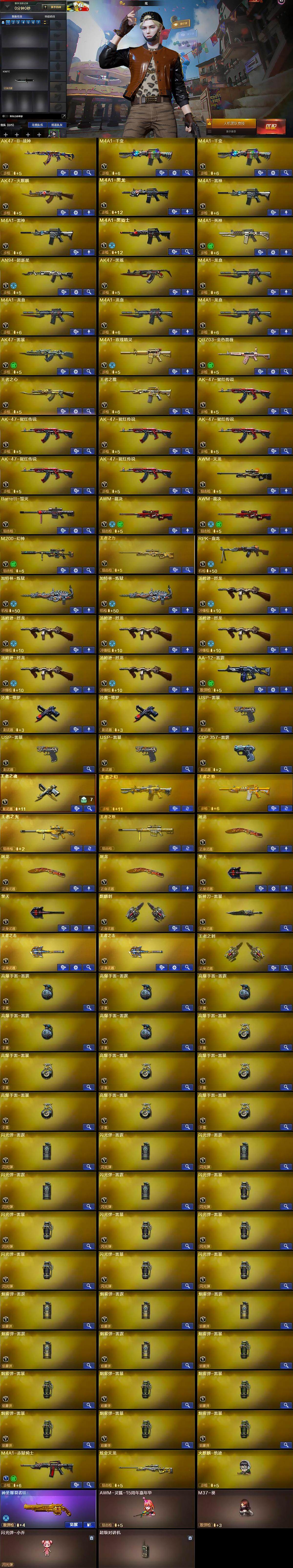 【英雄级武器】:M4A1-千变*2,AK47-火麒麟,M4A1-黑龙,M4A1-雷神*2,M4A1-黑骑士,M4A1-死神,AN94-超新星,AK47-黑鲨,M4A1-龙血*4,AK47-雷暴,M4A1-玫瑰精灵,QBZ03-金色蔷薇,王者之心-觉醒版,王者之魄-觉醒版,AK-47-猩红传说*6,AK47-B-战神,AWM-天龙,Barrett-毁灭,AWM-裁决*2,M200-幻神,王者之力-觉醒版,RPK-盘龙,加特林-炼狱*2,汤姆逊-烈龙*6,AA-12-雷霆,沙鹰-修罗*2,USP-雷暴*3,雷霆之契,王者之魂-觉醒版,屠龙*3,擎天*2,麒麟刺,斩神刀-雷暴,王者之击-觉醒版*2,王者之刺-觉醒版,高爆手雷-雷霆*5,高爆手雷-雷暴*7,闪光弹-雷霆*5,闪光弹-雷暴*7,烟雾弹-雷霆*5,烟雾弹-雷暴*7,M4A1-赤狱骑士
