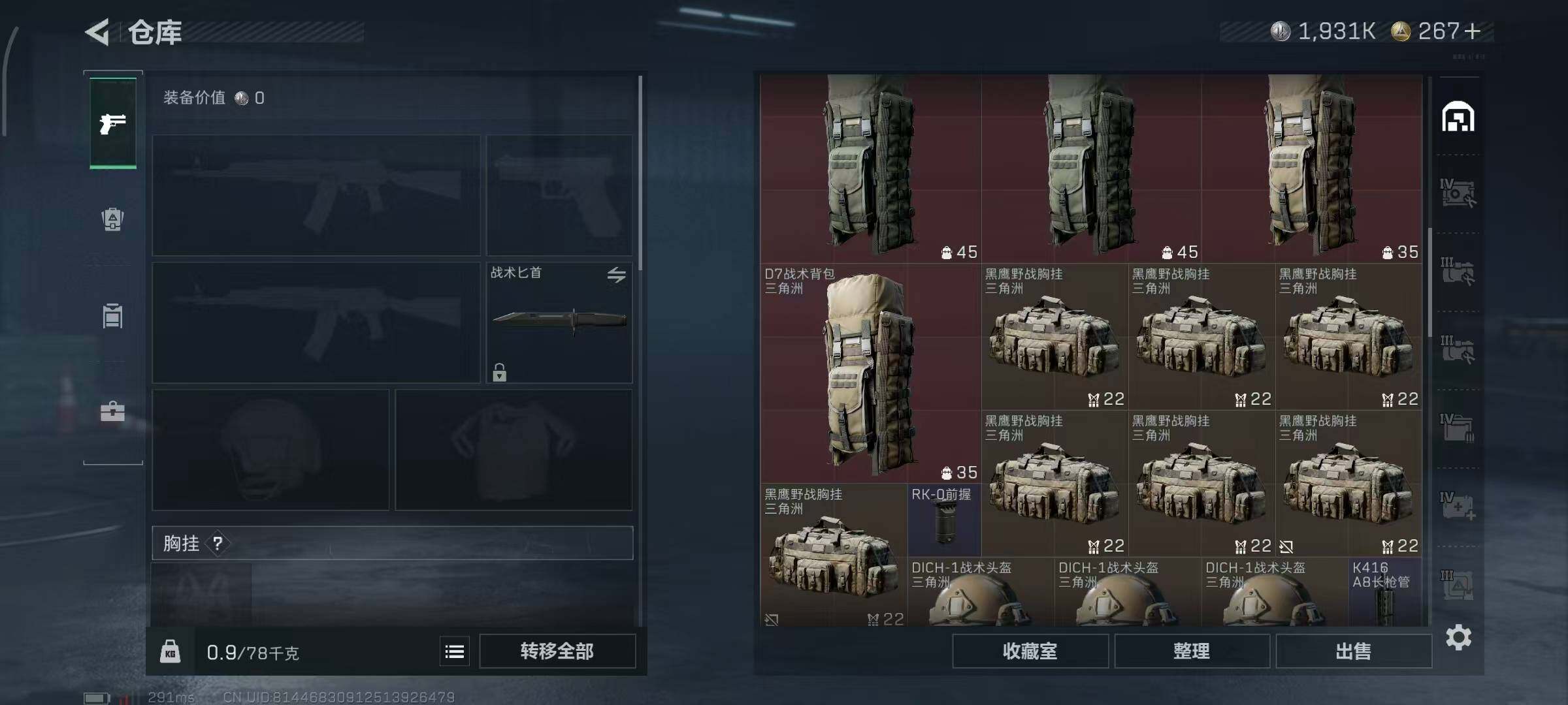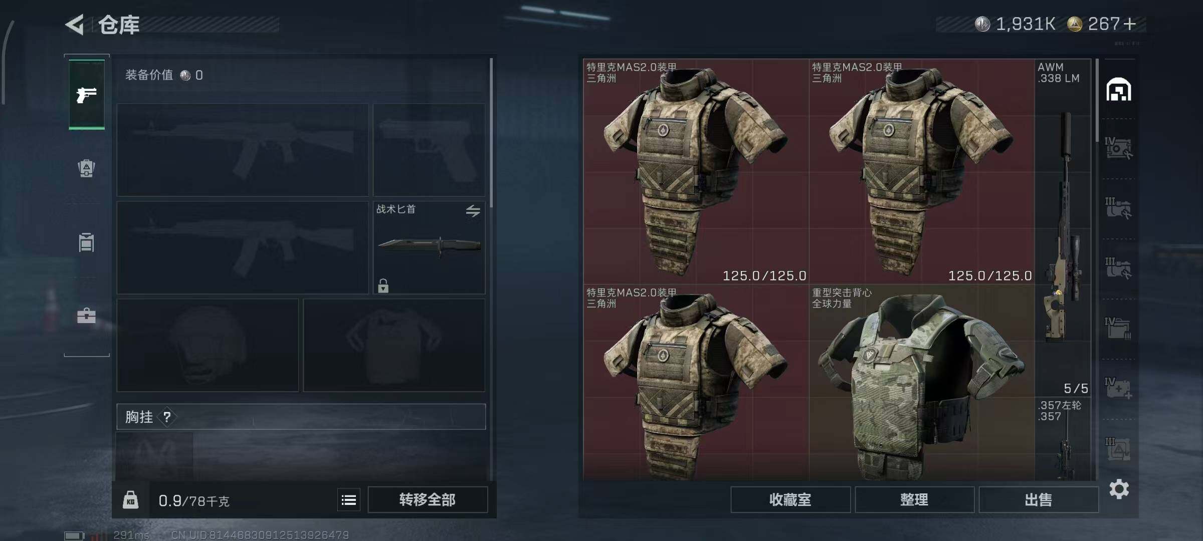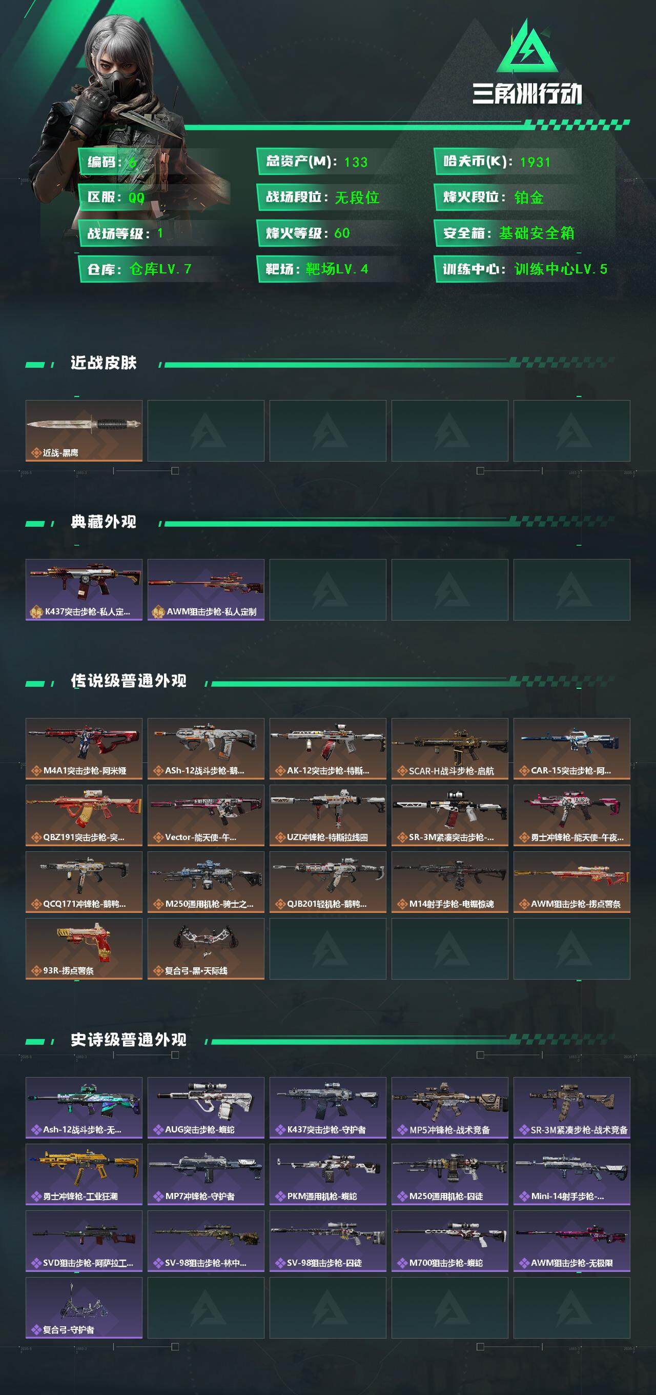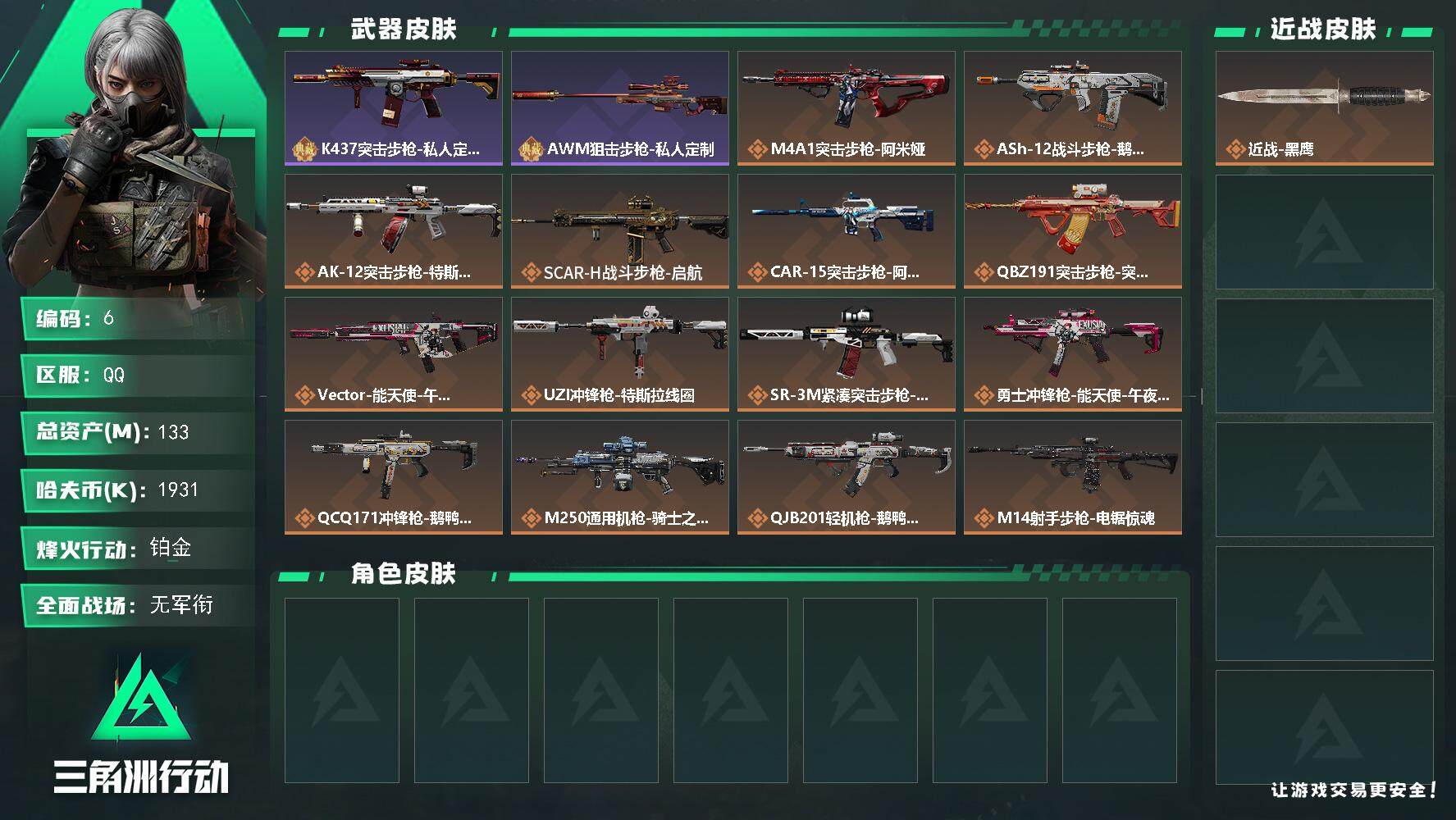 [13764125]1931k哈伏币-109m流动资产-60烽火等级-铂金-1战场等级-无军衔-仓库有颗非洲之心 【近战皮肤】:近战-黑鹰 【典藏外观】:K437突击步枪-私人定制,AWM狙击步枪-私人定制 【传说级普通外观】:M4A1突击步枪-阿米娅,ASh-12战斗步枪-鹅鸭杀,AK-12突击步枪-特斯拉线圈,SCAR-H战斗步枪-启航,CAR-15突击步枪-阿米娅,腾龙突击步枪-捞点薯条,Vector冲锋枪-能天使-午夜邮差,UZI冲锋枪-特斯拉线圈,SR-3M紧凑突击步枪-特斯拉线圈,勇士冲锋枪-能天使-午夜邮差,QCQ171冲锋枪-鹅鸭杀,M250通用机枪-骑士之心,QJB201轻机枪-鹅鸭杀,M14射手步枪-电锯惊魂,AWM狙击步枪-捞点薯条,93R-捞点薯条,复合弓-黑·天际线 【史诗级普通外观】:ASh-12战斗步枪-无极限,AUG突击步枪-蝮蛇,K437突击步枪-守护者,MP5冲锋枪-战术竞备,SR-3M紧凑突击步枪-战术竞备,勇士冲锋枪-工业狂潮,MP7冲锋枪-守护者,PKM通用机枪-蝮蛇,M250通用机枪-囚徒,Mini-14射手步枪-守护者,SVD狙击步枪-阿萨拉工艺,SV-98狙击步枪-林中猎手,SV-98狙击步枪-囚徒,M700狙击步枪-蝮蛇,AWM狙击步枪-无极限,复合弓-守护者 【稀有级普通外观】:SCAR-H战斗步枪-荣耀列队,Vector冲锋枪-先锋,SMG-45-行动开启,SMG-45冲锋枪-幻影结构,M1014霰弹枪-幻影结构,Mini-14射手步枪-荣耀列队,SKS射手步枪-弄臣,SR-25射手步枪-开拓,SR-9射手步枪-街头涂鸦,SV-98狙击步枪-星链科技,G18-星链科技 【普通级普通外观】:M4A1突击步枪-粉色涂装,M4A1突击步枪-高雅黑,M4A1突击步枪-海色,QBZ95-1突击步枪-高雅黑,QBZ95-1突击步枪-海浪,QBZ95-1突击步枪-海色,K416突击步枪-几何迷彩,K416突击步枪-高雅黑,M16A4突击步枪-山林猎人,AUG突击步枪-浅蓝涂装,M7战斗步枪-红色涂装,SG552突击步枪-浅蓝涂装,SG552突击步枪-海浪,SCAR-H战斗步枪-红色涂装,SCAR-H战斗步枪-数码迷彩,G3战斗步枪-高雅黑,PTR-32突击步枪-黄蜂,MP5冲锋枪-海色,MP5冲锋枪-黄蜂,Vector冲锋枪-几何迷彩,UZI冲