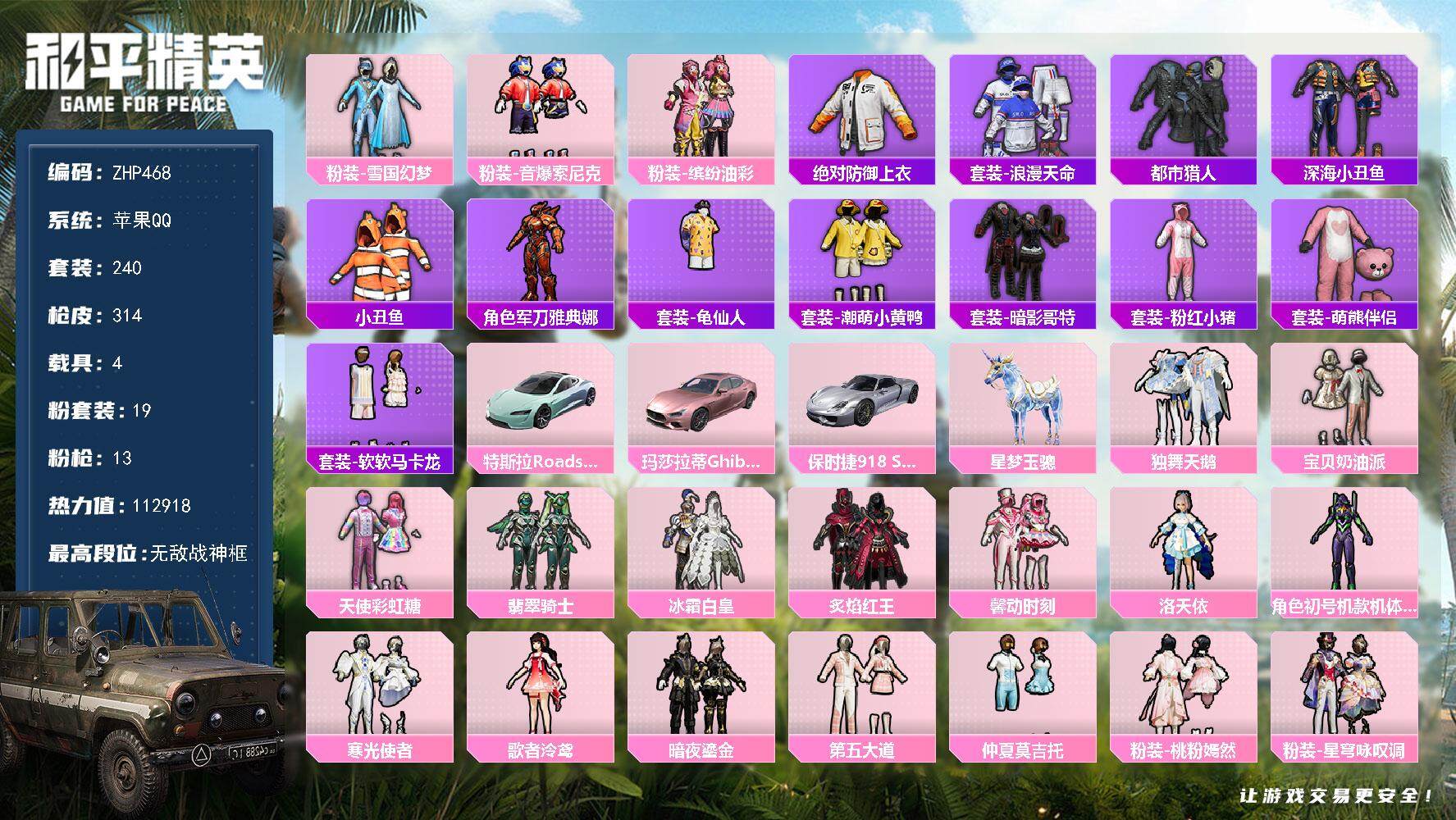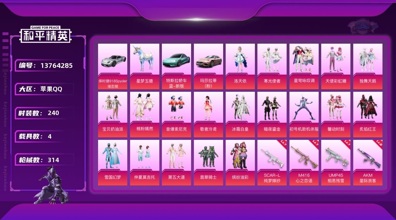 [13764285]可二次【店主推荐捡漏号!可直接换绑】/素材身法号/无敌战神框4/绝世印记1/璀璨碎片1200/地铁满天赋 苹果 手Q-无敌战神框-19粉装-13特效枪-4载具-6粉色飞行器-11.2w热力值-22王牌印记-240套装-314枪皮【热门品类】:粉装-雪国幻梦,粉装-音爆索尼克,粉装-缤纷油彩,绝对防御上衣,套装-浪漫天命,套装-都市猎人,套装-深海小丑鱼,套装-小丑鱼,角色-军刀雅典娜,套装-龟仙人,套装-潮萌小黄鸭,套装-暗影哥特,套装-粉红小猪,套装-萌熊伴侣,套装-软软马卡龙【粉色载具】:特斯拉Roadster(水滴蓝),玛莎拉蒂Ghibli(粉),保时捷918 Spyder(液态银),星梦玉骢【粉色套装】:粉装-独舞天鹅,粉装-宝贝奶油派,粉装-天使彩虹糖,粉装-雪国幻梦,粉装-缤纷油彩,粉装-翡翠骑士,粉装-冰霜白皇,粉装-炙焰红王,粉装-馨动时刻,角色-洛天依,角色-初号机款机体服,粉装-寒光使者,角色-歌者泠鸢,粉装-暗夜鎏金,粉装-音爆索尼克,粉装-第五大道,粉装-仲夏莫吉托,粉装-桃粉嫣然,粉装-星穹咏叹调【粉色枪皮等级】:AKM-星际浪客(六级),SCAR-L-纯梦嫁纱(七级),M416-心之恋语(七级),AUG-星梦奇缘(六级),AUG-暖羊咩咩(五级),M762-青锋波束(五级),UMP45-相思残雪(七级),Kar98K-巳巳如意(五级),Kar98K-圣域龙灵(三级),M417-第五大道(三级),DP-28-豹影疾电(五级),平底锅-桃粉嫣然(四级)【粉色飞行器】:星际浪客飞行器,歌者泠鸢飞行器,萌物绒绒飞行器,深渊漩涡飞行器,圣域金龙飞行器