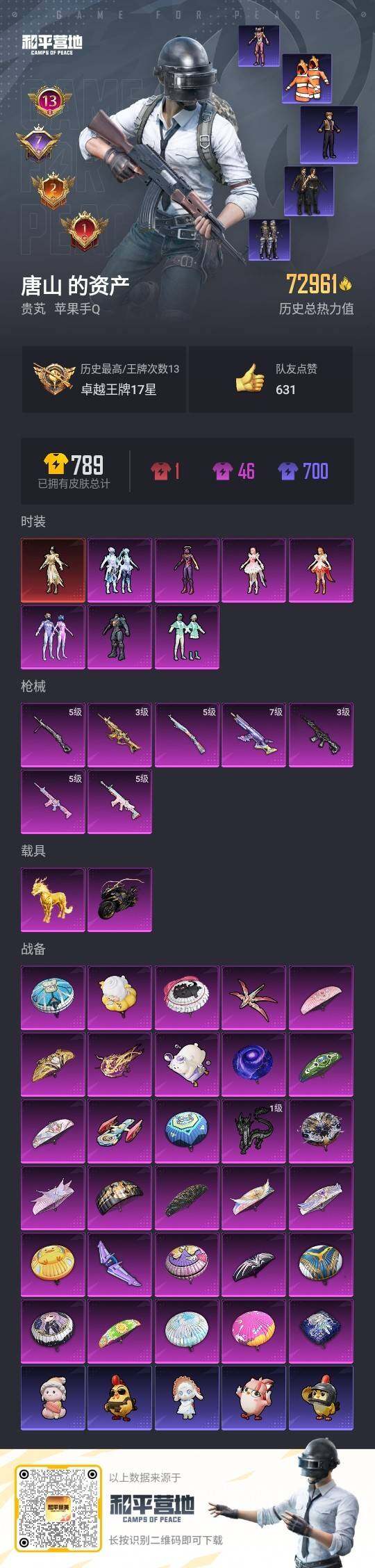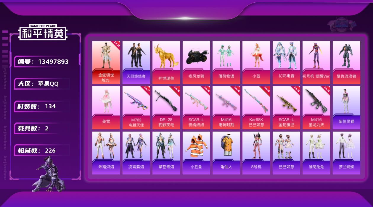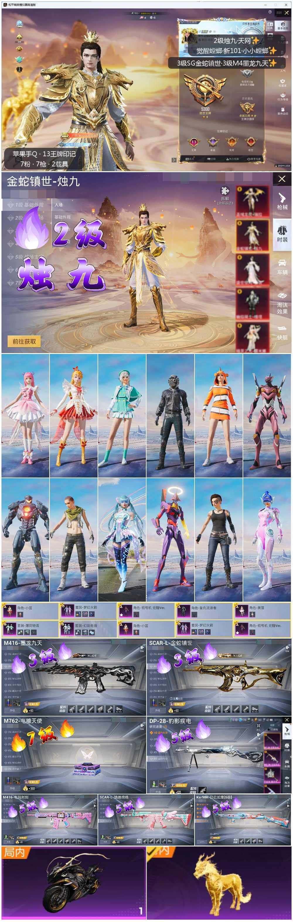 [13497893]可二次【店主推荐捡漏号!可直接换绑】苹果 手Q-1神装-7粉装-7特效枪-2载具-6粉色飞行器-72961热力值-13王牌印记-134套装-226枪皮【红色神装等级】:金蛇镇世-烛九(二级)【红色角色神装】:金蛇镇世-烛九【热门品类】:粉装-梦幻火箭,套装-小丑鱼,套装-天网终结者,套装-龟仙人,角色-8号机【粉色载具】:疾风龙骑,护世瑞兽【粉色套装】:粉装-梦幻火箭,粉装-薄荷物语,角色-复仇流浪者,角色-小蓝,角色-美雪,角色-初号机 觉醒Ver.,粉装-幻彩电音【粉色枪皮等级】:SCAR-L-锦绣绵绵(五级),SCAR-L-金蛇镇世(三级),M416-电玩时刻(五级),M416-墨龙九天(三级),M762-电糖天使(七级),Kar98K-巳巳如意(五级),DP-28-豹影疾电(五级)【粉色枪皮】:SCAR-L-锦绣绵绵,SCAR-L-金蛇镇世,M416-电玩时刻,M416-墨龙九天,M762-电糖天使,Kar98K-巳巳如意,DP-28-豹影疾电【粉色飞行器】:酣梦熊熊飞行器,梦幻火箭飞行器,龙翔九天飞行器,万象金身飞行器【粉色降落伞】:梦幻火箭降落伞,洛神天依降落伞,蓝莓炮弹降落伞,天之羽翼降落伞,碧影闪光降落伞,星夜魔法师降落伞,闪光银龙降落伞,环太平洋降落伞,垂柳戏鸭降落伞,圣堂之誓降落伞,繁龙极客降落伞,镜域双华降落伞,鎏金朋克降落伞,江南烟雨降落伞,精灵梦叶罗丽降落伞,墨龙九天降落伞,冠军兔兔降落伞,忍者神龟降落伞,宇宙意志降落伞,临安公主降落伞,金蛇镇世降落伞,绯穹魔姬降落伞,喜羊羊与灰太狼降落伞,异瞳寒姬降落伞