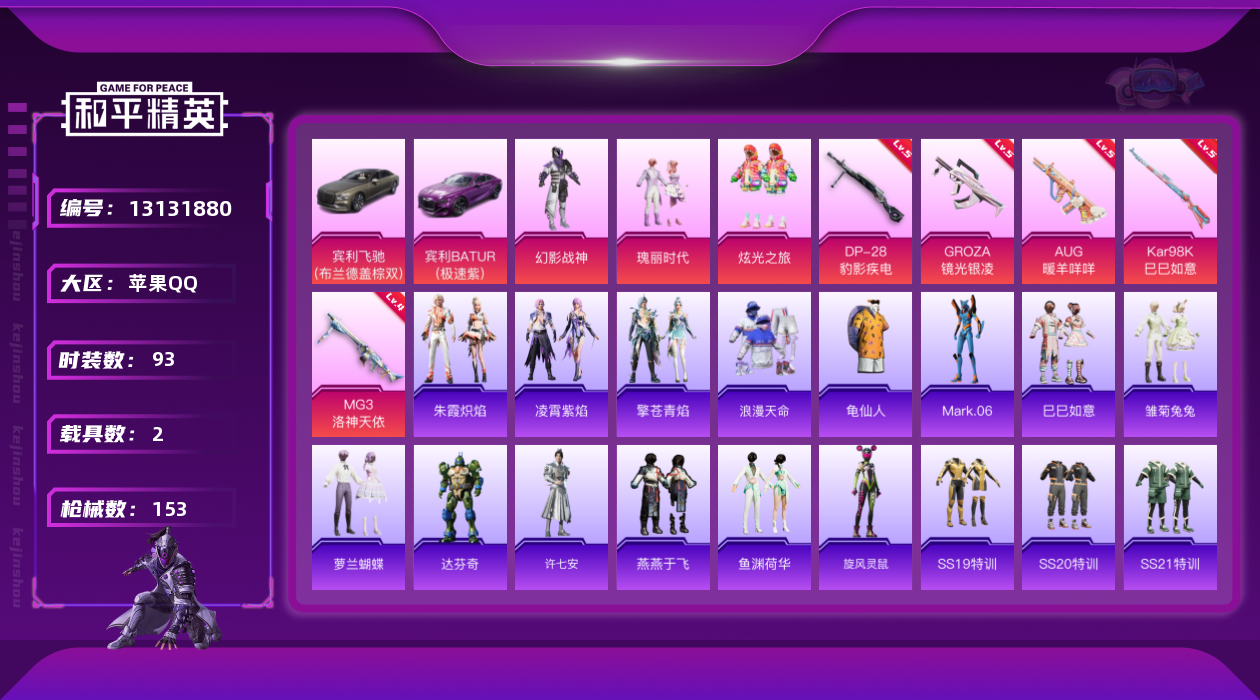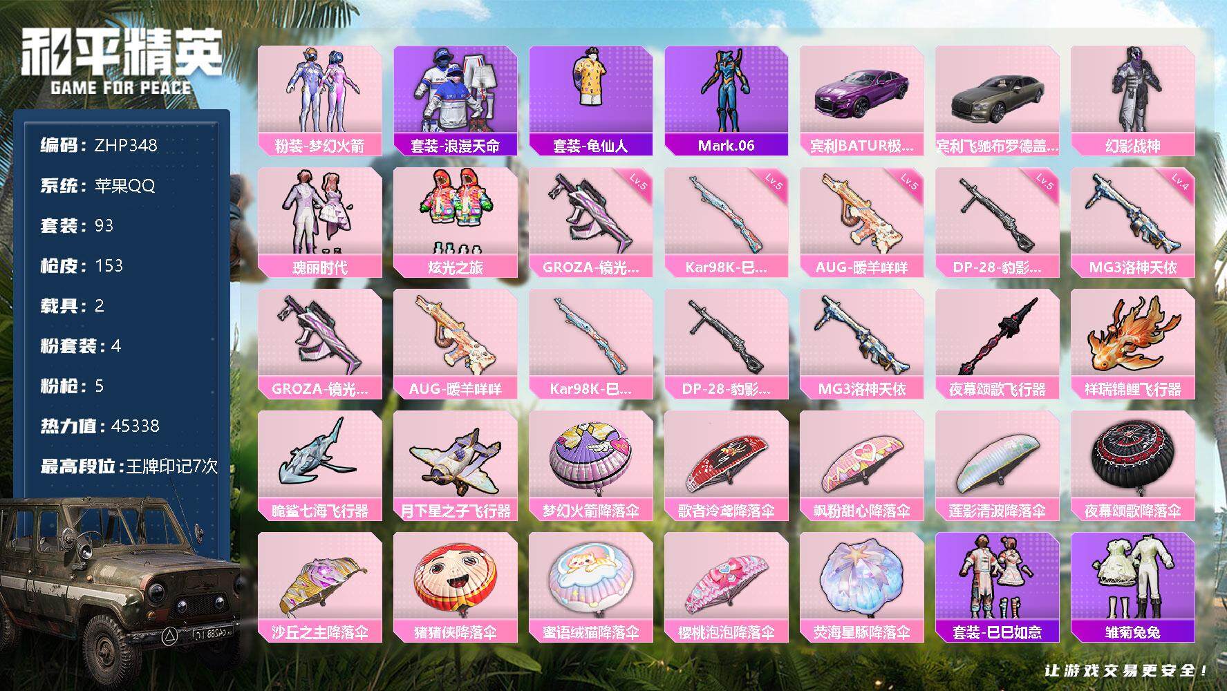 [13131880]素材身法号 苹果 手Q-4粉装-5特效枪-2载具-4粉色飞行器-4.5w热力值-7王牌印记-93套装-153枪皮【热门品类】:粉装-梦幻火箭,套装-浪漫天命,套装-龟仙人,角色-Mark.06【粉色载具】:宾利BATUR(极速紫),宾利飞驰(布罗德盖棕双色)【粉色套装】:粉装-幻影战神,粉装-梦幻火箭,粉装-瑰丽时代,粉装-炫光之旅【粉色枪皮等级】:GROZA-镜光银凌(五级),AUG-暖羊咩咩(五级),Kar98K-巳巳如意(五级),DP-28-豹影疾电(五级),MG3-洛神天依(四级)【粉色飞行器】:夜幕颂歌飞行器,祥瑞锦鲤飞行器,脆鲨七海飞行器,月下星之子飞行器