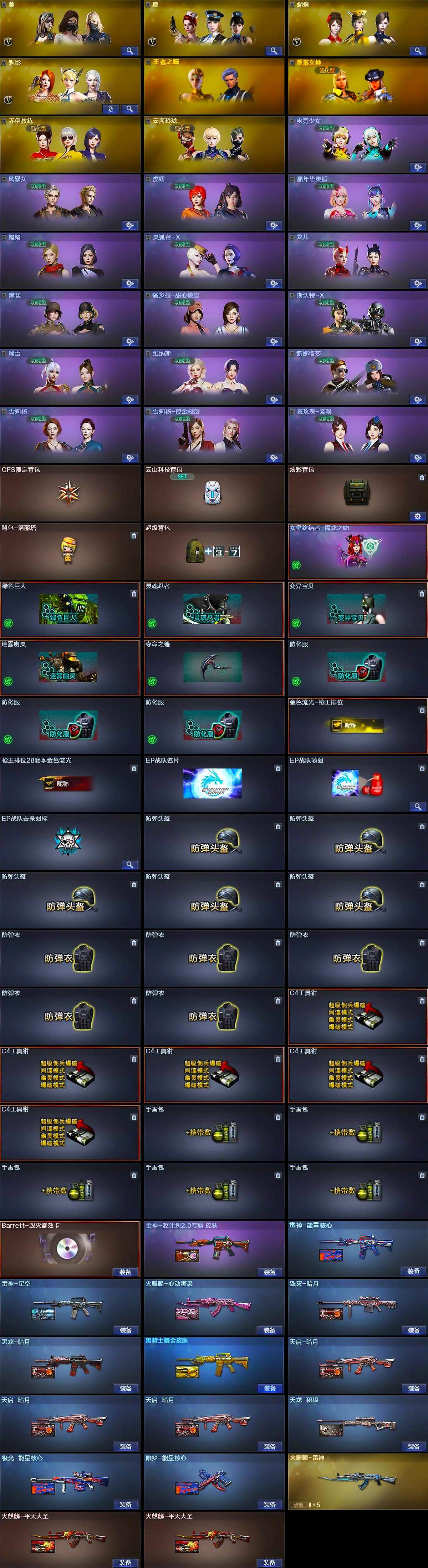【道具】:CFS限定背包,云山科技背包,炫彩背包,背包-洛丽塔,超级背包,女皇终结者-魔龙之吻,绿色巨人,灵魂忍者,变异宝贝,迷雾幽灵,夺命之镰,防化服*3,金色流光-枪王排位,枪王排