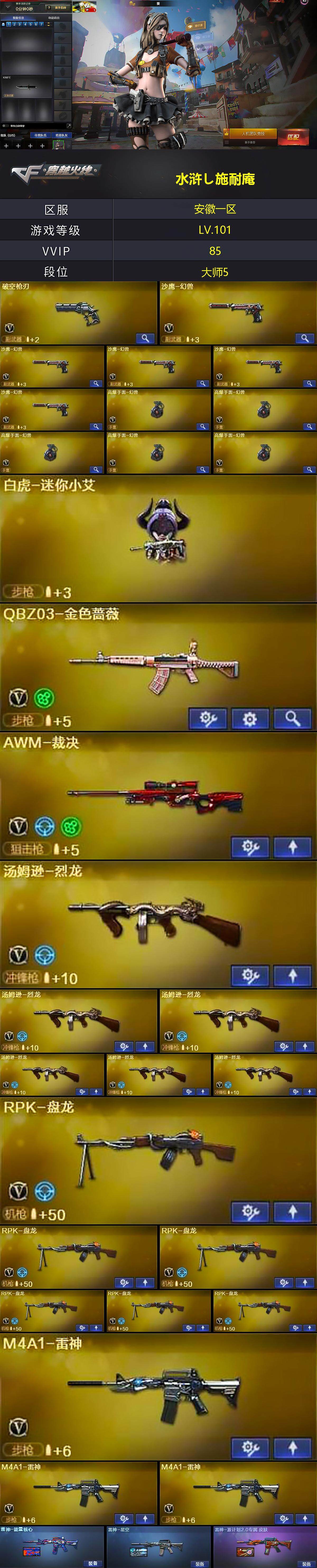 - [11522369]2传说角色 1炫金武器 55V武器 可二次 可修改实名 优质装备:M200-幻神,QBZ03-金色蔷薇,AK47-火麒麟,AK47-机械迷城,M4A1-雷神,M4A1-黑骑士,M4A1-黑龙,M4A1-青龙,M4A1-龙血,M4A1-千变,Barrett-毁灭,Barrett-极光,AWM-天龙,加特林-炼狱,沙鹰-修罗,屠龙,龙啸,麒麟刺,M4A1-幻灵,幻灵之锋,龙啸-烈火龙威,烈火-动感闪耀,天神-动感闪耀,屠龙-动感闪耀,擎天-云海游龙,AK47-黑武士-锦绣游龙,烈龙-云海游龙,无影-神兵利器,COP 357-幻灵,龙啸-云海游龙 排位资格:有 V武器:AK47-黑鲨 王者武器:QBZ-03-王者蔷薇-觉醒版,王者之势-觉醒版,王者之烈-觉醒版 炫金武器:炫金毁灭 热门武器:牛牛-AK47,斯泰尔-枪娘暗刃