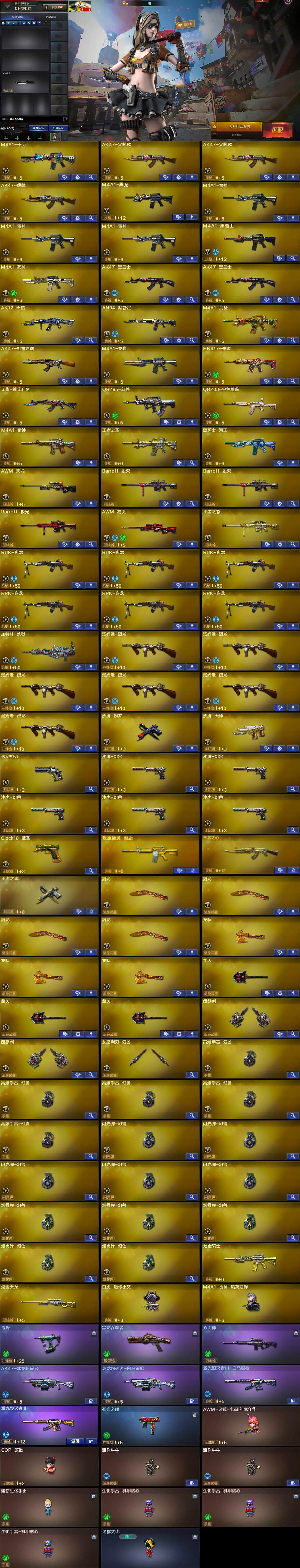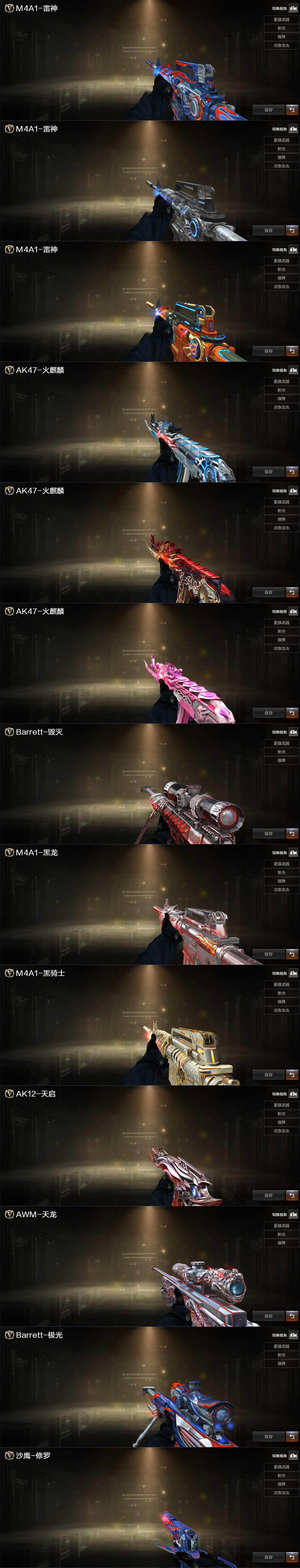 【英雄级武器】:M4A1-千变,AK47-火麒麟*2,AK47-麒麟,M4A1-黑龙,M4A1-雷神*3,M4A1-黑骑士,M4A1-死神,AK47-黑武士*2,AK12-天启,AN94-超新星,M4A1-武圣,AK47-机械迷城,M4A1-龙血,HK417-朱雀,无影-神兵利器,QBZ95-幻兽,QBZ03-金色蔷薇,M4A1-猎神,王者之圣-觉醒版,黑骑士-海王,AWM-天龙,Barrett-毁灭*2,Barrett-极光,AWM-裁决,王者之怒-觉醒版,RPK-盘龙*6,加特林-炼狱,汤姆逊-烈龙*6,沙鹰-修罗,沙鹰-天神,破空枪刃,沙鹰-幻兽*5,Glock18-武圣,屠龙*4,龙啸*3,擎天*3,麒麟刺*2,女皇利刃-幻兽,高爆手雷-幻兽*5,闪光弹-幻兽*5,烟雾弹-幻兽*5