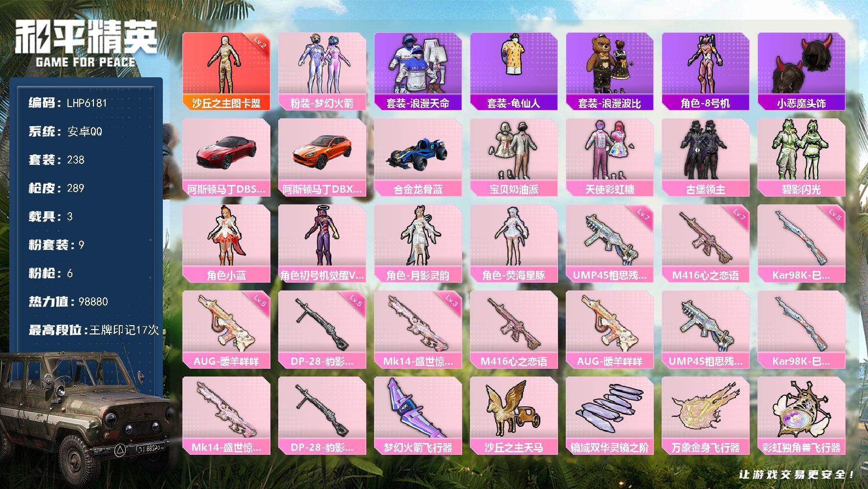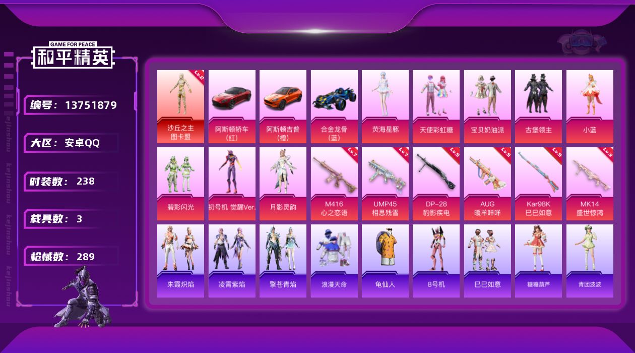 - [12949487]安卓 手Q-6粉装-3特效枪-1载具-5.8w热力值-4王牌印记-155套装-191枪皮【热门品类】:套装-小丑鱼,套装-忍者信条,套装-龟仙人,熔岩游骑兵面罩,熔岩游骑兵连帽夹克【粉色载具】:特斯拉Model 3(珍珠白)【粉色套装】:粉装-守护骑士,粉装-木曜青龙,粉装-华贵君王,粉装-天启纪元,粉装-麻辣鲜香锅,角色-烟云彩露【粉色枪皮等级】:AKM-绿萝繁花(五级),Mini14-龙虾霸霸(七级),DP-28-豹影疾电(五级)