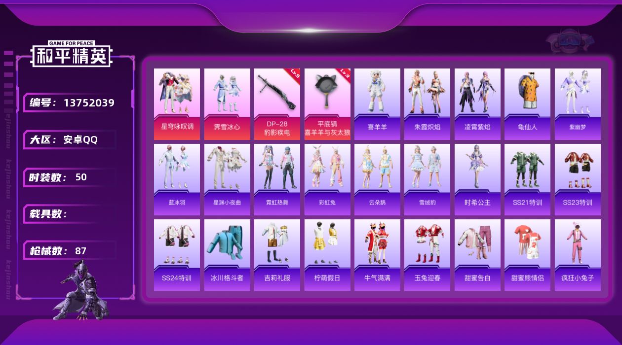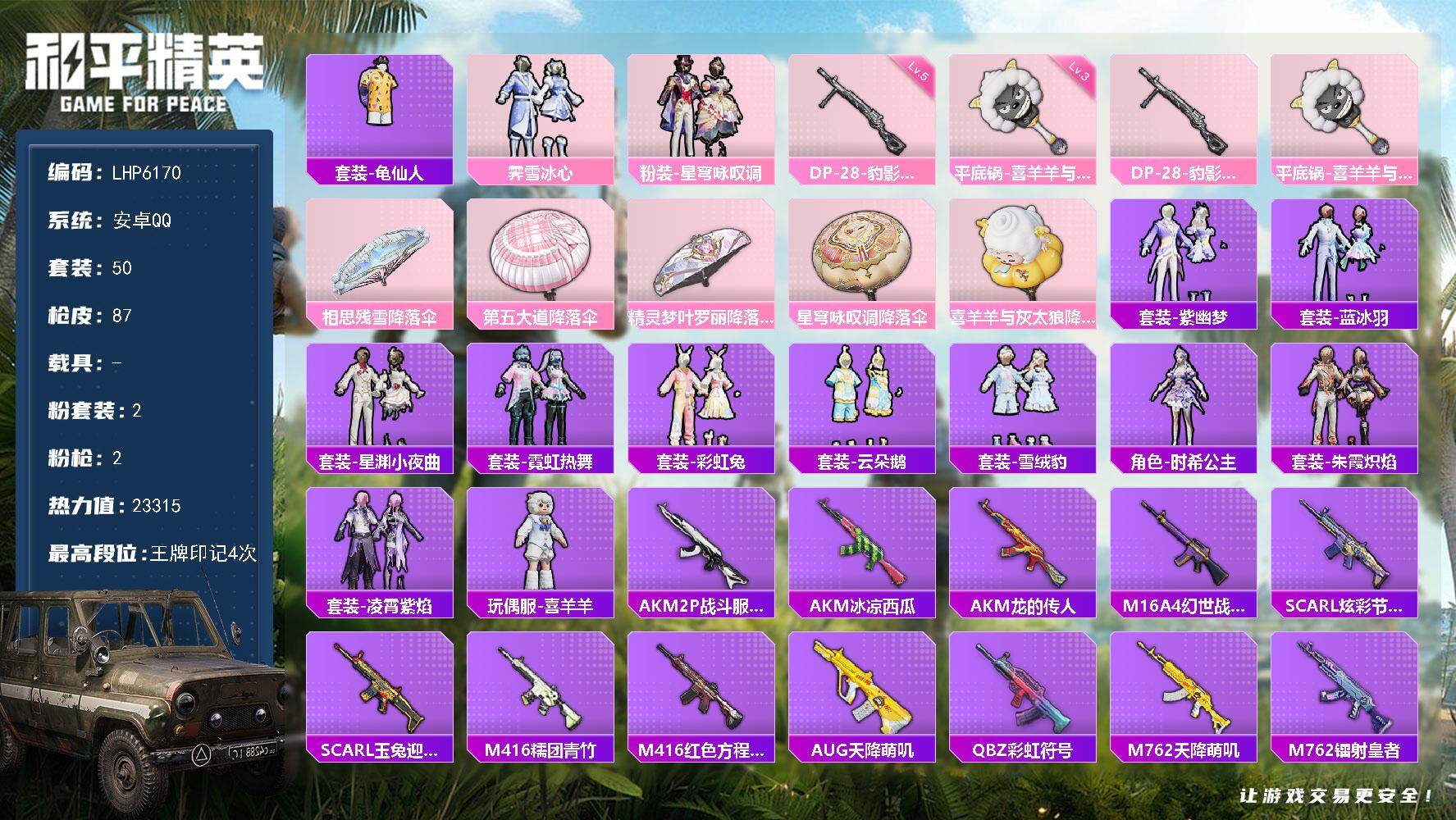 [13752039]可二次【店主推荐捡漏号!可直接换绑】 安卓 手Q-2粉装-2特效枪-2.3w热力值-4王牌印记-50套装-87枪皮【热门品类】:套装-龟仙人【粉色套装】:粉装-霁雪冰心,粉装-星穹咏叹调【粉色枪皮等级】:DP-28-豹影疾电(五级),平底锅-喜羊羊与灰太狼(三级)
