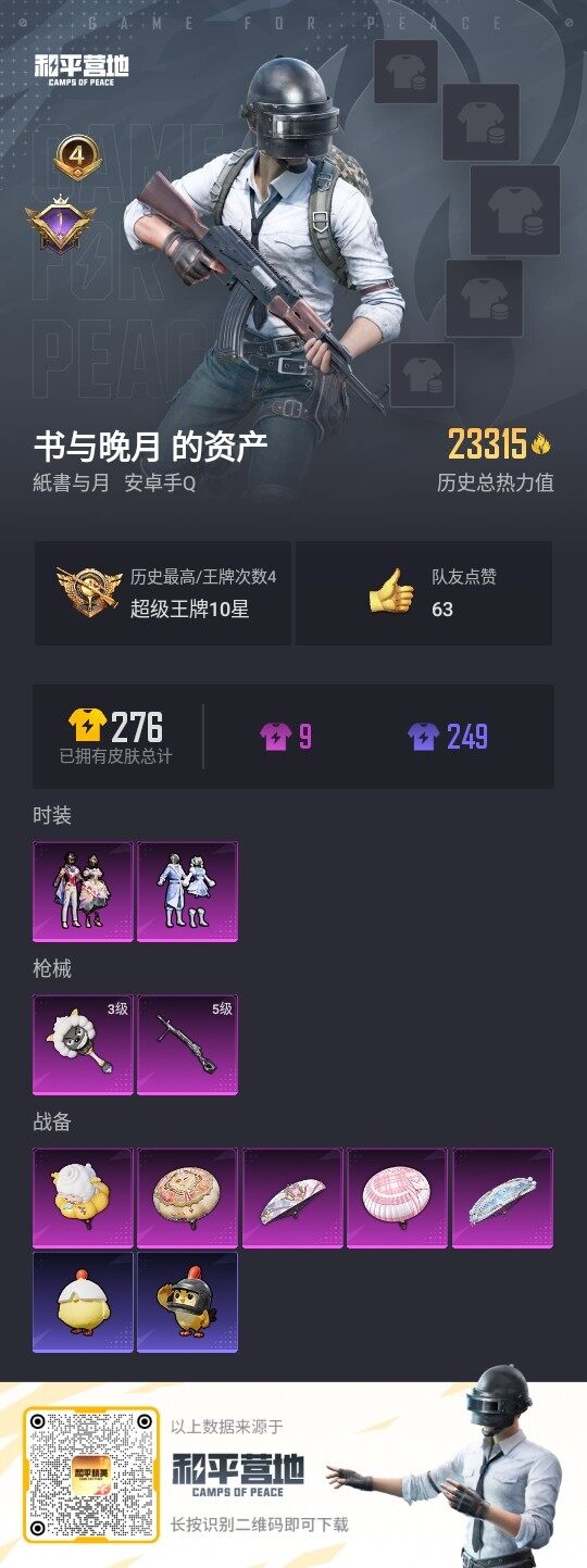 - [11626933]1粉装 4特效枪 6印记 可二次 可修改实名 优质装备:SLR暗夜玫瑰,M417第五大道,七级M417-第五大道,七级SLR-暗夜玫瑰,幻彩电音,Kar98K-巳巳如意 稀有枪皮:DP-28-豹影疾电 五级特效枪:五级Kar98K-巳巳如意,五级DP-28-豹影疾电 紫色装扮:田园牧歌,轻风白浪,和煦暖阳,SS22特训,莱茵河畔,SS23特训,幻彩翩翩,灵蜜圈圈,妙红点点,香榭午后,白兰地假日,娇憨猪猪,萌趣咩咩,SS21特训,SS31特训套装,冰川特警,冷焰舞者,旭日情侣,SS30特训套装,SS33特训套装,顶瓜瓜,SS20特训,魔力冰咖,都市魅力,长空猛禽,霓虹街区,青年教官,缤纷果语,耀眼新星,蓝色运动,街头潮人,超能勇士,魅力单车,鹤鸣,麻辣教官,黄色伏地魔,黄色名流,黄色运动,黑色伏地魔,龙的传人,龟仙人,冰河战士,龙魂突击队,柠萌假日,海岛探路者,涂山之恋,幻影武者,完美偶像,帅气教官,幻世战舞者,绮丽涂鸦,白色伏地魔,甜蜜告白,空岛之星,竞技达人朋克,王牌教练,牛气冲天,灰色格斗者,燃烧卡路里,猎鹰,SS29特训,星途旅人,纯真浪花,热情海星,SS28特训,玉兔迎春,巳巳如意,竞技名士,SS24特训(SS24特训套装),SS25特训,锦衣飞扬,焰鹰斗篷,幻羽潜行,幽夜迷踪,SS27特训,浪漫天命,SS26特训,春光漫游,快闪甜心,贝斯之夜,大橘大利,SS32特训服(SS32特训套装),青玉碎影,绯格组合,白糯汤圆,恋语绒绒,光之冒险 优质战备:圣堂之誓降落伞,星途旅人降落伞,繁龙极客降落伞,垂柳戏鸭降落伞,歌者泠鸢降落伞,第五大道降落伞,黄族统领降落伞,凝视深渊降落伞