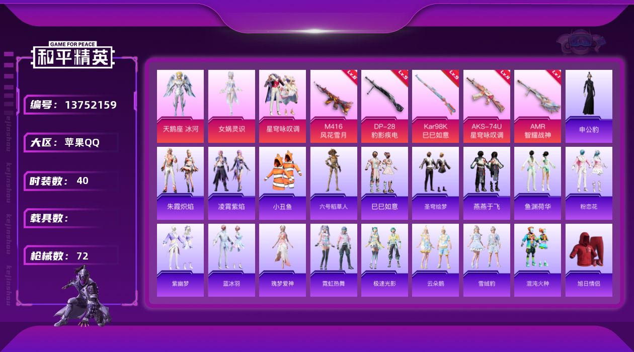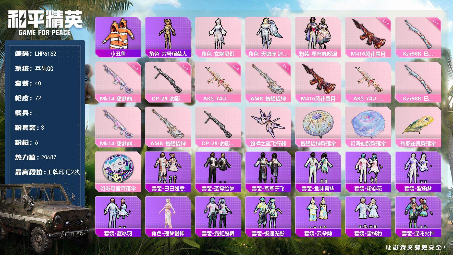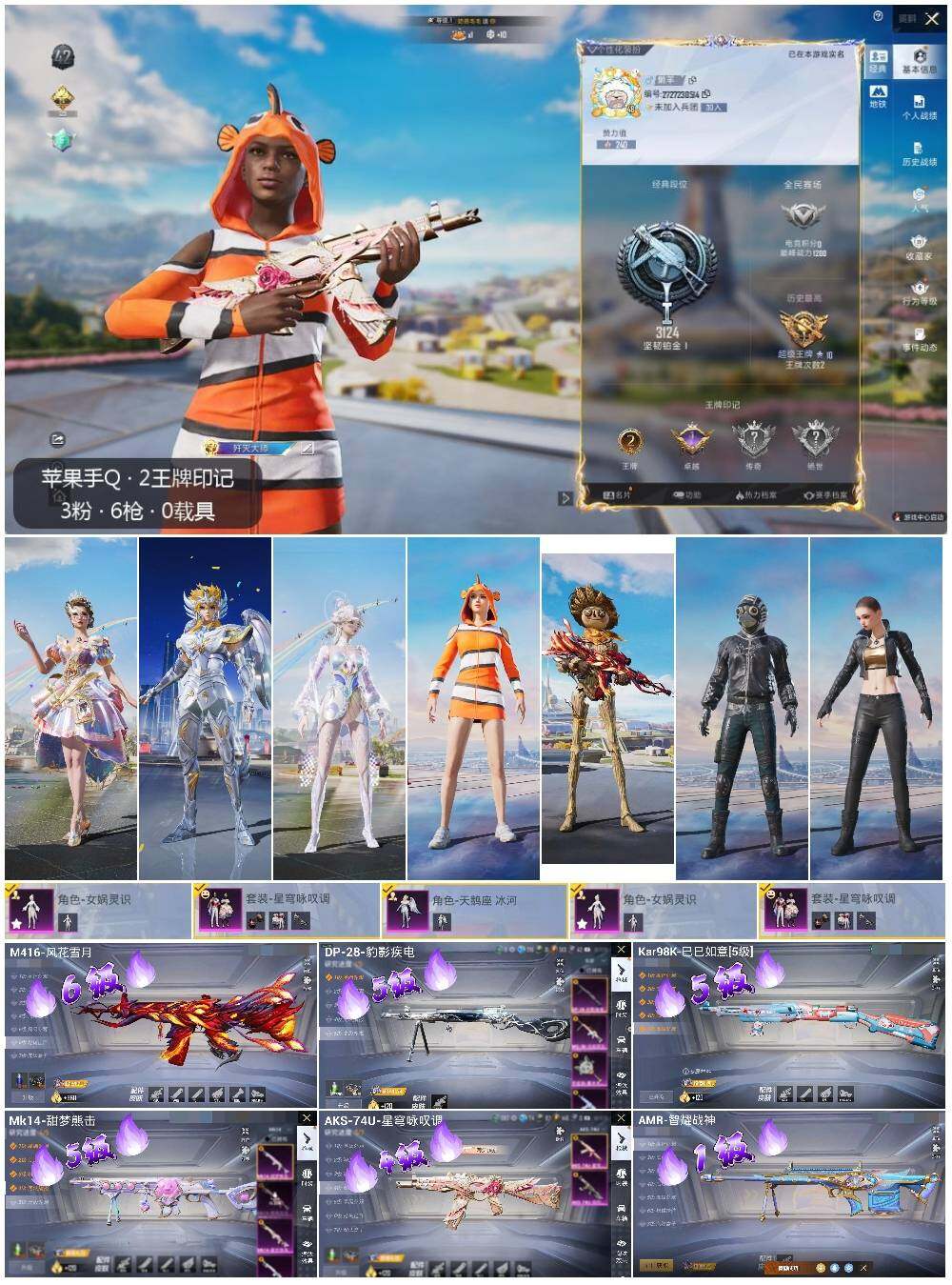[13752159]可二次【店主推荐捡漏号!可直接换绑】 苹果 手Q-3粉装-6特效枪-1粉色飞行器-2w热力值-2王牌印记-40套装-72枪皮【热门品类】:套装-小丑鱼,角色-六号稻草人【粉色套装】:角色-女娲灵识,角色-天鹅座 冰河,粉装-星穹咏叹调【粉色枪皮等级】:M416-风花雪月(六级),AKS-74U-星穹咏叹调(四级),Kar98K-巳巳如意(五级),Mk14-甜梦熊击(五级),AMR-智耀战神(一级),DP-28-豹影疾电(五级)【粉色飞行器】:终晖之翼飞行器