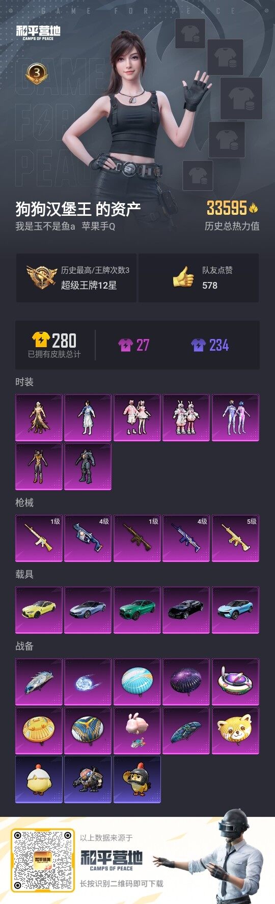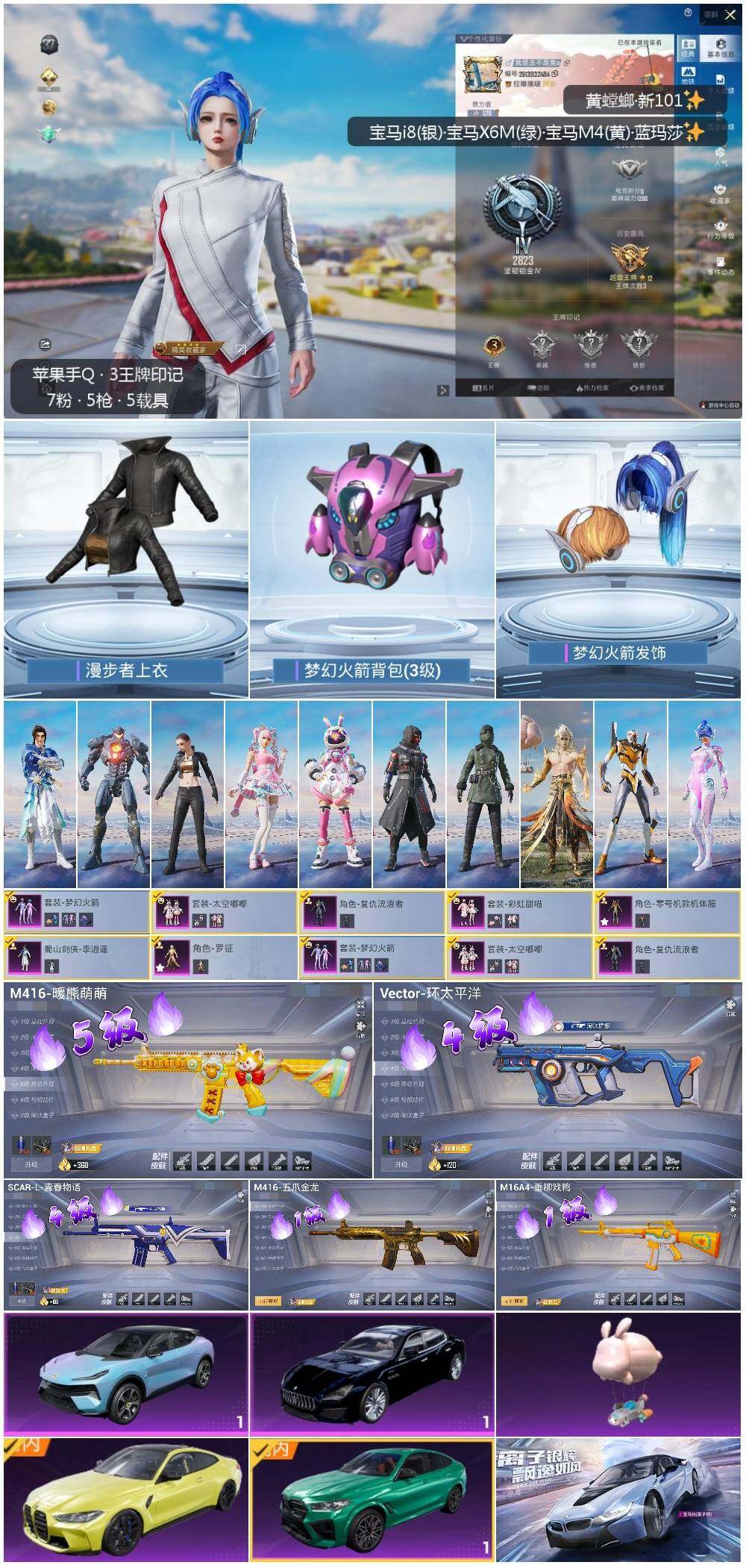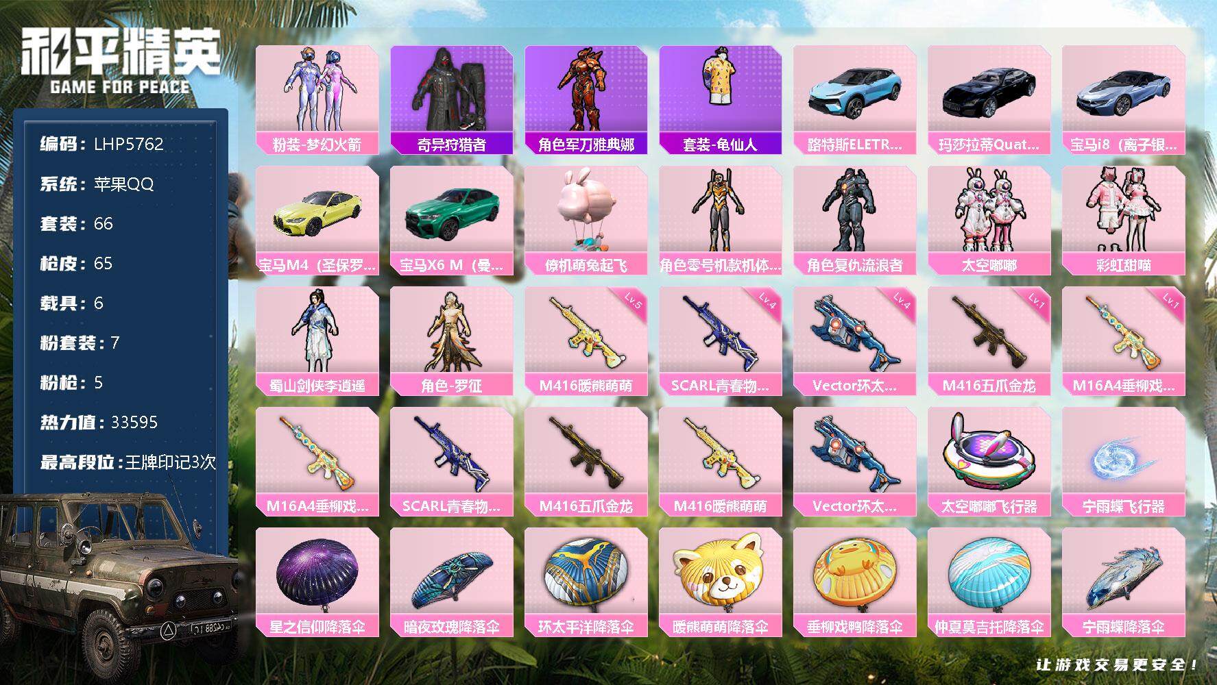 [13196750]素材身法号 苹果 手Q-7粉装-5特效枪-6载具-2粉色飞行器-3.3w热力值-3王牌印记-66套装-65枪皮【热门品类】:粉装-梦幻火箭,套装-奇异狩猎者,角色-军刀雅典娜,套装-龟仙人【粉色载具】:路特斯ELETRE(冰川蓝),玛莎拉蒂Quattroporte(夜幕蓝),宝马i8(离子银),宝马M4(圣保罗黄),宝马X6 M(曼岛绿),僚机-萌兔起飞【粉色套装】:粉装-梦幻火箭,角色-零号机款机体服,角色-复仇流浪者,粉装-太空嘟嘟,粉装-彩虹甜喵,蜀山剑侠-李逍遥,角色-罗征【粉色枪皮等级】:M16A4-垂柳戏鸭(一级),SCAR-L-青春物语(四级),M416-五爪金龙(一级),M416-暖熊萌萌(五级),Vector-环太平洋(四级)【粉色飞行器】:太空嘟嘟飞行器,宁雨蝶飞行器