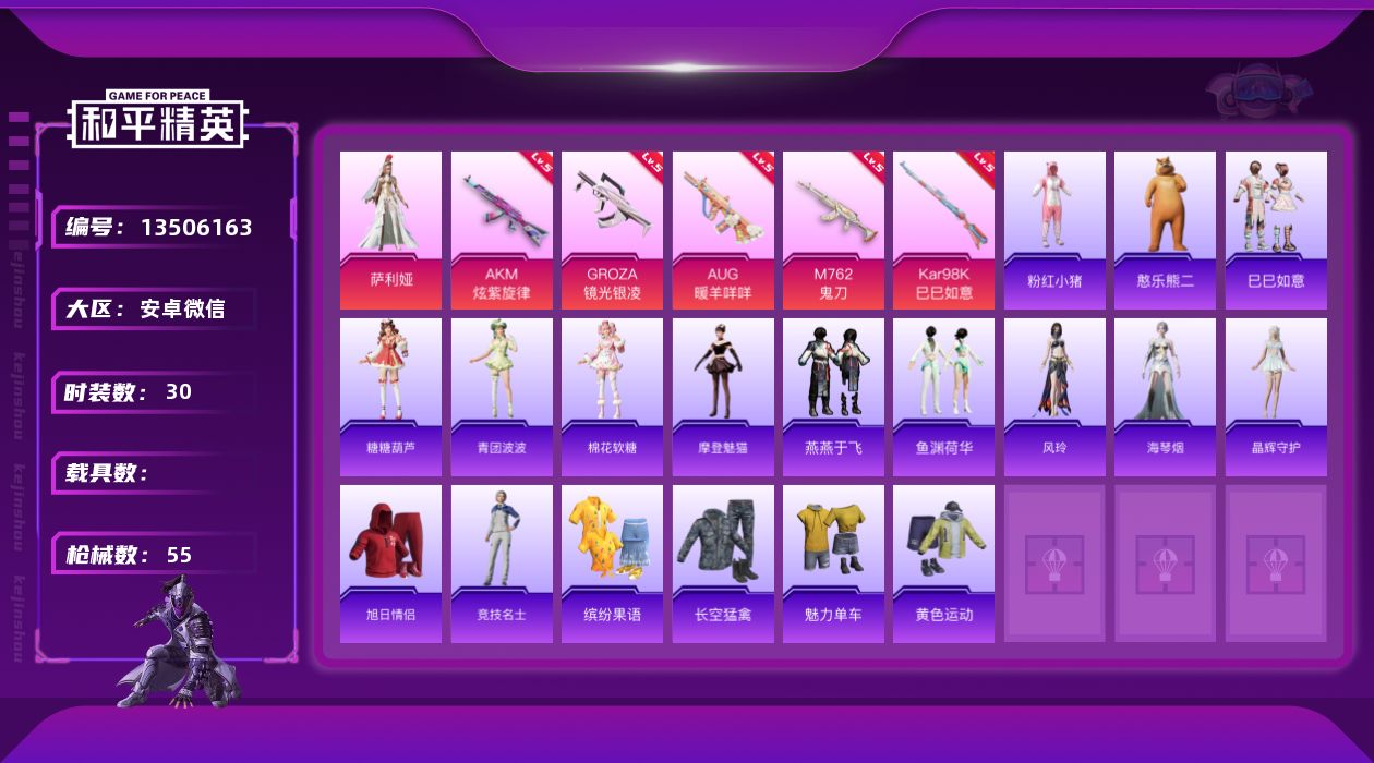 AKM-炫紫旋律,GROZA-镜光银凌,AUG-暖羊咩咩,M762-鬼刀,Kar98K-巳巳如意