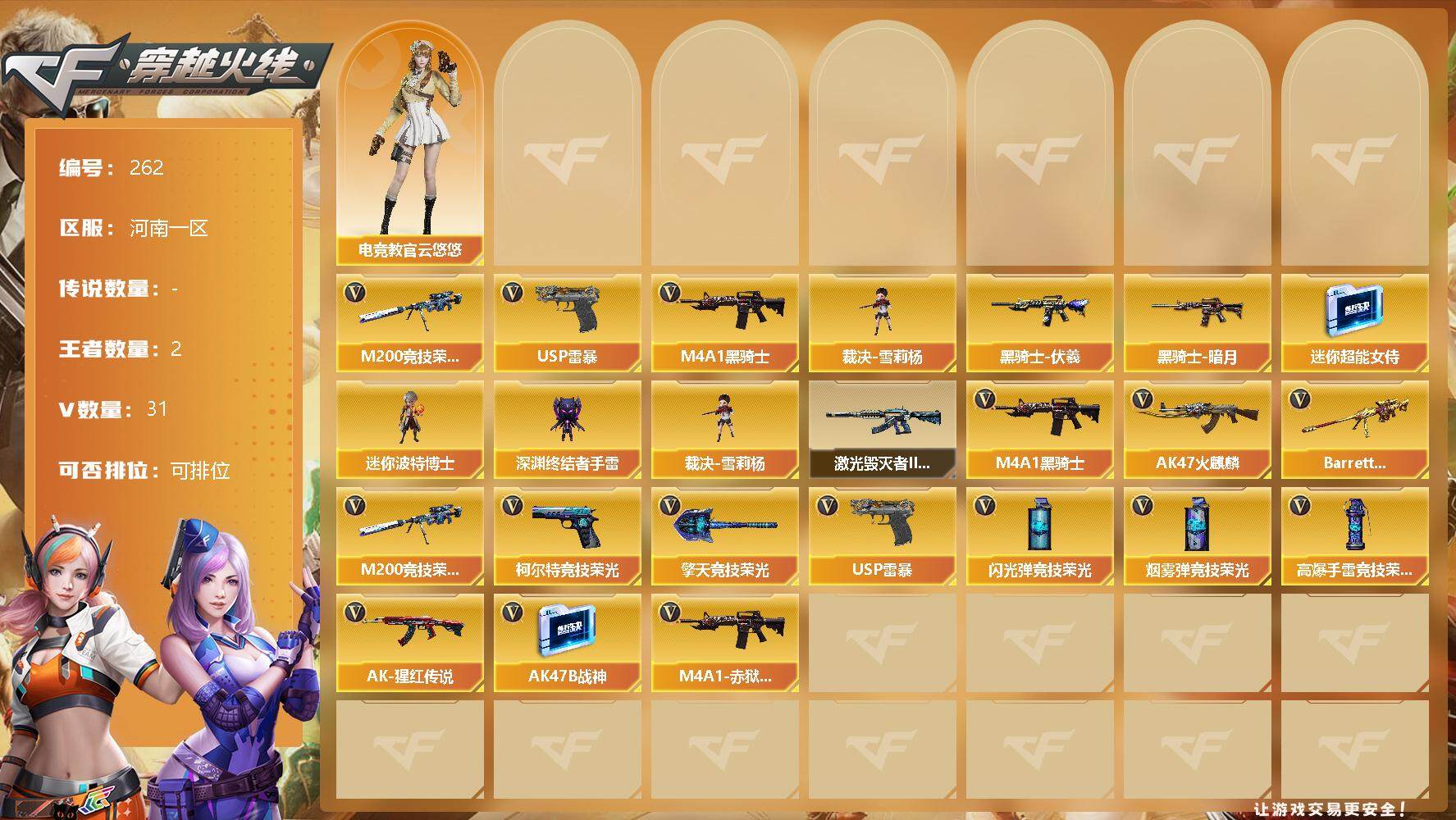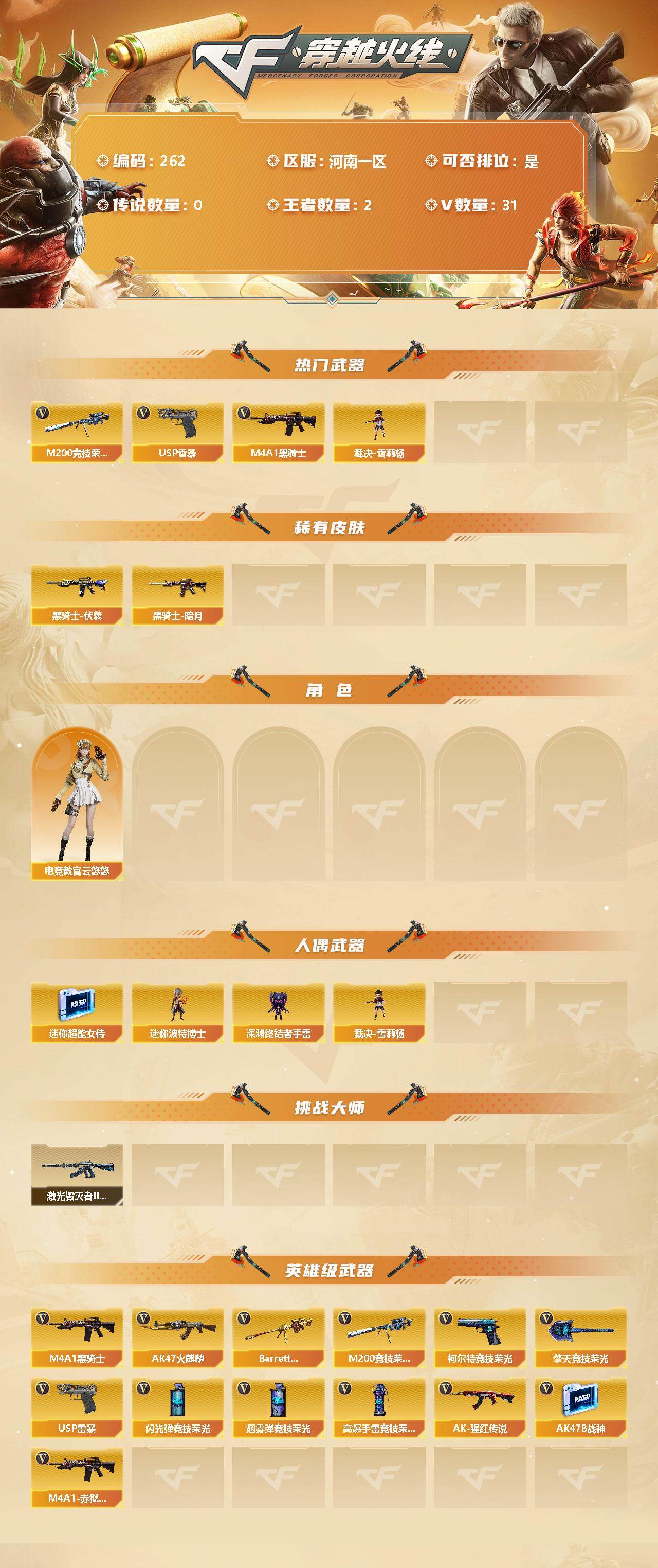 [13217220]河南一区-31V-2王者-0炫金 【热门武器】:M200-竞技荣光,M4A1-黑骑士,裁决-雪莉杨,USP-雷暴 【稀有皮肤】:黑骑士-暗月,黑骑士-伏羲 【角色】:电竞教官-云悠悠 【人偶武器】:裁决-雪莉杨,迷你超能女侍,迷你波特博士,深渊终结者手雷 【挑战大师】:激光毁灭者III-白马银枪 【英雄级武器】:M200-竞技荣光,柯尔特-竞技荣光,擎天-竞技荣光,高爆手雷-竞技荣光*6,烟雾弹-竞技荣光*7,闪光弹-竞技荣光*7,USP-雷暴,M4A1-黑骑士,AK47-火麒麟,Barrett-朱雀,AK-47-猩红传说,AK47-B-战神,M4A1-赤狱骑士 【特殊枪械】:1黑骑士