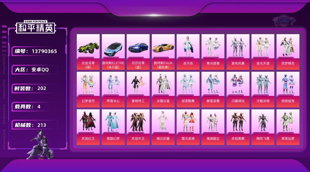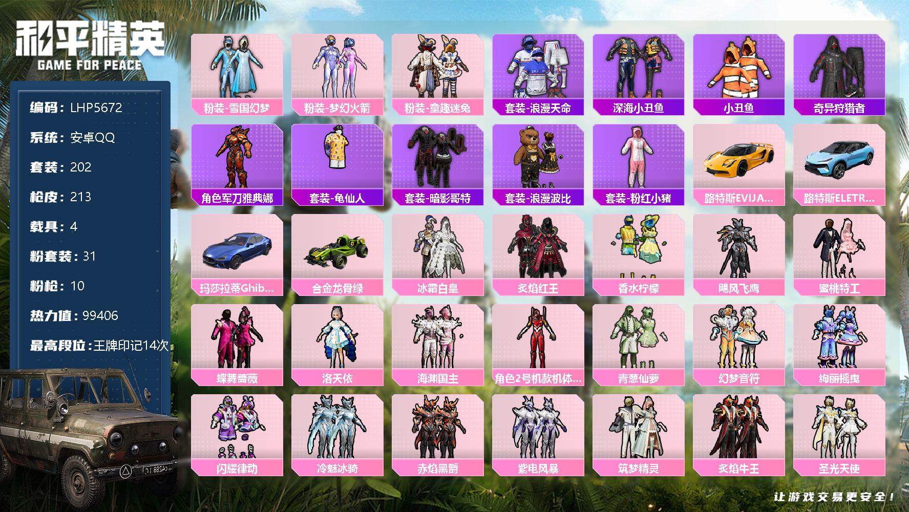 [13790365]素材身法号 安卓 手Q-31粉装-10特效枪-4载具-4粉色飞行器-9.9w热力值-14王牌印记-202套装-213枪皮【热门品类】:粉装-雪国幻梦,粉装-梦幻火箭,粉装-童趣迷兔,套装-浪漫天命,套装-深海小丑鱼,套装-小丑鱼,套装-奇异狩猎者,角色-军刀雅典娜,套装-龟仙人,套装-暗影哥特,套装-浪漫波比,套装-粉红小猪【粉色载具】:路特斯EVIJA(星际黄),路特斯ELETRE(冰川蓝),玛莎拉蒂Ghibli(蓝),合金龙骨(绿)【粉色套装】:粉装-雪国幻梦,粉装-梦幻火箭,粉装-冰霜白皇,粉装-童趣迷兔,粉装-炙焰红王,粉装-香水柠檬,粉装-飓风飞鹰,粉装-蜜桃特工,粉装-蝶舞蔷薇,角色-洛天依,粉装-海渊国主,角色-2号机款机体服,粉装-青葱仙萝,粉装-幻梦音符,粉装-绚丽摇曳,粉装-闪耀律动,粉装-冷魅冰骑,粉装-赤焰黑爵,粉装-紫电风暴,粉装-筑梦精灵,粉装-炙焰牛王,粉装-圣光天使,角色-复仇流浪者,粉装-绒雪飘舞,粉装-傲雪凌霜,粉装-霁雪冰心,粉装-彩虹甜喵,粉装-霞光圣骑,粉装-寒光使者,角色-烟云彩露,角色-奇迹舞步 美琪【粉色枪皮等级】:AKM-梦之光华(七级),SCAR-L-童趣迷兔(七级),SCAR-L-青春物语(五级),M416-五爪金龙(七级),UZI-筑梦精灵(七级),UMP45-雪国精灵(七级),Vector-环太平洋(七级),Kar98K-巳巳如意(五级),SLR-暗夜玫瑰(四级),DP-28-豹影疾电(四级)【粉色飞行器】:梦幻火箭飞行器,幻梦音符飞行器,冷魅冰骑飞行器,星夜魔法师飞行翼
