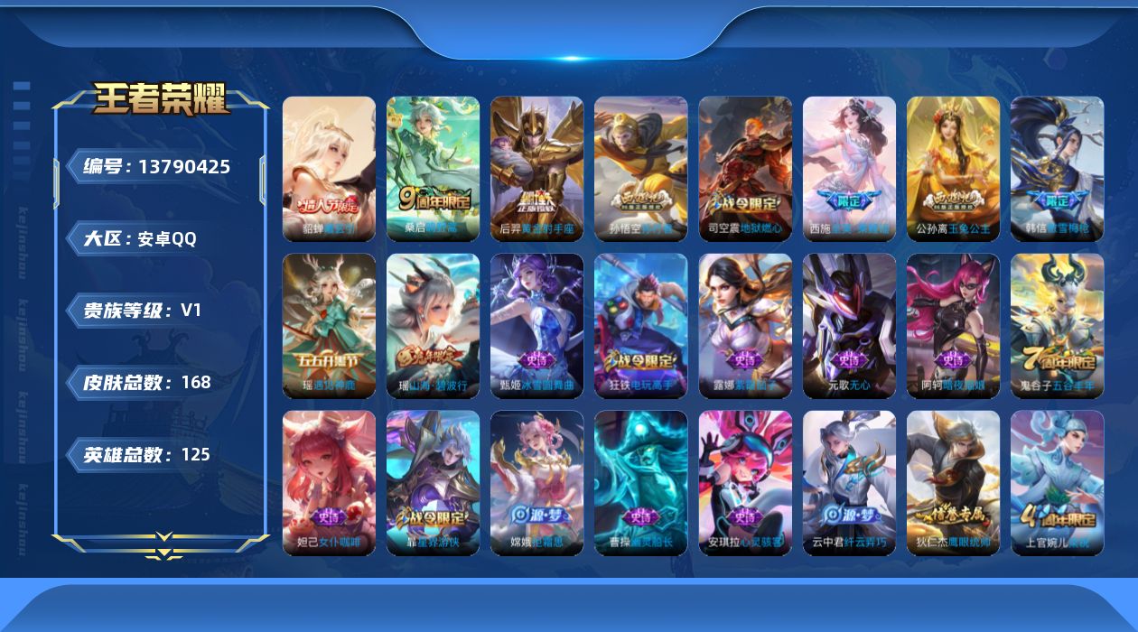 - [11602652]V7 2典藏 4传说 122英雄 270皮肤 可修改实名 荣耀水晶:鸣剑·曳影,弑枪猎影(韩信典藏) 传说皮:淬星耀世,山海·苍雷引(电光曜子) 珍宝阁皮:女武神,玩趣恶龙 限定皮:鸣野蒿,至尊宝,遇见飞天,匿光决锋者,五谷丰年,梁祝,天狼溯光者,李小龙,引擎之心,冰霜恋舞曲,枫霜尽 史诗皮:紫霞仙子,电玩小子(小书包),白龙吟,黄金分割率,特工魅影,千年之狐,永昼,江河有灵,高渐离燃音魔法,百解令(蒙犽),冰冠公主,偶像歌手,电玩·爆裂旋风,百相守梦(关羽),龙骑士(小龙虾),末日机甲-吕布,猫狗日记-孙策,猫狗日记-大乔,乱世虎臣,节奏热浪,女仆咖啡,摇滚巨星,水果甜心,绅士熊喵,天才门将,星夜王子,心灵骇客,功夫厨神,德古拉伯爵,暗隐猎兽者,幽灵船长,鬼剑武藏,心灵战警,舞动绿茵,纤云弄巧,繁星吟游(呼啦呼啦),拒霜思,缤纷独角兽,乘风破浪,逐浪之夏,水晶猎龙者,曙光守护者,箭羽风息,金属风暴,圣诞狂欢,圣诞恋歌,鹰眼统帅,暗夜贵公子,魅力维加斯,无心,未来纪元-赵云