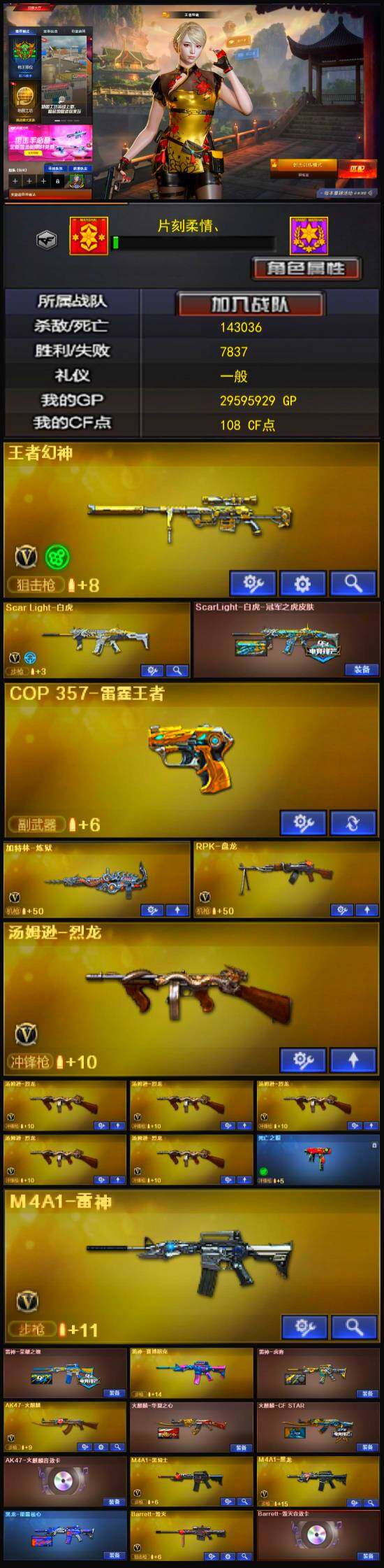 【热门武器】:Scar Light-白虎,金色蔷薇-古蛇迷踪,修罗-古蛇迷踪,死亡之眼,荣耀世冠-雷神,M4A1-黑骑士,汤姆逊-烈龙*6,RPK-盘龙,加特林-炼狱,羊驼玩偶,降世魔童,雷神-小红,COP 357-雷霆王者,沙鹰-修罗*2