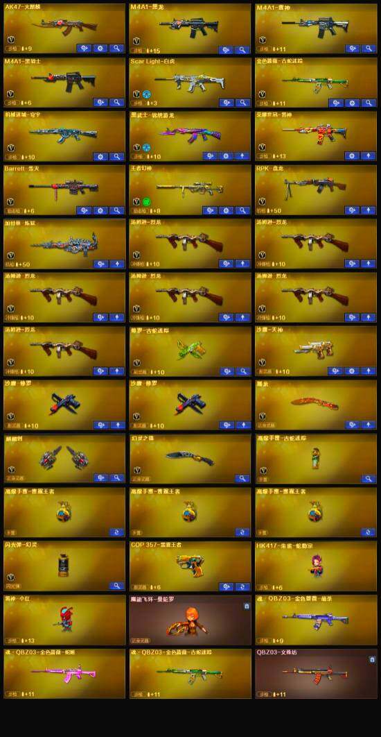 【英雄级武器】:AK47-火麒麟,M4A1-黑龙,M4A1-雷神,M4A1-黑骑士,Scar Light-白虎,黑武士-锦绣游龙,金色蔷薇-古蛇迷踪,荣耀世冠-雷神,Barrett-毁灭,王者幻神-觉醒版,RPK-盘龙,加特林-炼狱,汤姆逊-烈龙*6,沙鹰-修罗*2,沙鹰-天神,修罗-古蛇迷踪,屠龙,麒麟刺,幻灵之锋,高爆手雷-古蛇迷踪,闪光弹-幻灵,烟雾弹-古蛇迷踪,M4A1-赤狱骑士
