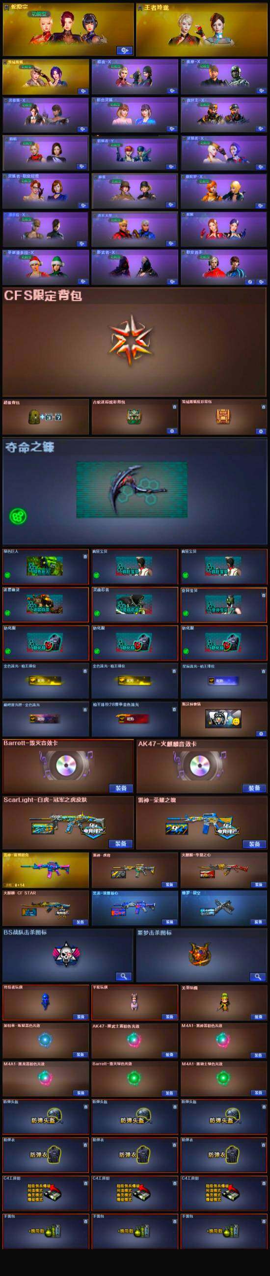 【道具】:CFS限定背包,古蛇迷踪炫彩背包,炫彩背包,超级背包,雪域霜狐炫彩背包,救世主-黑桃战神,绿色巨人,灵魂忍者,变异宝贝,迷雾幽灵,夺命之镰,防化服*3,金色流光-枪王排位*2,星辰流光-枪王排位,巅峰赛先锋-金色流光,枪王排位28赛季金色流光,枪王排位29赛季金色流光,古蛇迷踪打击特效,雪域霜狐表情,蛇隐宗表情,斯沃特表情,EP战队名片,EP战队喷图,防弹头盔*3,防弹衣*3,C4工具钳*3,手雷包*3