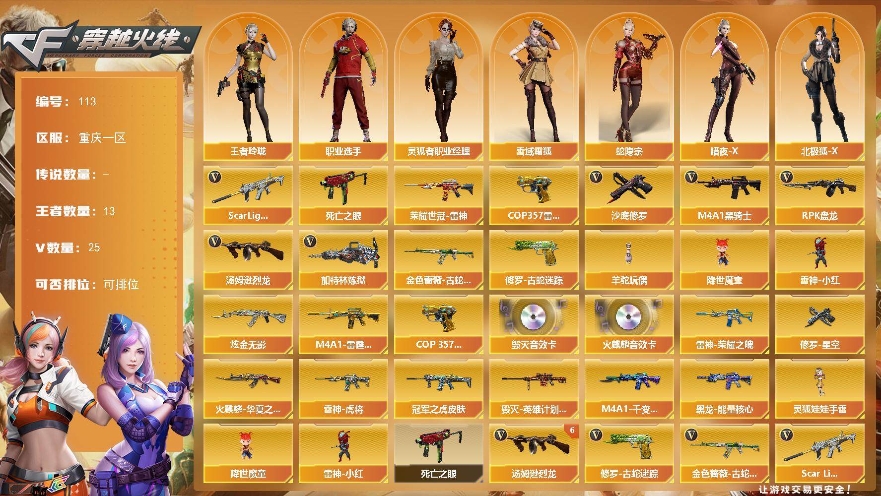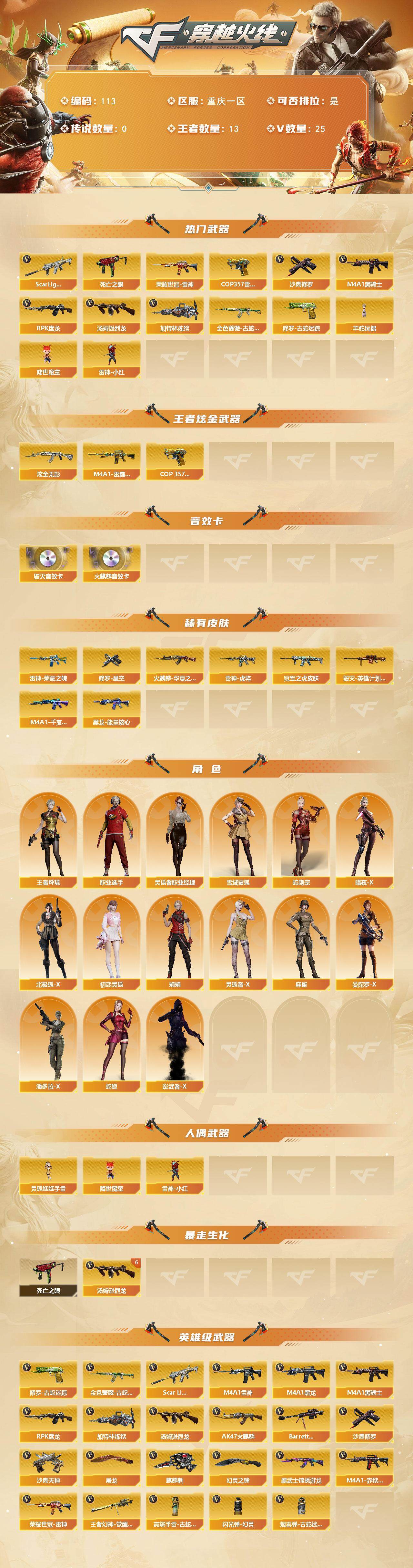 [13790455]重庆一区-25V-13王者-1炫金 【热门武器】:Scar Light-白虎,金色蔷薇-古蛇迷踪,修罗-古蛇迷踪,死亡之眼,荣耀世冠-雷神,M4A1-黑骑士,汤姆逊-烈龙*6,RPK-盘龙,加特林-炼狱,羊驼玩偶,降世魔童,雷神-小红,COP 357-雷霆王者,沙鹰-修罗*2 【王者炫金武器】:M4A1-雷霆王者,COP 357-雷霆王者,炫金无影 【音效卡】:AK47-火麒麟音效卡,Barrett-毁灭音效卡 【皮肤】:ScarLight-白虎-冠军之虎皮肤,雷神-荣耀之魄,雷神-虎将,火麒麟-华夏之心,毁灭-英雄计划 皮肤,M4A1-千变-孔明皮肤,黑龙-能量核心,修罗-星空 【角色】:王者玲珑,雪域霜狐,蛇隐宗,暗夜-X,北极狐-X,初恋灵狐,娟娟,灵狐者-X,灵狐者-职业经理,麻雀,曼陀罗-X,潘多拉-X,蛇姬,影武者-X,职业选手 【人偶武器】:雷神-小红,灵狐娃娃手雷,降世魔童 【暴走生化】:死亡之眼 【英雄级武器】:AK47-火麒麟,M4A1-黑龙,M4A1-雷神,M4A1-黑骑士,Scar Light-白虎,黑武士-锦绣游龙,金色蔷薇-古蛇迷踪,荣耀世冠-雷神,Barrett-毁灭,王者幻神-觉醒版,RPK-盘龙,加特林-炼狱,汤姆逊-烈龙*6,沙鹰-修罗*2,沙鹰-天神,修罗-古蛇迷踪,屠龙,麒麟刺,幻灵之锋,高爆手雷-古蛇迷踪,闪光弹-幻灵,烟雾弹-古蛇迷踪,M4A1-赤狱骑士 【道具】:CFS限定背包,古蛇迷踪炫彩背包,炫彩背包,超级背包,雪域霜狐炫彩背包,救世主-黑桃战神,绿色巨人,灵魂忍者,变异宝贝,迷雾幽灵,夺命之镰,防化服*3,金色流光-枪王排位*2,星辰流光-枪王排位,巅峰赛先锋-金色流光,枪王排位28赛季金色流光,枪王排位29赛季金色流光,古蛇迷踪打击特效,雪域霜狐表情,蛇隐宗表情,斯沃特表情,EP战队名片,EP战队喷图,防弹头盔*3,防弹衣*3,C4工具钳*3,手雷包*3 【特殊枪械】:1白虎,1黑骑士,6烈龙,1盘龙,1炼狱