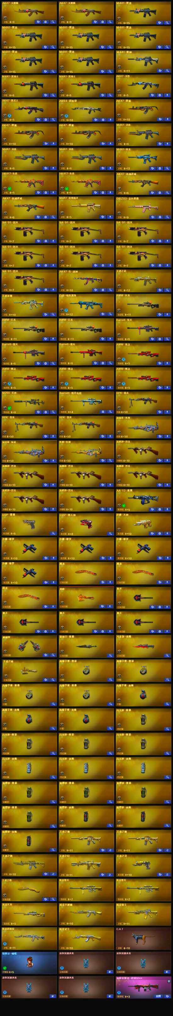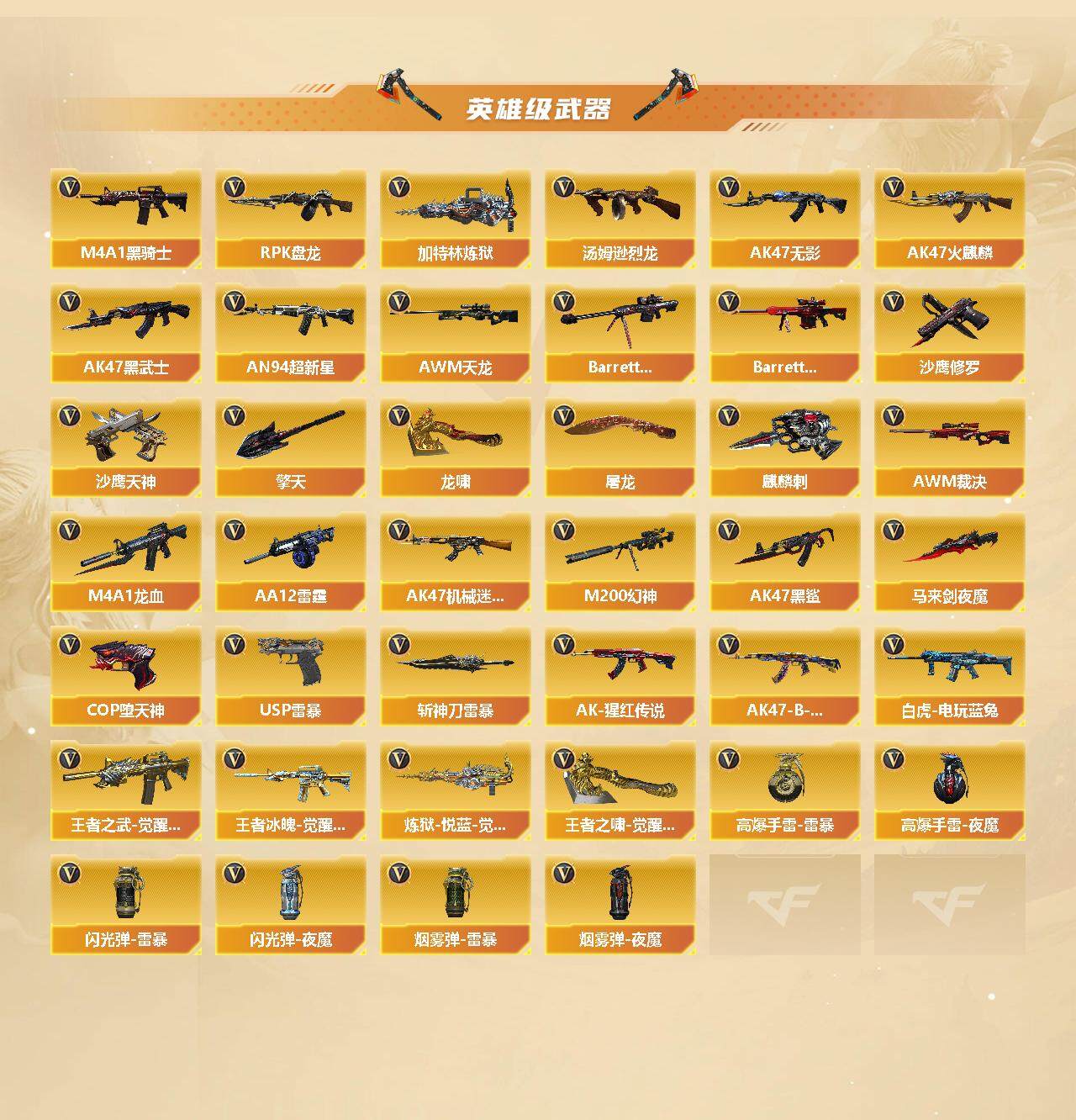 【英雄级武器】:AK47-火麒麟*2,M4A1-黑龙*6,M4A1-雷神,M4A1-黑骑士*2,AK47-无影,AK47-黑武士,AN94-超新星,AK47-机械迷城*2,AK47-黑鲨*3,M4A1-龙血*3,M4A1-青龙,HK417-朱雀*2,M4A1-玫瑰精灵,QBZ03-金色蔷薇,王者之武-觉醒版,AK-47-猩红传说*4,AK47-B-战神,王者冰魄-觉醒版,白虎-电玩蓝兔,AWM-天龙*3,Barrett-毁灭*2,Barrett-极光,AWM-裁决*4,M200-幻神,RPK-盘龙*3,加特林-炼狱*2,炼狱-悦蓝-觉醒版,汤姆逊-烈龙*6,AA-12-雷霆,沙鹰-修罗*4,沙鹰-天神,USP-雷暴,C