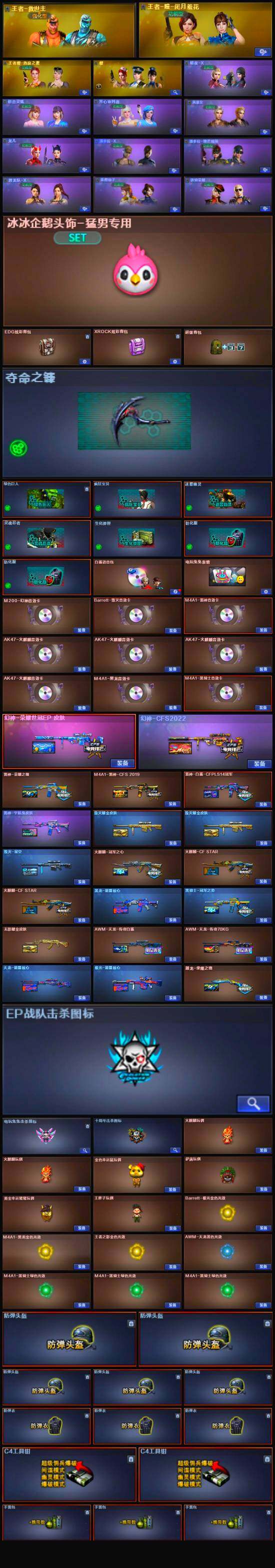 【皮肤】:幻神-CFS2022,幻神-荣耀世冠EP 皮肤,雷神-荣耀之魄,M4A1-雷神-CFS 2019,雷神-宇航兔皮肤,火麒麟-冠军之心,毁灭耀金皮肤*2,毁灭-星空,M4A1-千变-孔明皮肤,黑龙-能量核心,黑骑士-冠军之势,无影耀金皮肤,战神-紫绶金章皮肤*12,战神-流金岁月皮肤*7,AK47-B-常胜将军-孙权,天龙-能量核心,AWM-天龙-传奇70KG,AWM-天龙-传奇白鲨,极光-能量核心,屠龙-荣耀之锋