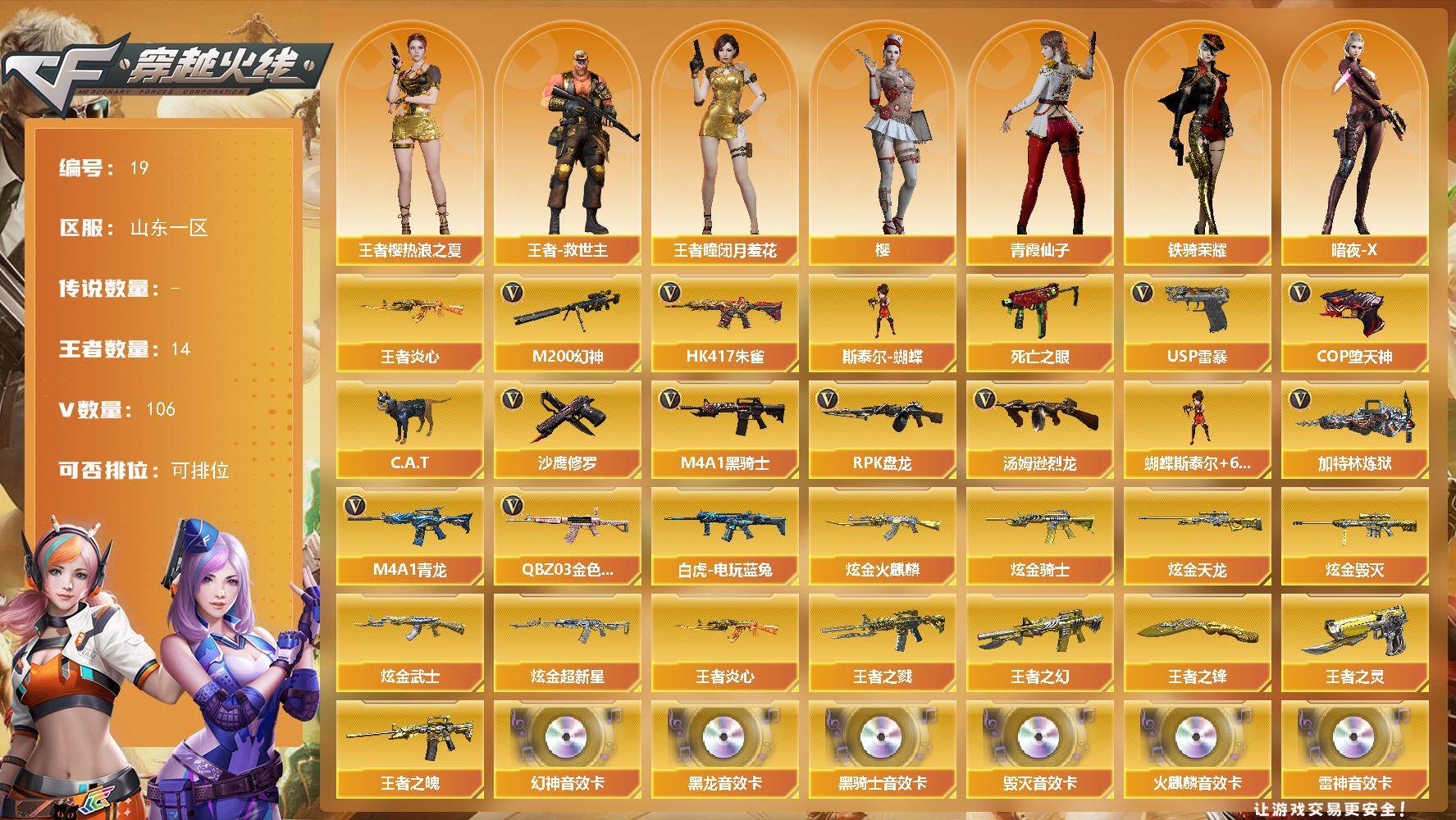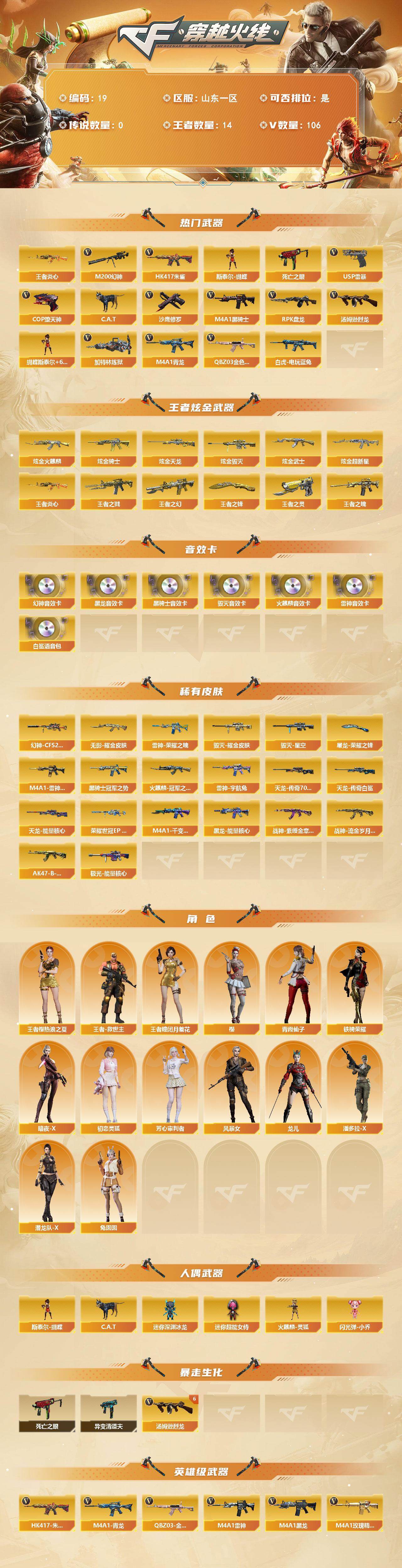 [13557893]山东一区-106V-14王者-7炫金 【热门武器】:QBZ03-金色蔷薇,HK417-朱雀*2,M4A1-青龙,M200-幻神,死亡之眼*2,白虎-电玩蓝兔,王者炎心,C.A.T,M4A1-黑骑士*2,汤姆逊-烈龙*6,RPK-盘龙*3,加特林-炼狱*2,斯泰尔-蝴蝶,USP-雷暴,COP-堕天神,沙鹰-修罗*4 【王者炫金武器】:王者炎心,王者之戮,王者之幻,王者之魄*2,王者之灵,王者之锋,炫金火麒麟,炫金骑士,炫金武士,炫金超新星,炫金毁灭*2,炫金天龙 【音效卡】:M200-幻神音效卡,AK47-火麒麟音效卡*4,M4A1-雷神音效卡,M4A1-黑龙音效卡,M4A1-黑骑士音效卡,Barrett-毁灭音效卡,白鲨语音包 【皮肤】:幻神-CFS2022,幻神-荣耀世冠EP 皮肤,雷神-荣耀之魄,M4A1-雷神-CFS 2019,雷神-宇航兔皮肤,火麒麟-冠军之心,毁灭耀金皮肤*2,毁灭-星空,M4A1-千变-孔明皮肤,黑龙-能量核心,黑骑士-冠军之势,无影耀金皮肤,战神-紫绶金章皮肤*12,战神-流金岁月皮肤*7,AK47-B-常胜将军-孙权,天龙-能量核心,AWM-天龙-传奇70KG,AWM-天龙-传奇白鲨,极光-能量核心,屠龙-荣耀之锋 【角色】:樱,王者-瞳-闭月羞花,王者樱-热浪之夏,王者-救世主,暗夜-X,初恋灵狐,芳心审判者,风暴女,龙儿,潘多拉-X,潜龙队-X,青霞仙子,铁骑荣耀,兔囡囡 【人偶武器】:火麒麟-灵狐*4,斯泰尔-蝴蝶,C.A.T,迷你深渊冰龙*4,闪光弹-小乔,迷你超能女侍 【暴走生化】:异变清道夫,死亡之眼*2 【英雄级武器】:AK47-火麒麟*2,M4A1-黑龙*6,M4A1-雷神,M4A1-黑骑士*2,AK47-无影,AK47-黑武士,AN94-超新星,AK47-机械迷城*2,AK47-黑鲨*3,M4A1-龙血*3,M4A1-青龙,HK417-朱雀*2,M4A1-玫瑰精灵,QBZ03-金色蔷薇,王者之武-觉醒版,AK-47-猩红传说*4,AK47-B-战神,王者冰魄-觉醒版,白虎-电玩蓝兔,AWM-天龙*3,Barrett-毁灭*2,Barrett-极光,AWM-裁决*4,M200-幻神,RPK-盘龙*3,加特林-炼狱*2,炼狱-悦蓝-觉醒版,汤姆逊-烈龙*6,AA-12-雷霆,沙鹰-修罗*4,沙鹰-天神,USP-雷暴,C