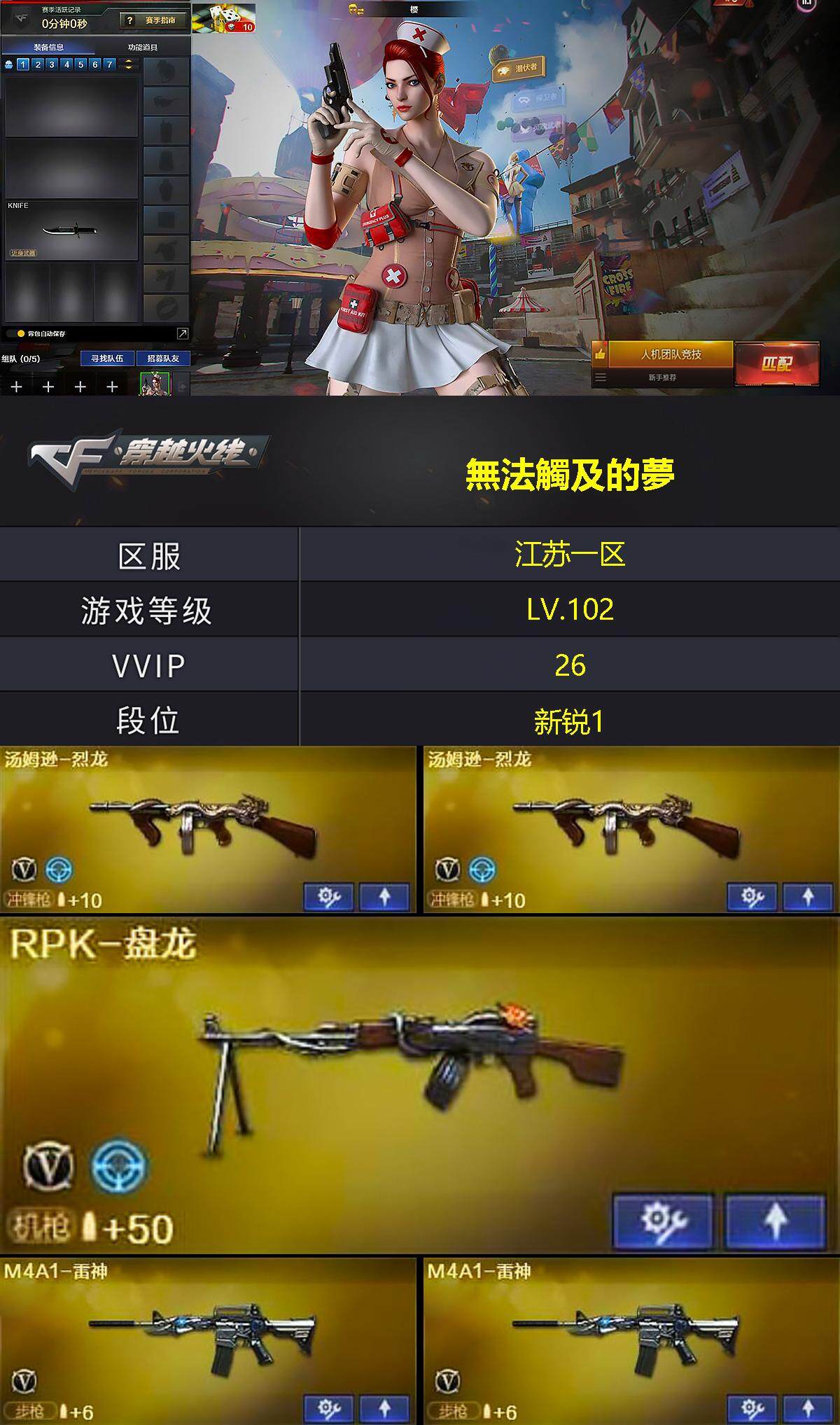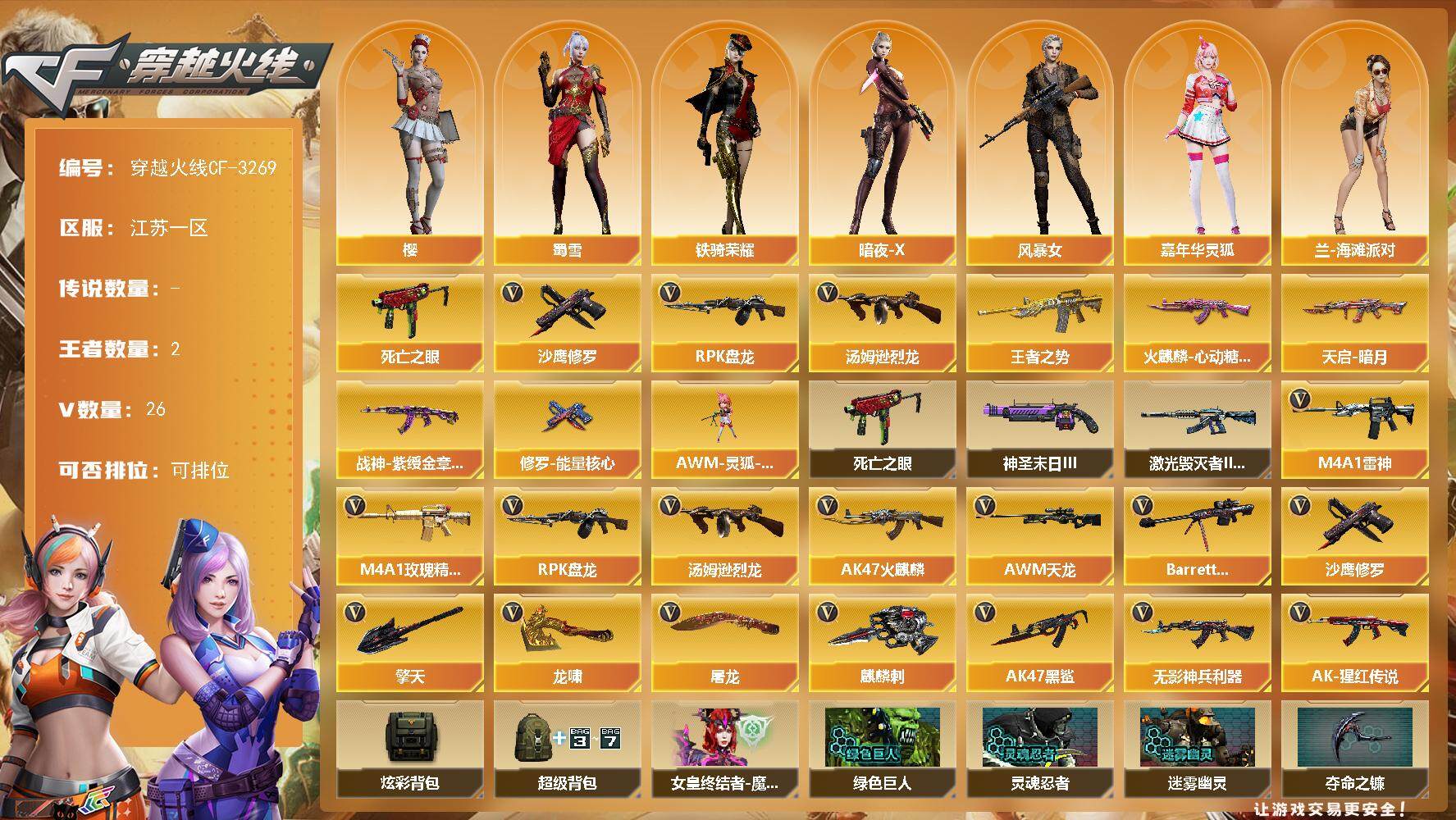 [13783559]江苏一区-26V-2王者-0炫金 【热门武器】:死亡之眼,汤姆逊-烈龙*2,RPK-盘龙,沙鹰-修罗 【王者炫金武器】:王者之势 【皮肤】:火麒麟-心动糖果,天启-暗月,战神-紫绶金章皮肤*2,修罗-能量核心 【角色】:樱,暗夜-X,风暴女,嘉年华灵狐,兰-海滩派对,龙儿,麻雀,斯沃特-X,蜀雪,铁骑荣耀,雪莉杨 【人偶武器】:AWM-灵狐-15周年嘉年华 【暴走生化】:死亡之眼 【挑战大师】:激光毁灭者III-白马银枪,神圣爆裂者-末日III 【英雄级武器】:AK47-火麒麟*2,M4A1-雷神*2,AK47-黑鲨,无影-神兵利器,M4A1-玫瑰精灵,AK-47-猩红传说*3,AWM-天龙,Barrett-毁灭,RPK-盘龙,汤姆逊-烈龙*2,沙鹰-修罗,屠龙*2,龙啸*2,擎天,麒麟刺*2 【道具】:炫彩背包,超级背包,女皇终结者-魔龙之吻,绿色巨人,灵魂忍者,迷雾幽灵,夺命之镰,防化服*3,金色流光-枪王排位*2,星辰流光-枪王排位,流光-鎏金之域,枪王排位29赛季金色流光,防弹头盔*2,防弹衣*2,C4工具钳*2,手雷包*2 【特殊枪械】:2烈龙,1盘龙