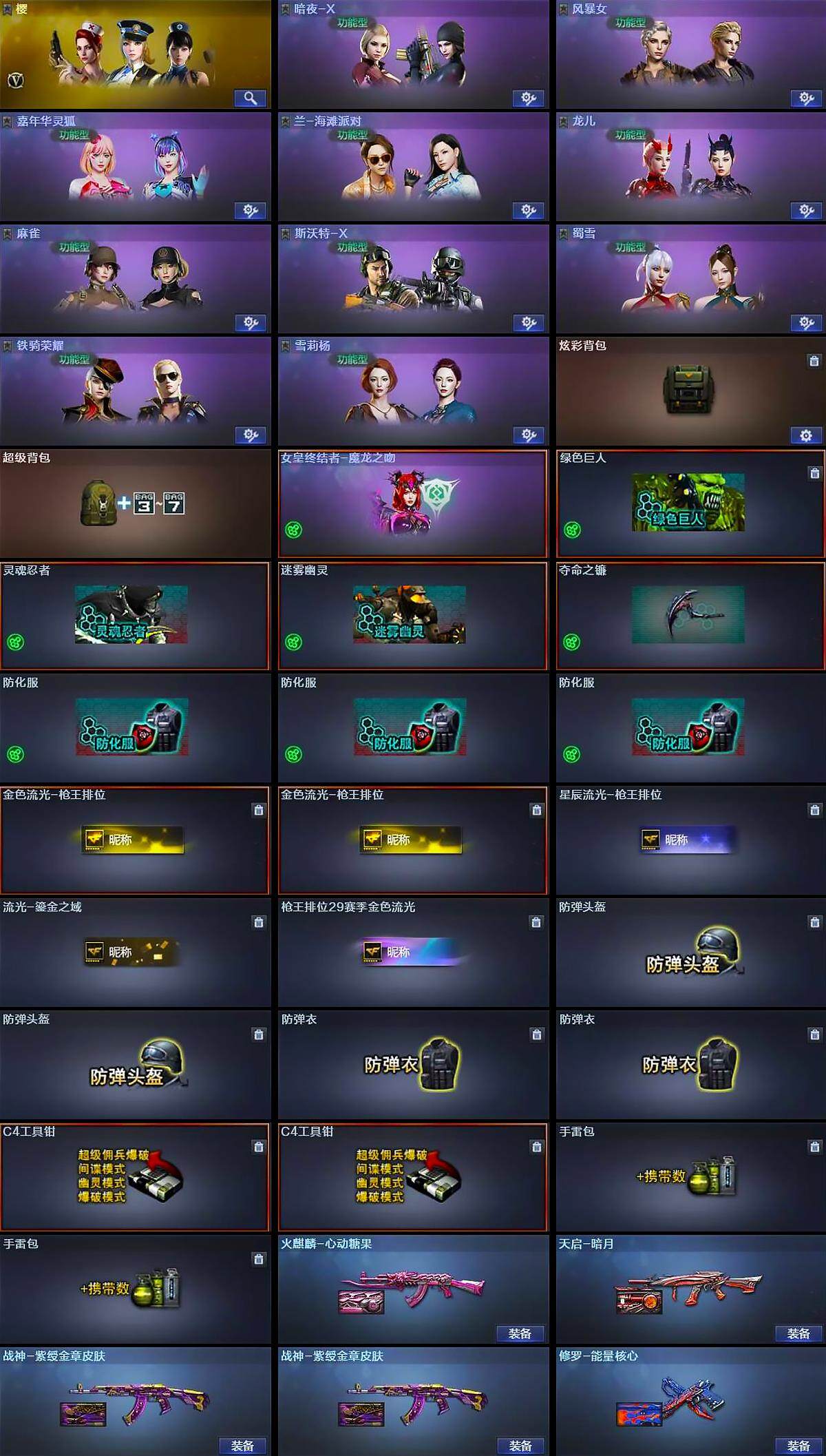 【道具】:炫彩背包,超级背包,女皇终结者-魔龙之吻,绿色巨人,灵魂忍者,迷雾幽灵,夺命之镰,防化服*3,金色流光-枪王排位*2,星辰流光-枪王排位,流光-鎏金之域,枪王排位29赛季金色流光,防弹头盔*2,防弹衣*2,C4工具钳*2,手雷包*2