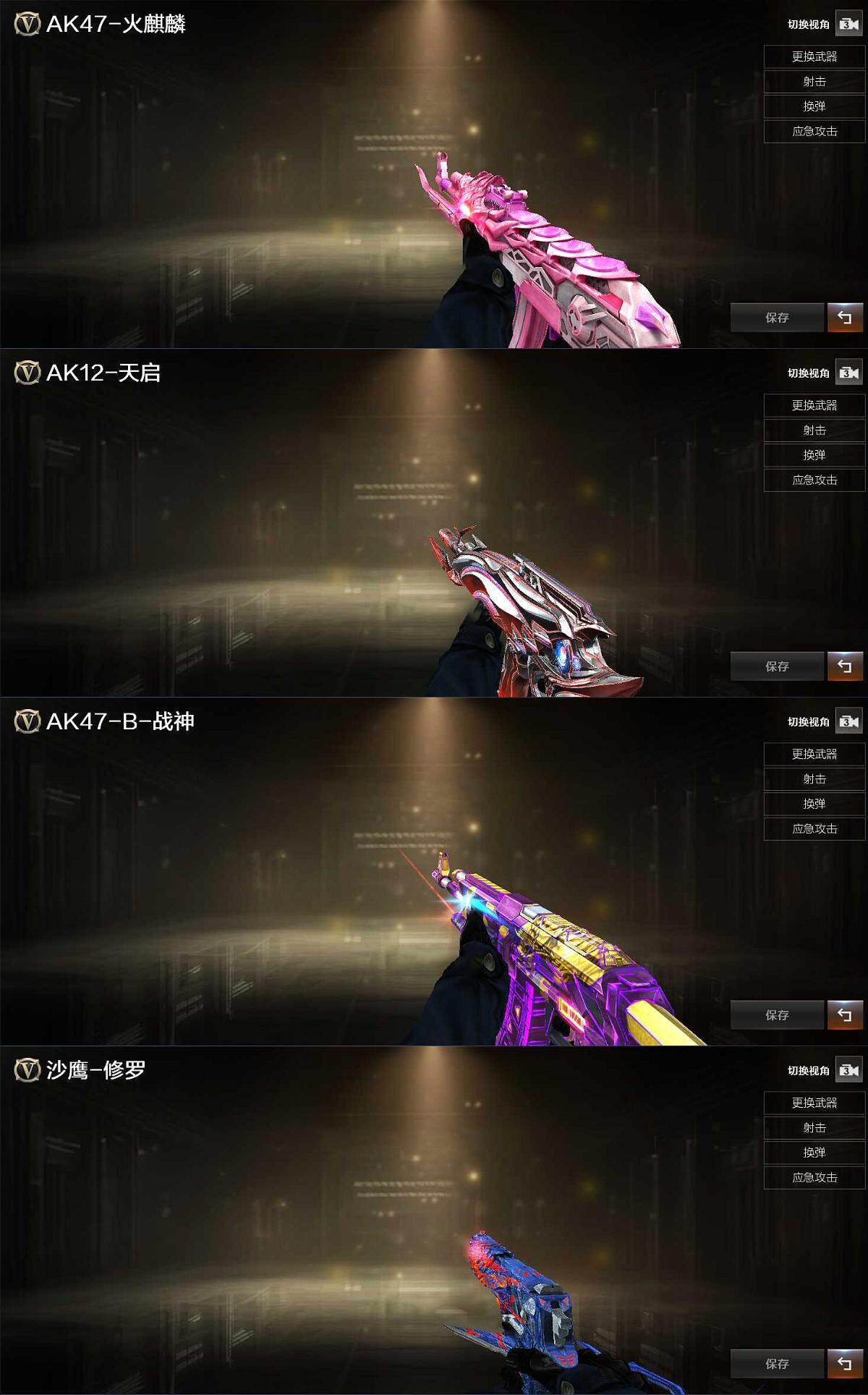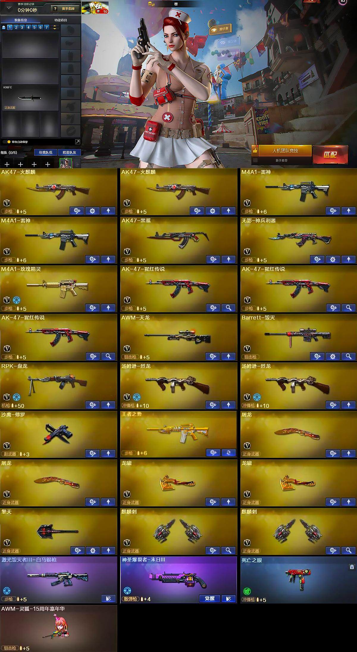 【英雄级武器】:AK47-火麒麟*2,M4A1-雷神*2,AK47-黑鲨,无影-神兵利器,M4A1-玫瑰精灵,AK-47-猩红传说*3,AWM-天龙,Barrett-毁灭,RPK-盘龙,汤姆逊-烈龙*2,沙鹰-修罗,屠龙*2,龙啸*2,擎天,麒麟刺*2