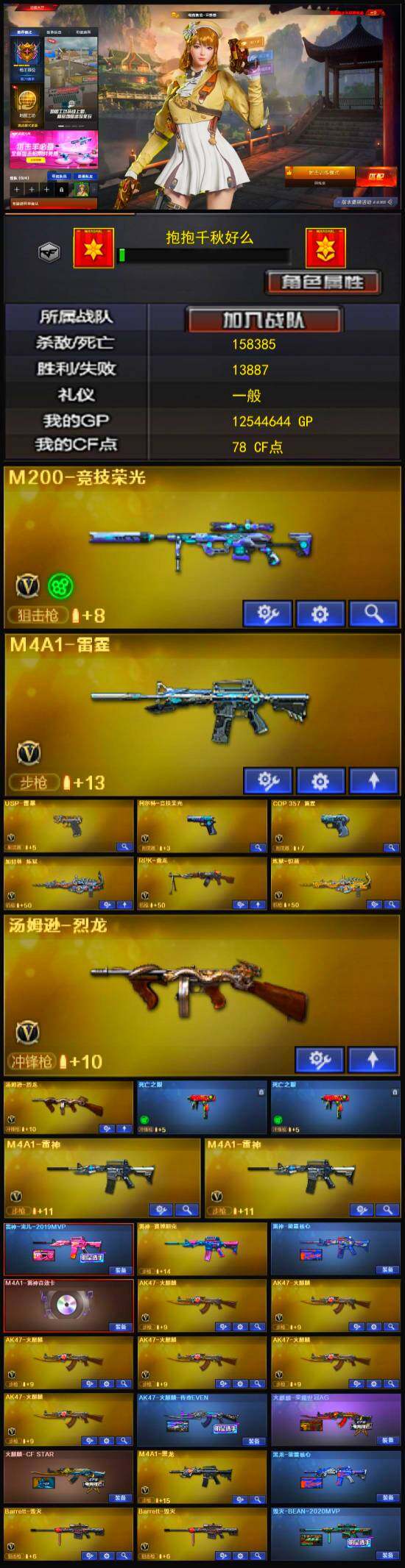 【热门武器】:M200-竞技荣光,死亡之眼*2,荣耀世冠-雷神,汤姆逊-烈龙*2,RPK-盘龙,加特林-炼狱,USP-雷暴,沙鹰-修罗*4