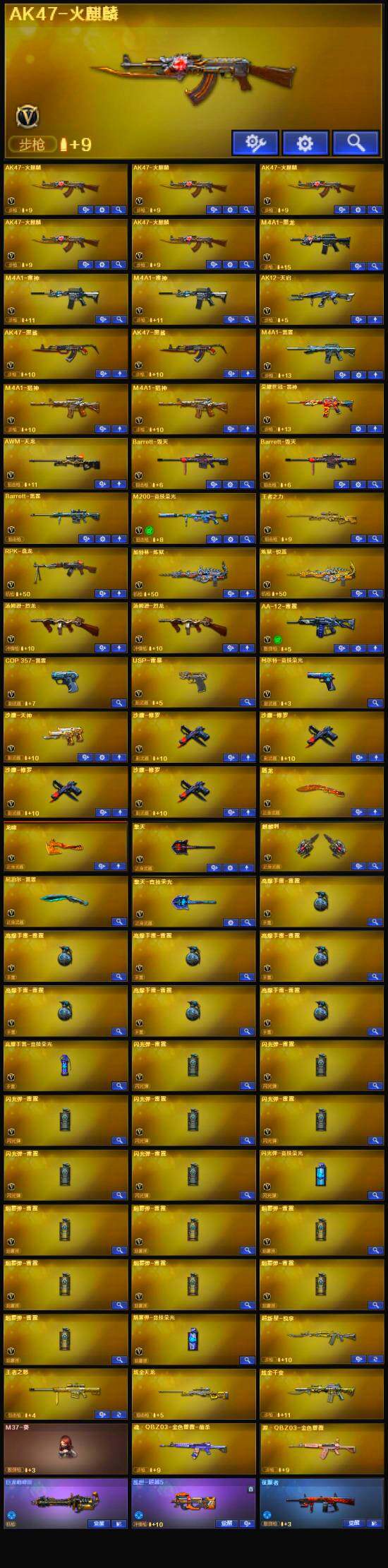 【英雄级武器】:AK47-火麒麟*6,M4A1-黑龙,M4A1-雷神*2,AK12-天启,AK47-黑鲨*2,M4A1-雷霆,M4A1-猎神*2,荣耀世冠-雷神,AWM-天龙,Barrett-毁灭*2,M200-竞技荣光,王者之力-觉醒版,RPK-盘龙,加特林-炼狱,炼狱-悦蓝-觉醒版,汤姆逊-烈龙*2,AA-12-雷霆,沙鹰-修罗*4,沙鹰-天神,USP-雷暴,雷霆之契,柯尔特-竞技荣光,屠龙,龙啸,擎天,麒麟刺,擎天-竞技荣光,高爆手雷-雷霆*7,高爆手雷-竞技荣光,闪光弹-雷霆*7,闪光弹-竞技荣光,烟雾弹-雷霆*7,烟雾弹-竞技荣光,M4A1-赤狱骑士