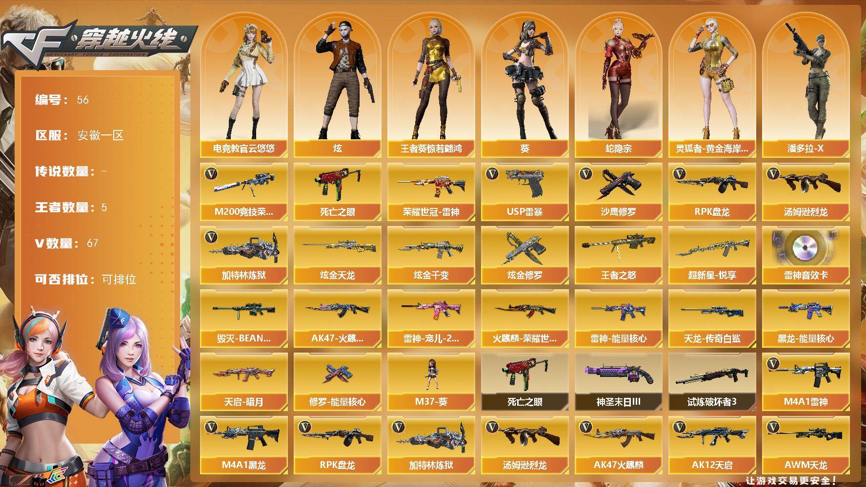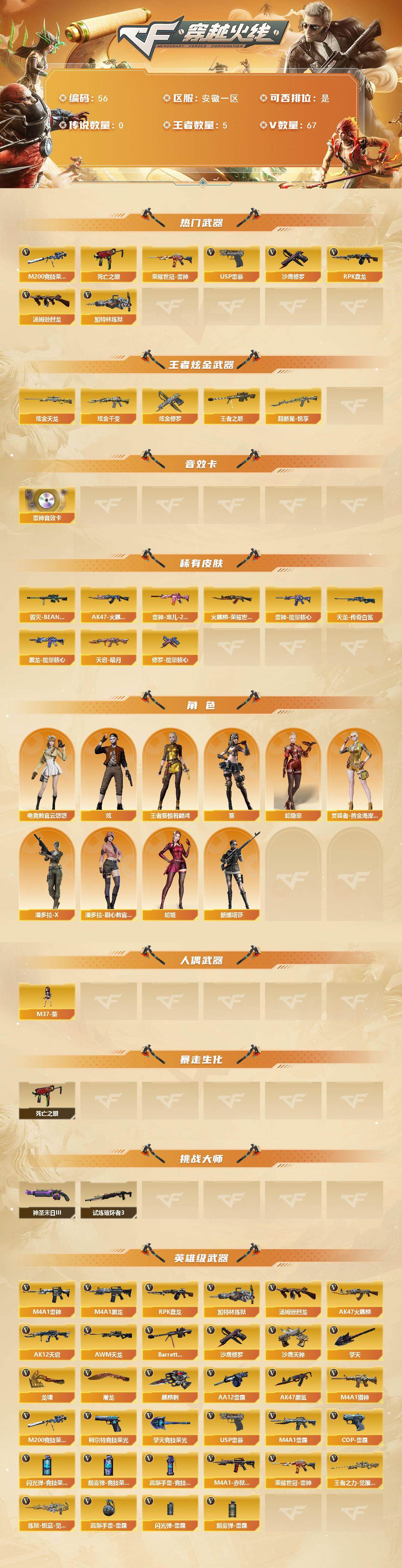 [13791745]安徽一区-67V-5王者-3炫金 【热门武器】:M200-竞技荣光,死亡之眼*2,荣耀世冠-雷神,汤姆逊-烈龙*2,RPK-盘龙,加特林-炼狱,USP-雷暴,沙鹰-修罗*4 【王者炫金武器】:超新星-悦享,王者之怒,炫金千变,炫金天龙,炫金修罗 【音效卡】:M4A1-雷神音效卡 【皮肤】:雷神-能量核心,雷神-宠儿-2019MVP,AK47-火麒麟-传奇EVEN,火麒麟-荣耀世冠AG,毁灭-BEAN-2020MVP,黑龙-能量核心,天启-暗月,AWM-天龙-传奇白鲨,修罗-能量核心 【角色】:葵,炫,电竞教官-云悠悠,王者葵-惊若翩鸿,蛇隐宗,灵狐者-黄金海岸,潘多拉-X,潘多拉-甜心教官,蛇姬,新娜塔莎 【人偶武器】:M37-葵 【暴走生化】:死亡之眼*2 【挑战大师】:试炼破坏者III,神圣爆裂者-末日III 【英雄级武器】:AK47-火麒麟*6,M4A1-黑龙,M4A1-雷神*2,AK12-天启,AK47-黑鲨*2,M4A1-雷霆,M4A1-猎神*2,荣耀世冠-雷神,AWM-天龙,Barrett-毁灭*2,M200-竞技荣光,王者之力-觉醒版,RPK-盘龙,加特林-炼狱,炼狱-悦蓝-觉醒版,汤姆逊-烈龙*2,AA-12-雷霆,沙鹰-修罗*4,沙鹰-天神,USP-雷暴,雷霆之契,柯尔特-竞技荣光,屠龙,龙啸,擎天,麒麟刺,擎天-竞技荣光,高爆手雷-雷霆*7,高爆手雷-竞技荣光,闪光弹-雷霆*7,闪光弹-竞技荣光,烟雾弹-雷霆*7,烟雾弹-竞技荣光,M4A1-赤狱骑士 【道具】:Q9战队炫彩背包,炫彩背包,救世主-黑桃战神,绿色巨人,灵魂忍者,变异宝贝,迷雾幽灵,夺命之镰,防化服*2,枪王排位29赛季金色流光,防弹头盔*2,防弹衣*2,C4工具钳*2,手雷包*2 【特殊枪械】:2烈龙,1盘龙,1炼狱
