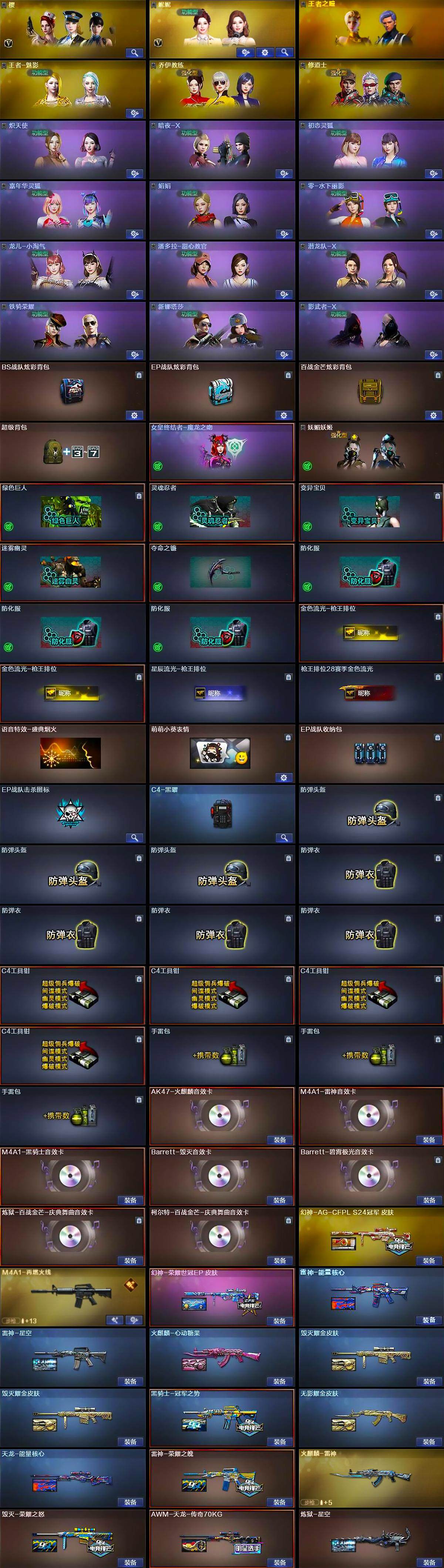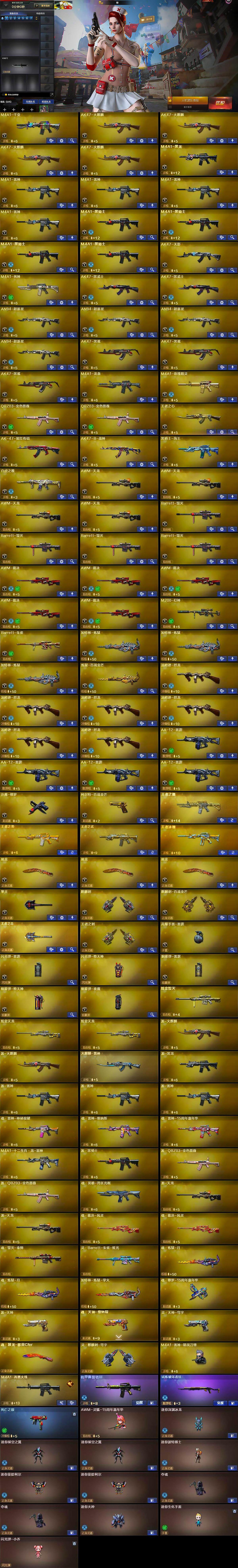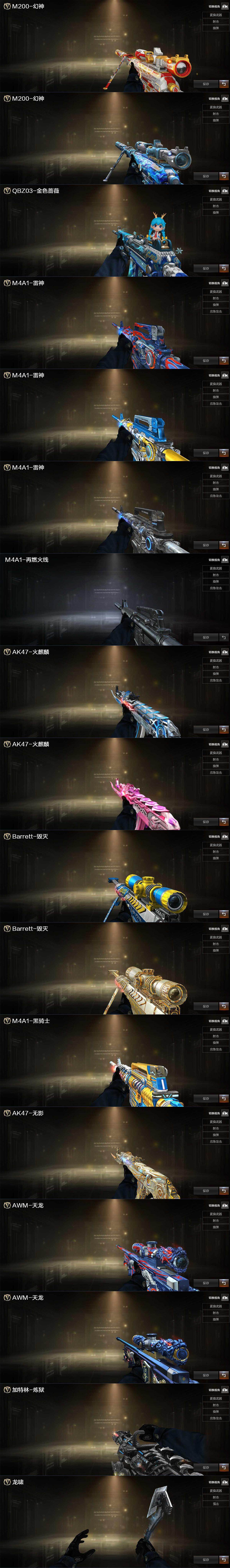 【英雄级武器】:M4A1-千变,AK47-火麒麟*4,M4A1-黑龙,M4A1-雷神*4,M4A1-黑骑士*4,AK47-无影,M4A1-死神,AK47-黑武士*2,AN94-超新星*4,AK47-黑鲨*3,M4A1-龙血,M4A1-玫瑰精灵,QBZ03-金色蔷薇*2,王者之心-觉醒版,AK-47-猩红传说,AK47-B-战神,黑骑士-海王,白虎之魄-觉醒版,AWM-天龙*4,Barrett-毁灭*4,AWM-裁决*5,M200-幻神,Barrett-朱雀,加特林-炼狱*3,炼狱-百战金芒,汤姆逊-烈龙*6,AA-12-雷霆*4,沙鹰-修罗,柯尔特-荣耀世冠EP,柯尔特-百战金芒,屠龙*3,擎天,麒麟刺,麒麟刺-百战金芒,王者之击-觉醒版,王者之刺-觉醒