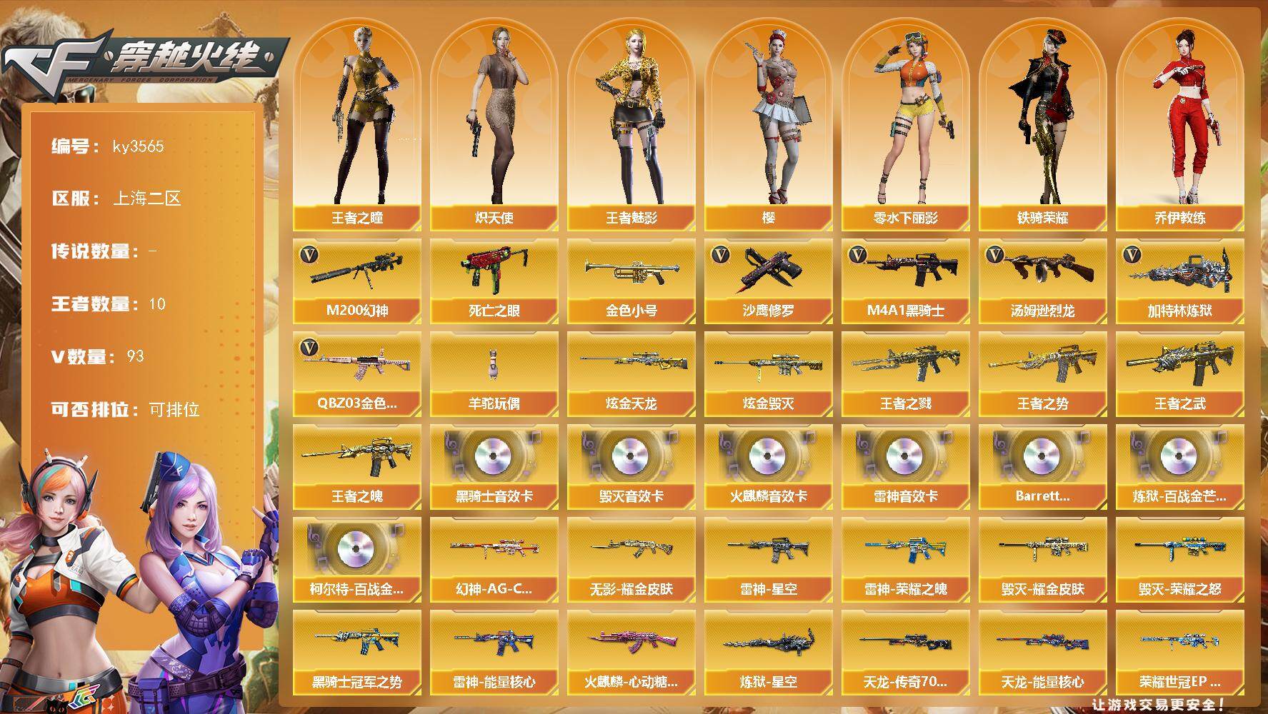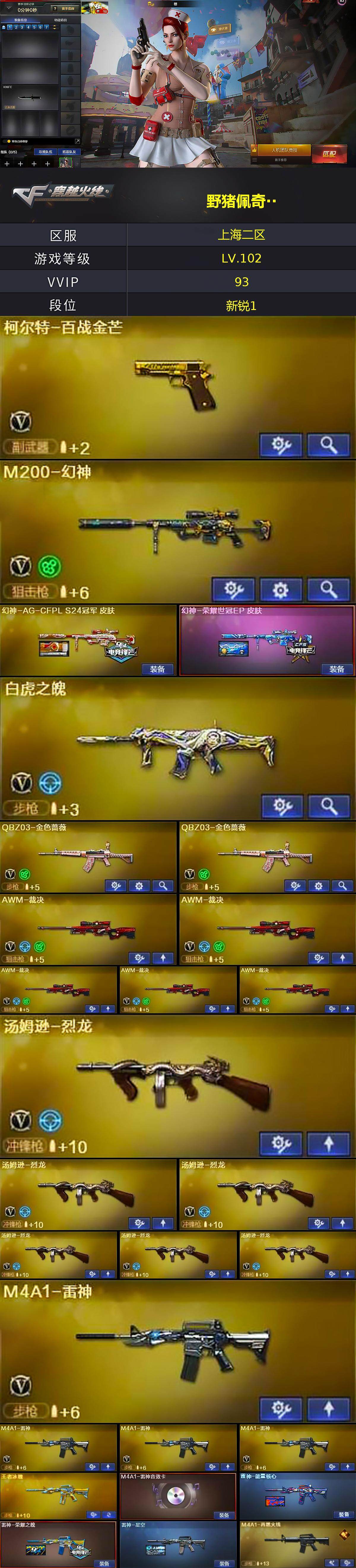 [13818925]上海二区-93V-10王者-3炫金 【热门武器】:QBZ03-金色蔷薇*2,M200-幻神,死亡之眼,金色小号,M4A1-黑骑士*4,汤姆逊-烈龙*6,加特林-炼狱*3,羊驼玩偶*3,沙鹰-修罗 【王者炫金武器】:王者之戮,王者之势,王者之武,王者之魄,炫金毁灭,炫金天龙*2 【音效卡】:AK47-火麒麟音效卡,M4A1-雷神音效卡,M4A1-黑骑士音效卡,Barrett-毁灭音效卡,Barrett-碧霄极光音效卡,炼狱-百战金芒-庆典舞曲音效卡,柯尔特-百战金芒-庆典舞曲音效卡 【皮肤】:幻神-AG-CFPL S24冠军 皮肤,幻神-荣耀世冠EP 皮肤,QBZ03-荣耀世冠EP 皮肤,金色蔷薇-电竞之星 皮肤,雷神-能量核心,雷神-荣耀之魄,雷神-星空,M4A1-再燃火线,火麒麟-雷神,火麒麟-心动糖果,毁灭-荣耀之怒,毁灭耀金皮肤*2,黑骑士-冠军之势,无影耀金皮肤,天龙-能量核心,AWM-天龙-传奇70KG,炼狱-星空,轻型军用手斧-再燃火线 【角色】:樱,妮妮,王者之瞳,王者-魅影,乔伊教练,修道士,炽天使,暗夜-X,初恋灵狐,嘉年华灵狐,娟娟,兰-新年限定,零-水下丽影,龙儿-小淘气,潘多拉-甜心教官,潜龙队-X,铁骑荣耀,兔囡囡,新娜塔莎,影武者-X 【人偶武器】:M4A1-雷神-精英刀锋,AWM-灵狐-15周年嘉年华,迷你深渊冰龙,迷你裂空之翼*2,迷你波特博士,迷你曼提柯尔*2,夺魂*2,迷你火种,迷你生化手雷,闪光弹-小乔 【暴走生化】:死亡之眼 【挑战大师】:机甲撕裂者III,试炼破坏者III 【英雄级武器】:M4A1-千变,AK47-火麒麟*4,M4A1-黑龙,M4A1-雷神*4,M4A1-黑骑士*4,AK47-无影,M4A1-死神,AK47-黑武士*2,AN94-超新星*4,AK47-黑鲨*3,M4A1-龙血,M4A1-玫瑰精灵,QBZ03-金色蔷薇*2,王者之心-觉醒版,AK-47-猩红传说,AK47-B-战神,黑骑士-海王,白虎之魄-觉醒版,AWM-天龙*4,Barrett-毁灭*4,AWM-裁决*5,M200-幻神,Barrett-朱雀,加特林-炼狱*3,炼狱-百战金芒,汤姆逊-烈龙*6,AA-12-雷霆*4,沙鹰-修罗,柯尔特-荣耀世冠EP,柯尔特-百战金芒,屠龙*3,擎天,麒麟刺,麒麟刺-百战金芒,王者之击-觉醒版,王者之刺-觉醒