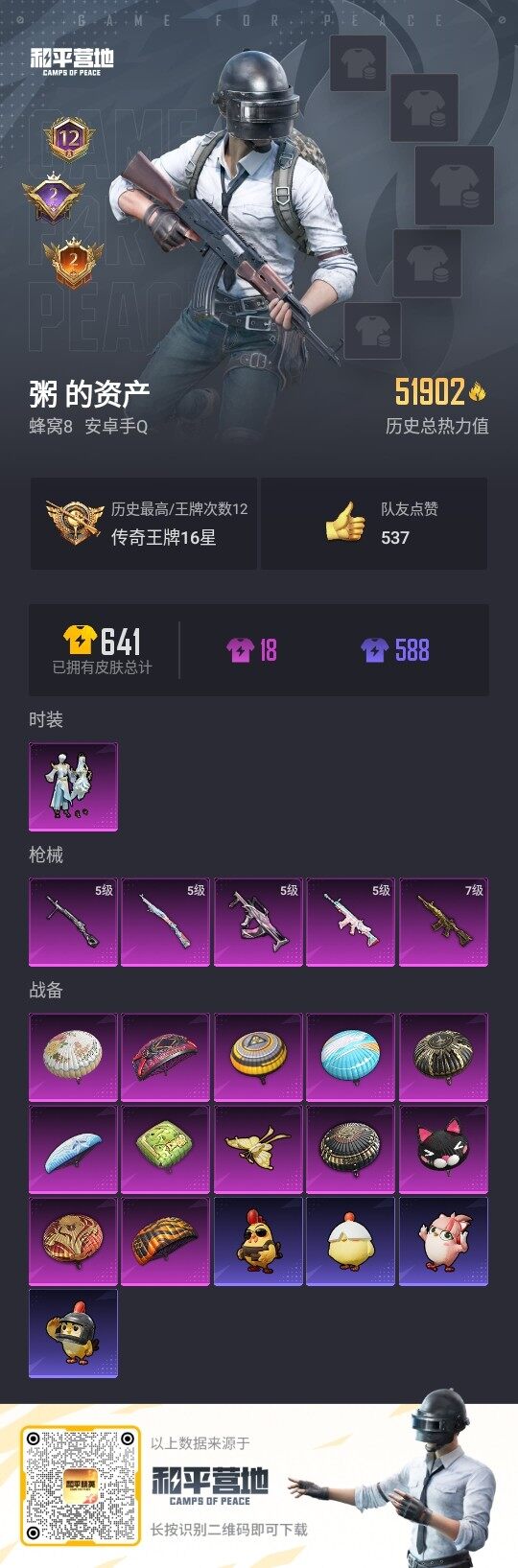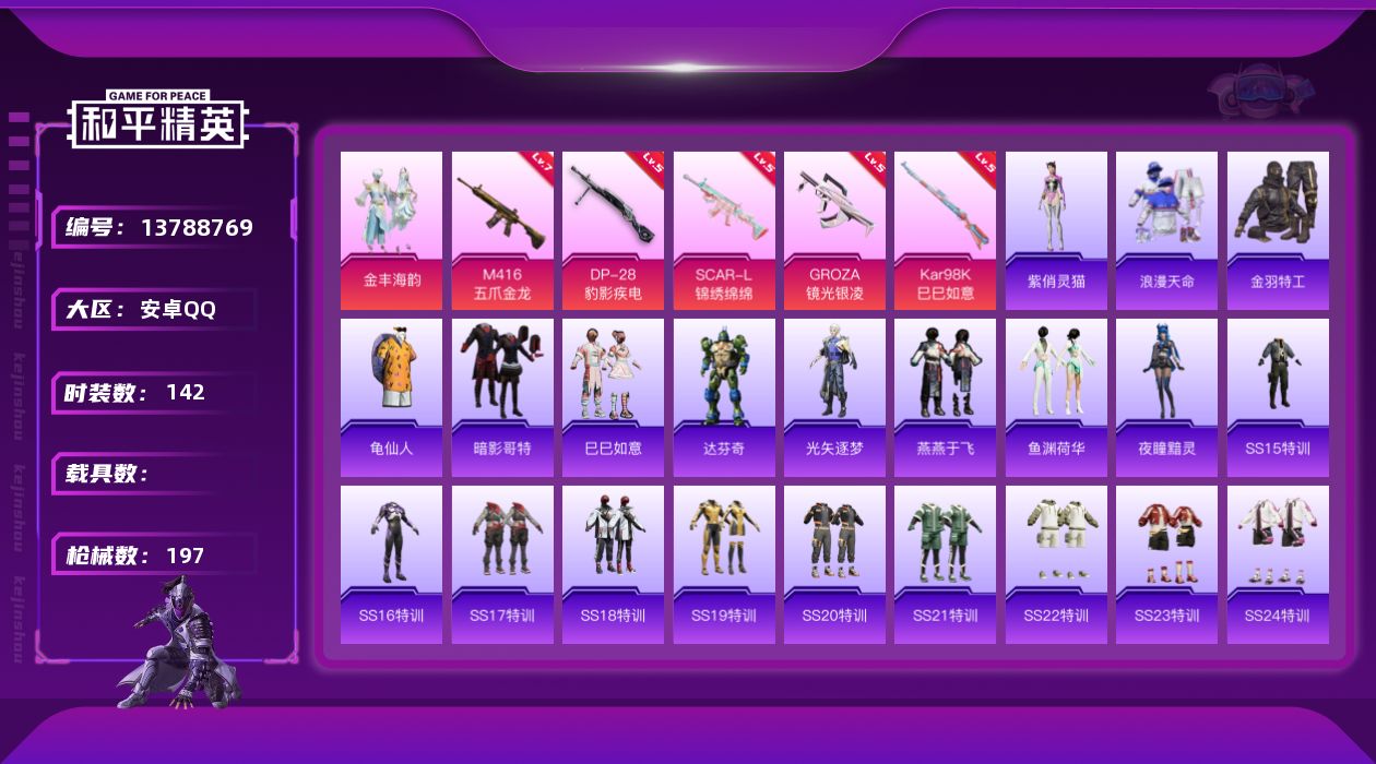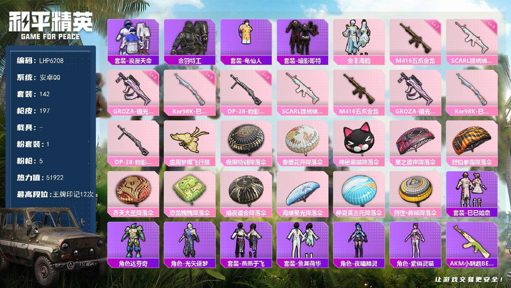 [13788769]【店主推荐捡漏号!可直接换绑】 安卓 手Q-1粉装-5特效枪-1粉色飞行器-5.1w热力值-12王牌印记-142套装-197枪皮【热门品类】:套装-浪漫天命,套装-金羽特工,套装-龟仙人,套装-暗影哥特【粉色套装】:粉装-金丰海韵【粉色枪皮等级】:SCAR-L-锦绣绵绵(五级),M416-五爪金龙(七级),GROZA-镜光银凌(五级),Kar98K-巳巳如意(五级),DP-28-豹影疾电(五级)【粉色飞行器】:庄周梦蝶飞行器