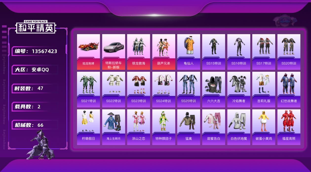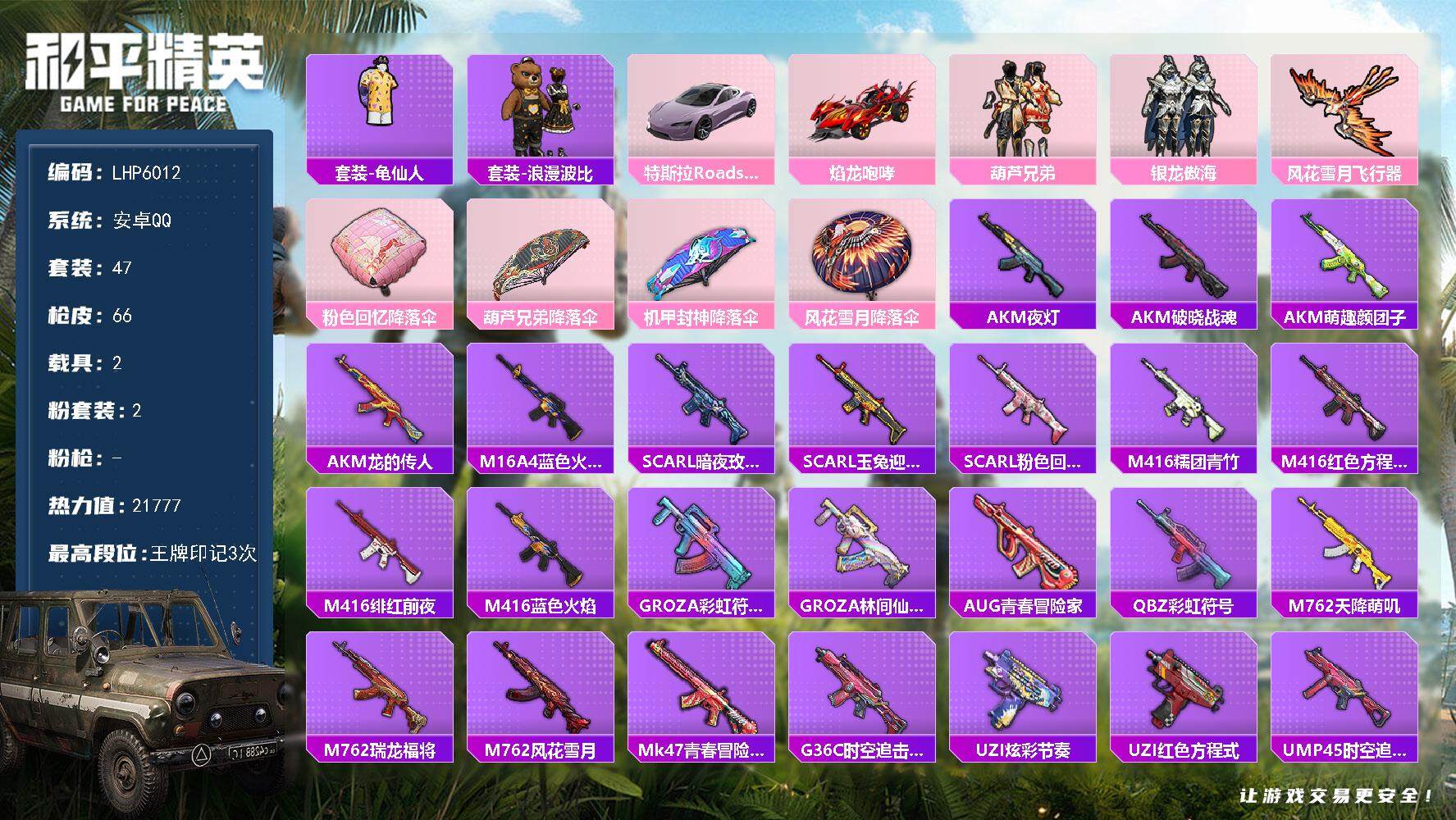 [13567423]【店主推荐捡漏号!可直接换绑】安卓 手Q-2粉装-2载具-1粉色飞行器-2.1w热力值-3王牌印记-47套装-66枪皮【热门品类】:套装-龟仙人,套装-浪漫波比【粉色载具】:特斯拉Roadster(沁心粉),焰龙咆哮【粉色套装】:粉装-葫芦兄弟,粉装-银龙傲海【粉色飞行器】:风花雪月飞行器