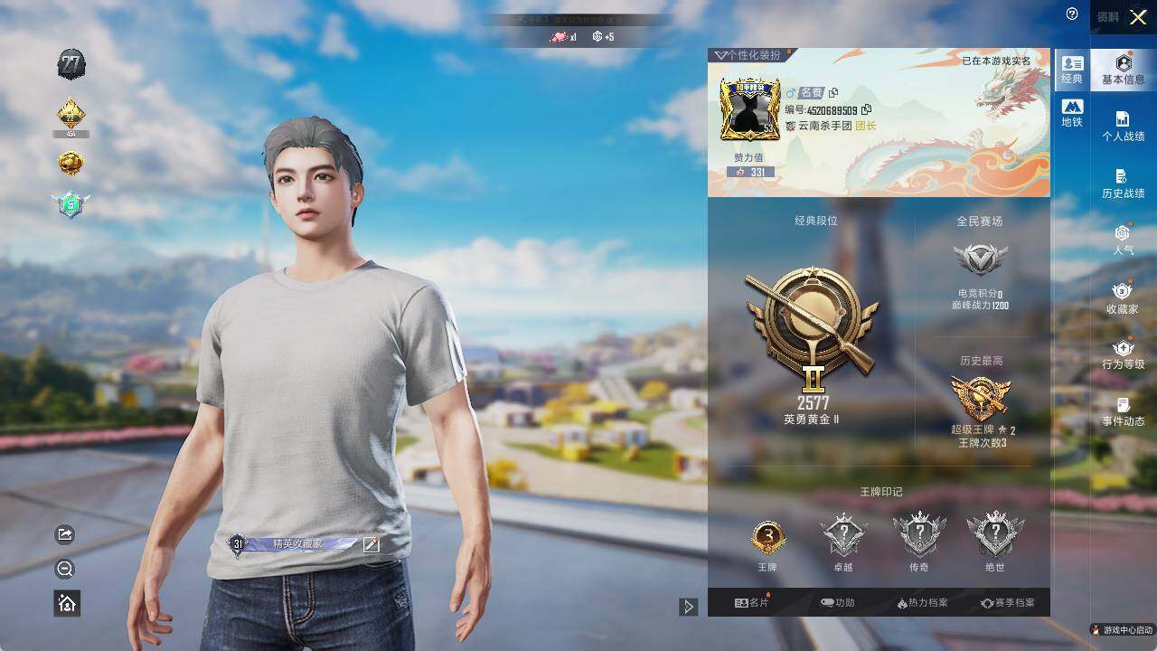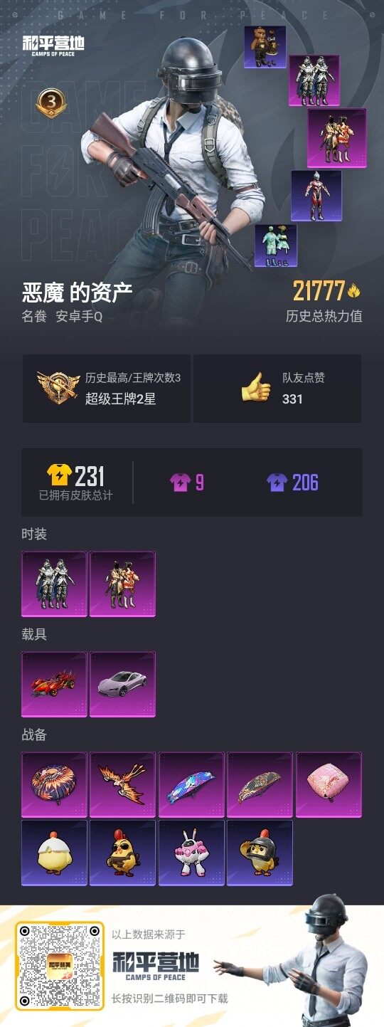 - [10197101]实名: 可修改 时装数: 314 枪械数: 94 战备数: 64 热门装扮: 炙焰红王,冰霜白皇,童趣迷兔,山涧鹿灵,彩虹鹿灵,筑梦精灵,绚丽摇曳,闪耀律动,兔兔白日梦 稀有枪皮: DP-28幻梦音符